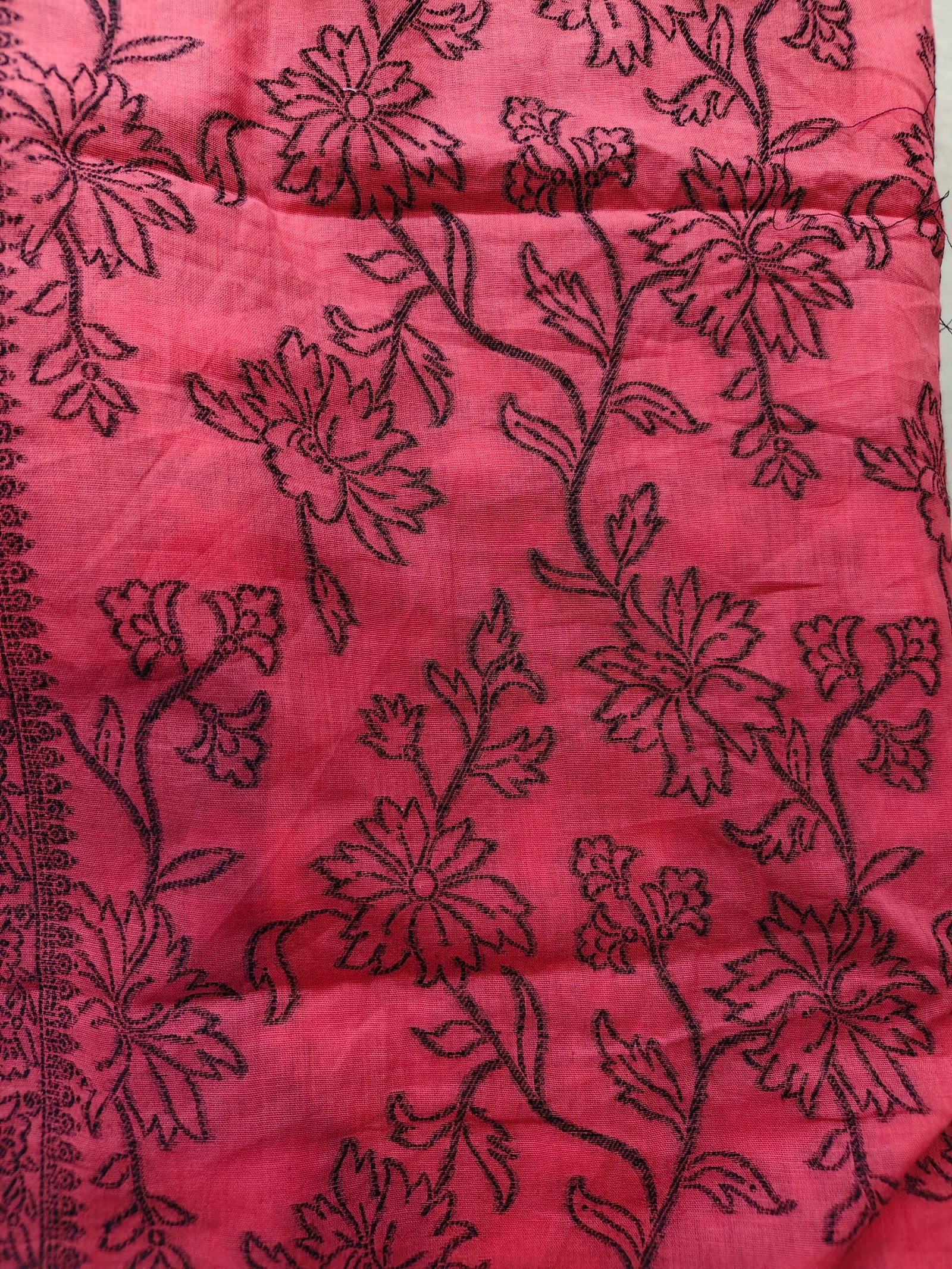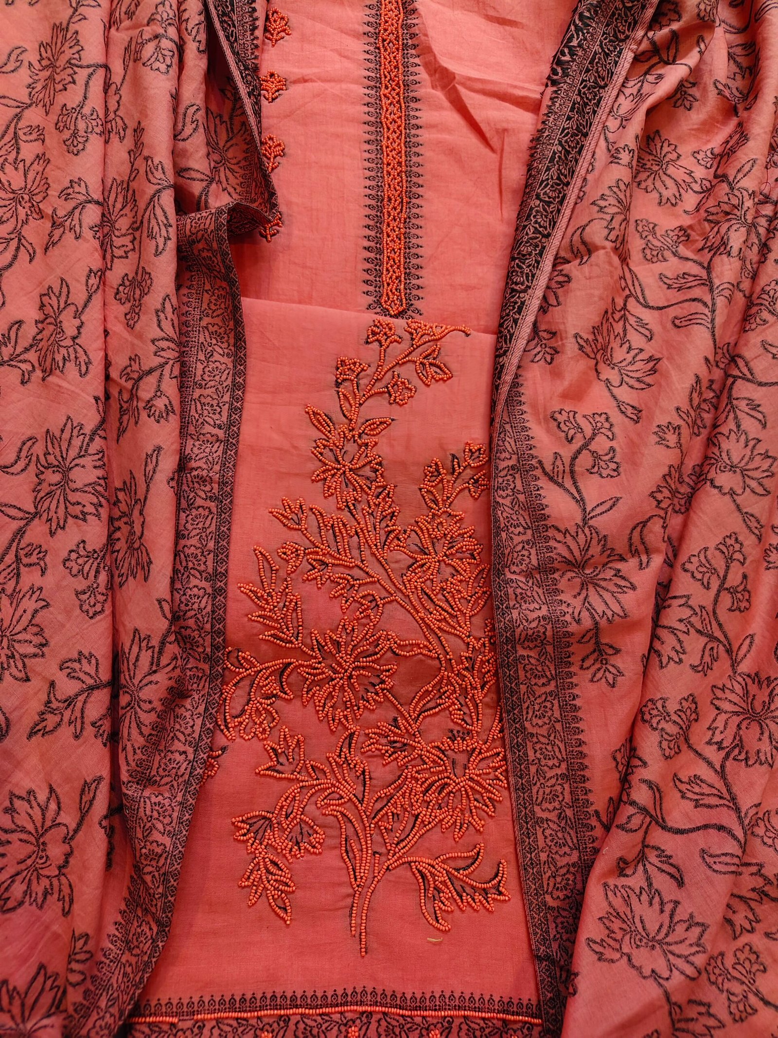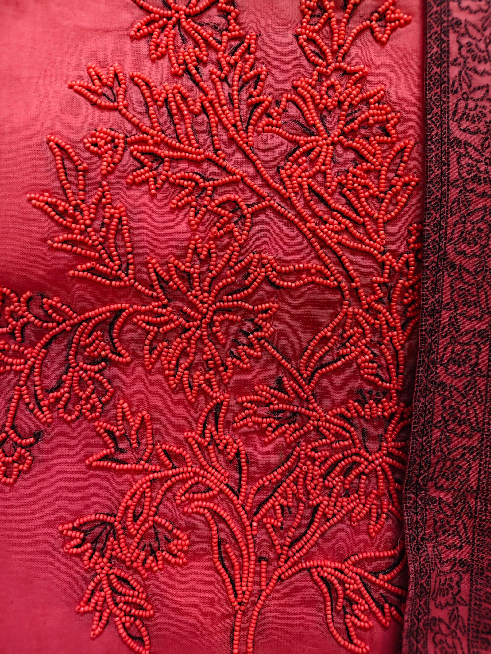 Cotton 3-piece suit with beads work on neckline and daaman. Duppata – weaved cotton. Bottom -cotton
