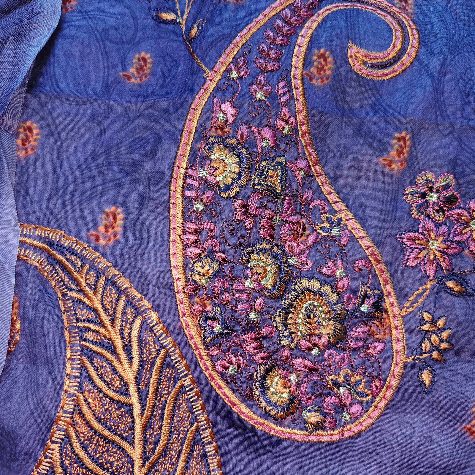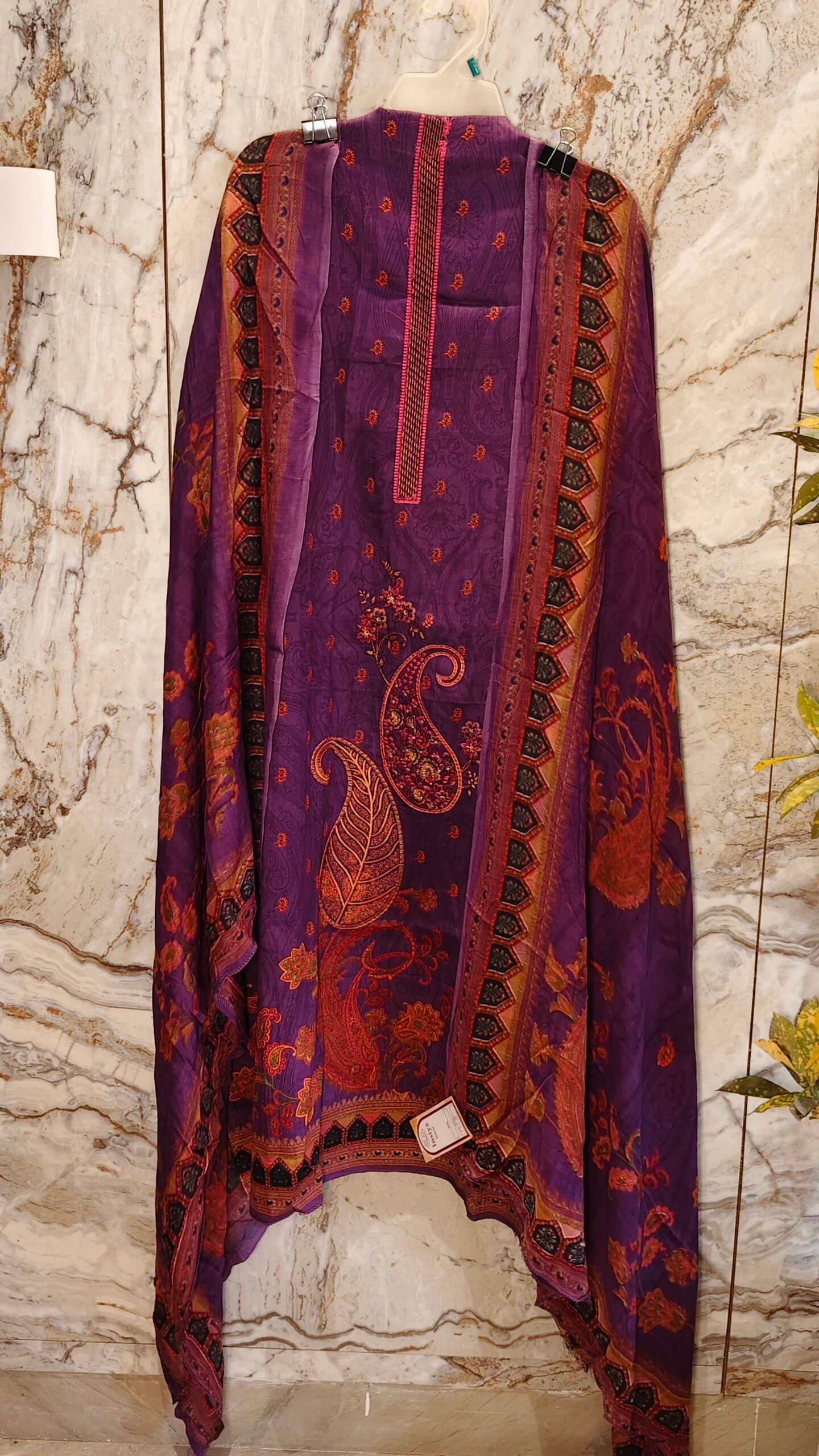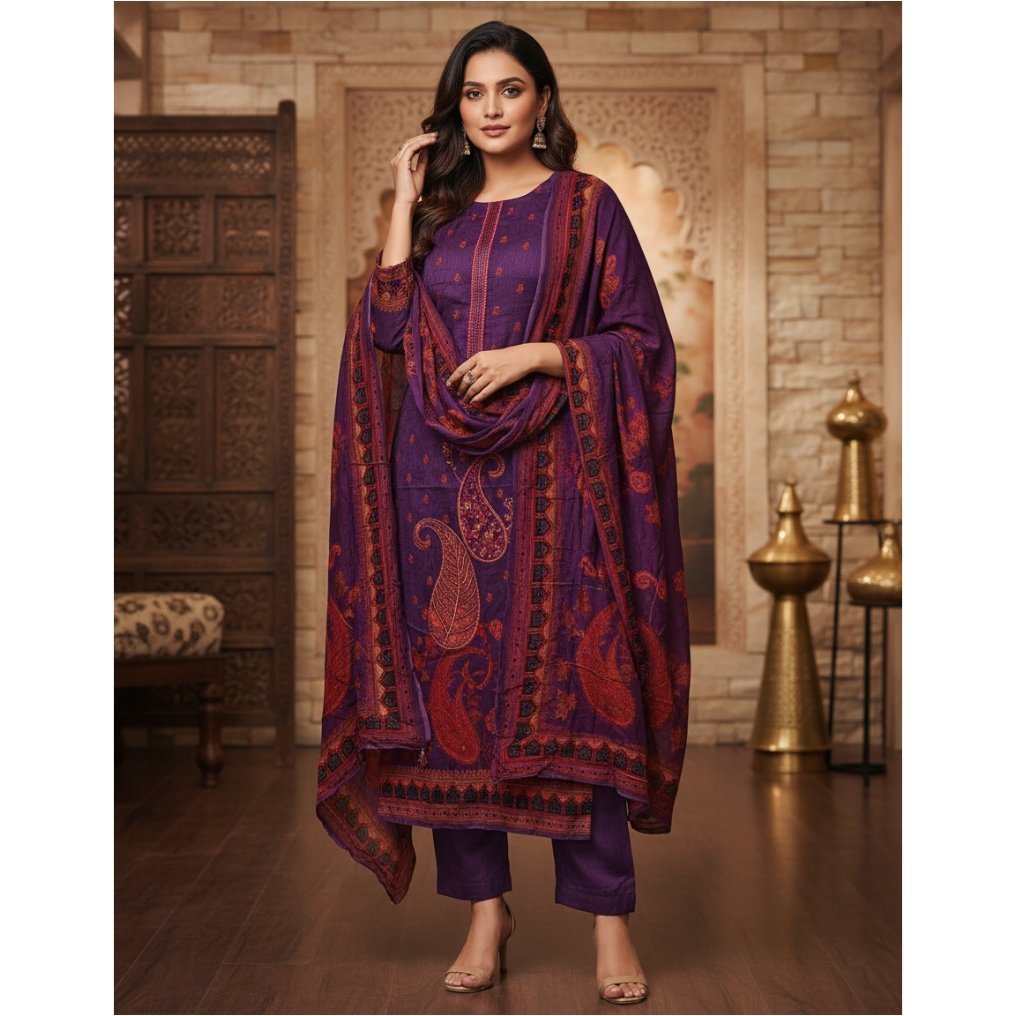Muslin 3-piece unstitched suit featuring elegant embroidery on the kurta—lightweight, breathable, and perfect for a graceful ethnic look.