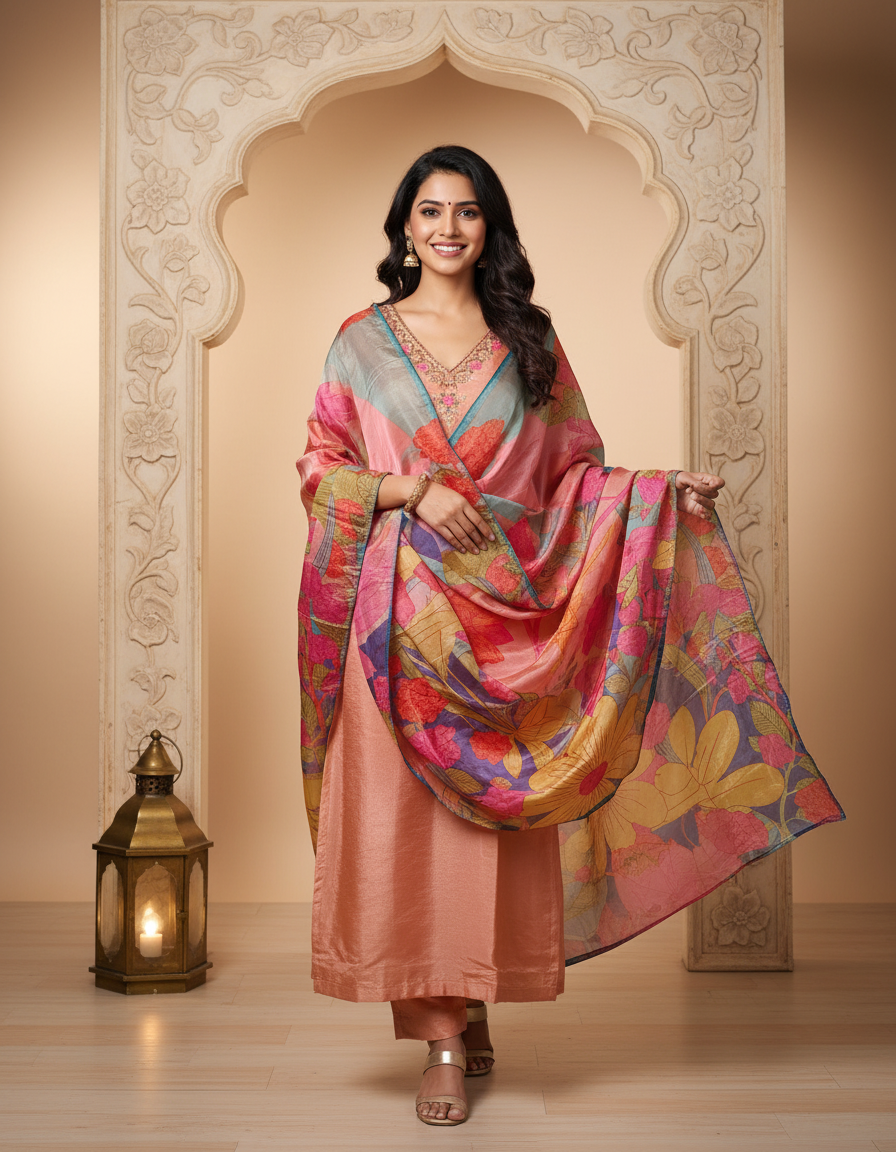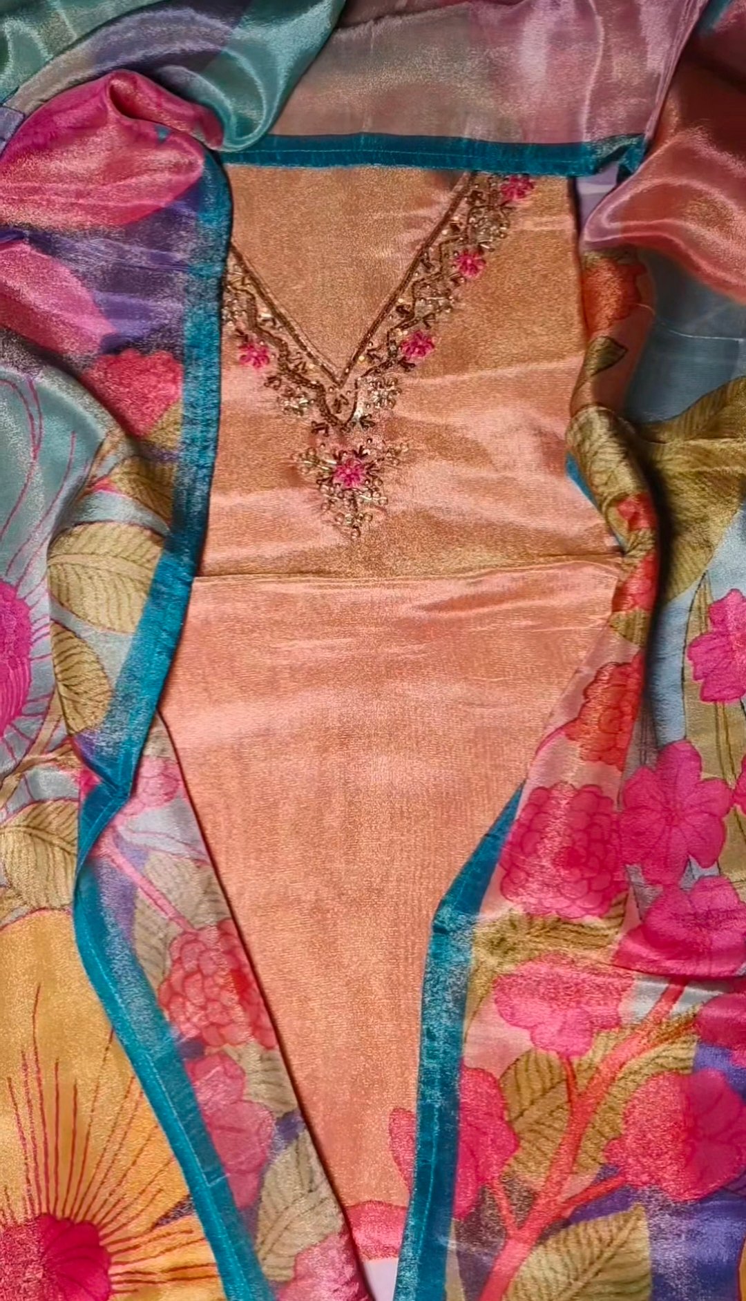 Modal silk shimmer fabric with sequence, nalki, dabka and hand thread work on neckline. Dupatta -Modal shimmer Bottom -Santoon