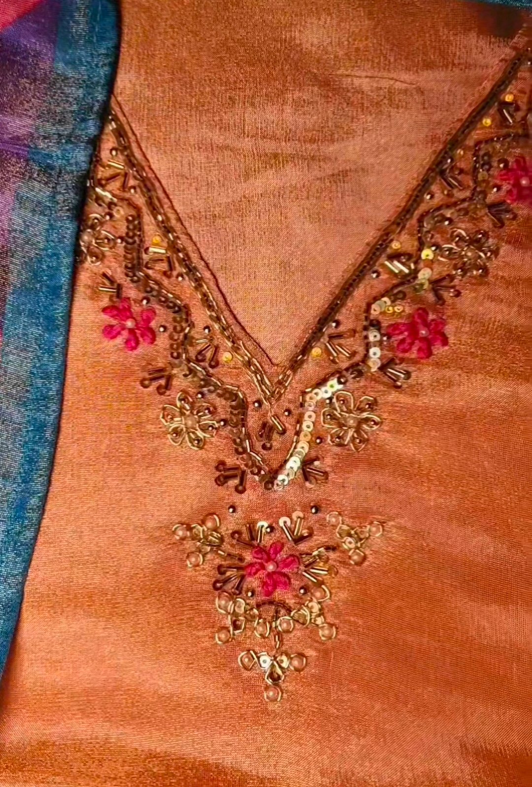 Modal silk shimmer fabric with sequence, nalki, dabka and hand thread work on neckline.
