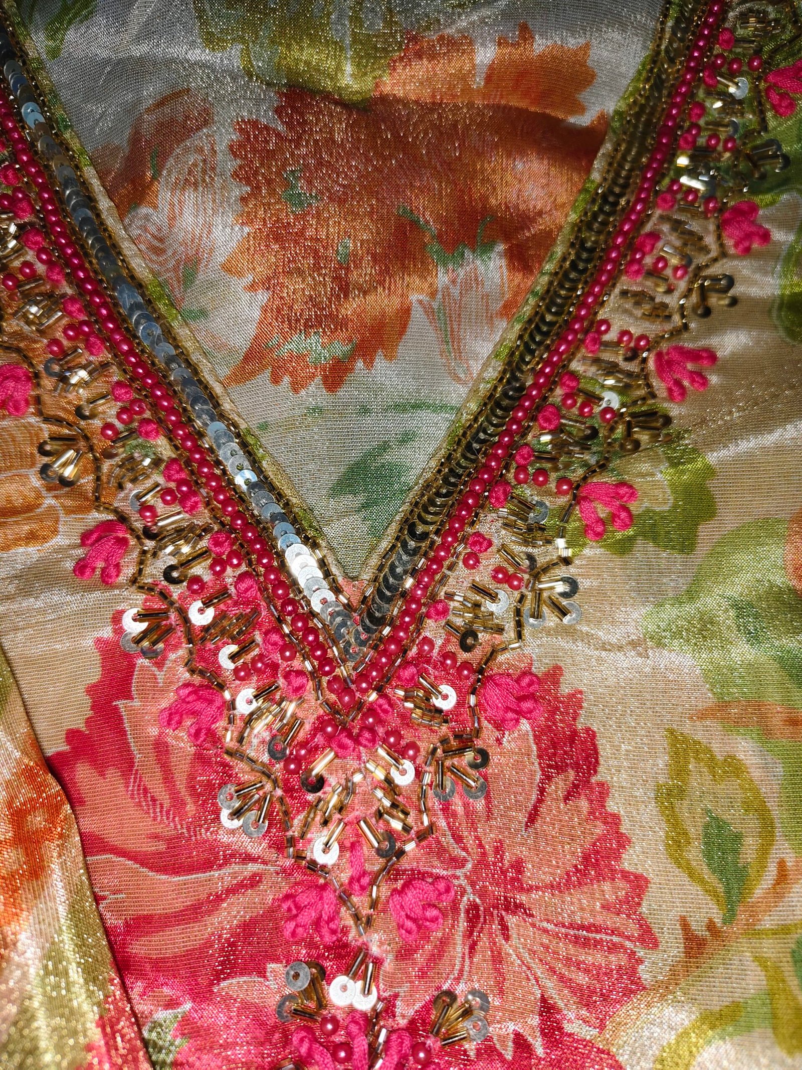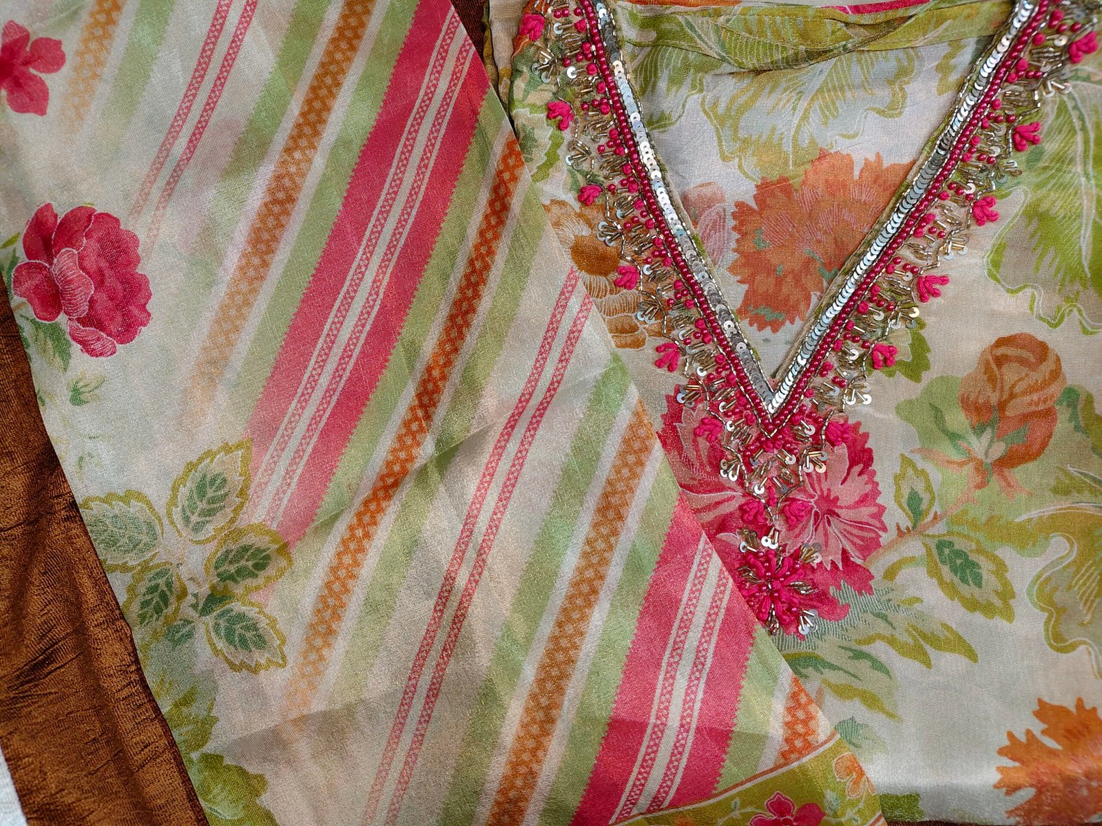 Modal shimmer silk fabric 3-piece suit with sequence, nalki, pearl,hand thread work on neckline.