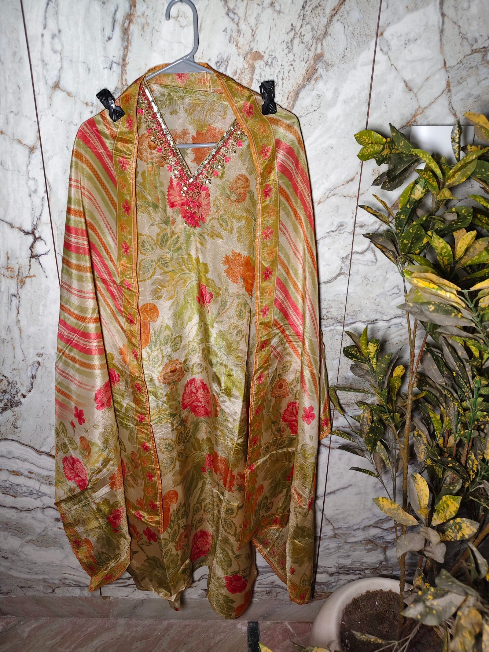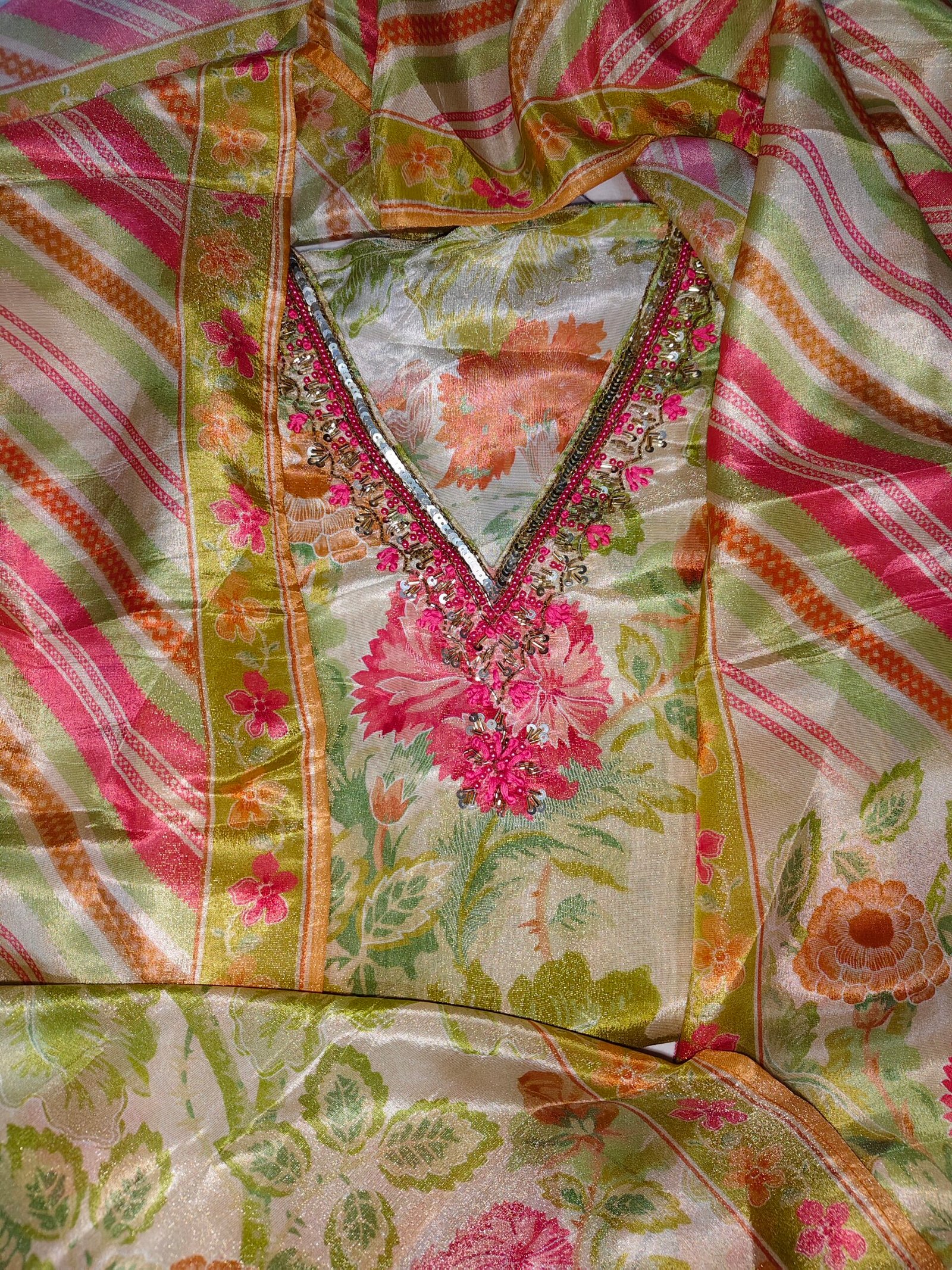 Modal shimmer silk fabric 3-piece suit with sequence, nalki, pearl,hand thread work on neckline. Dupatta -Modal shimmer Bottom -Santoon