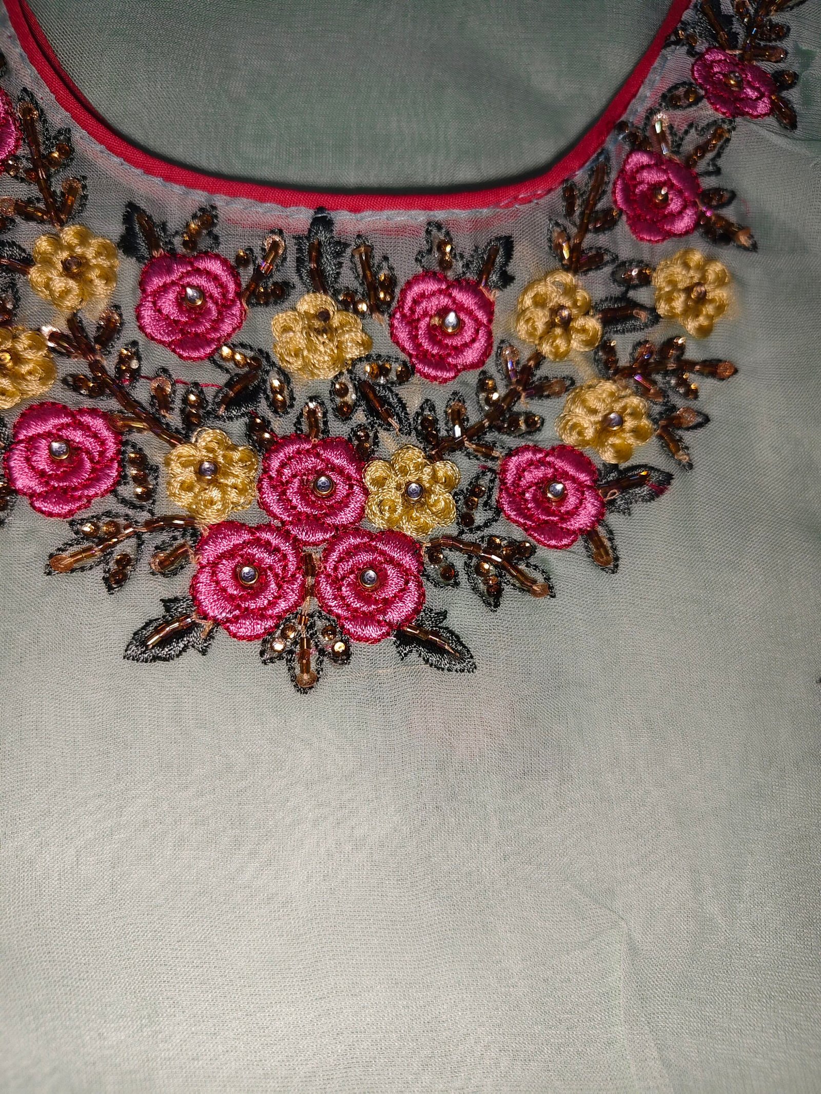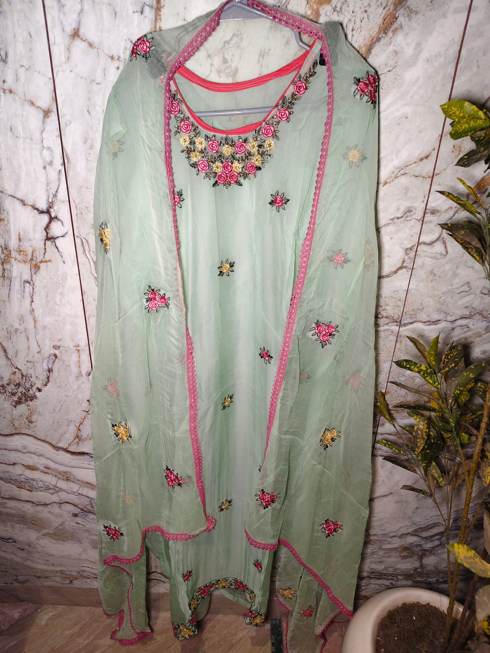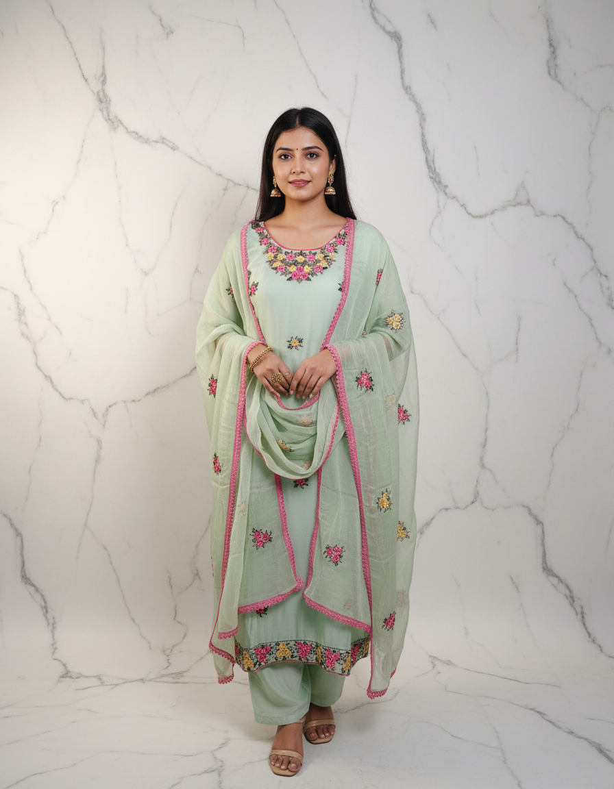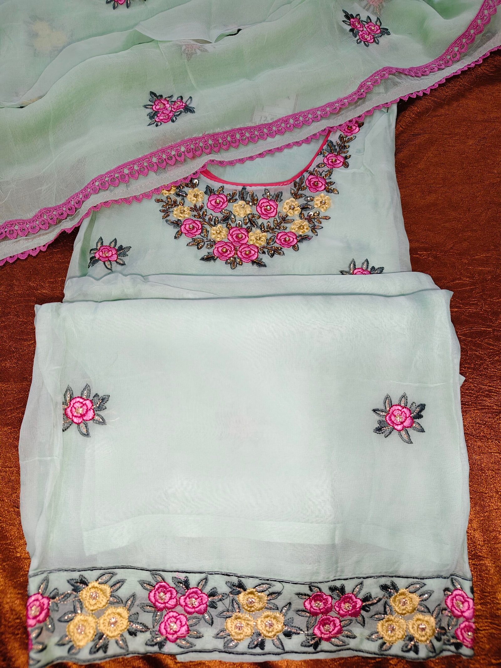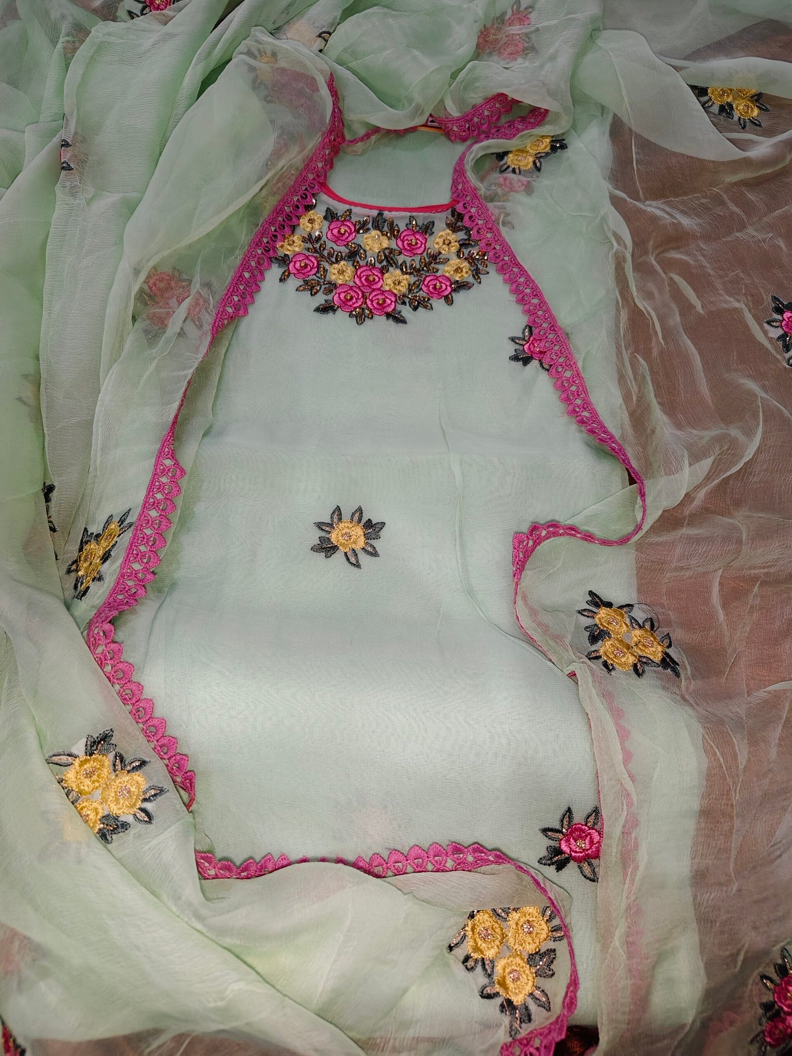 Organza suit 3 -piece suit with embroidery. Dupatta -pure chiffon with embroidery. Bottom -Santoon.