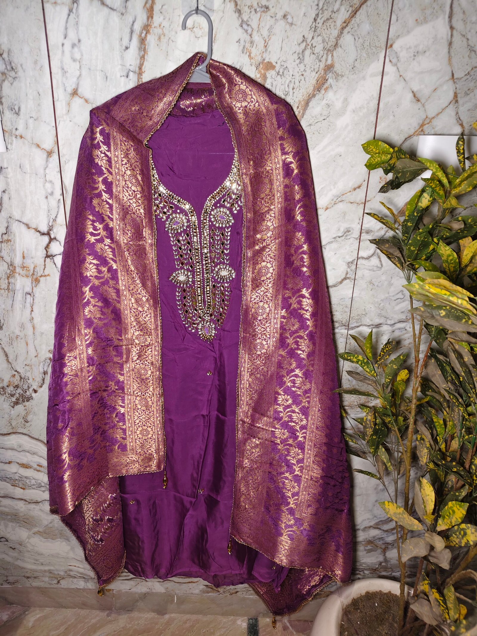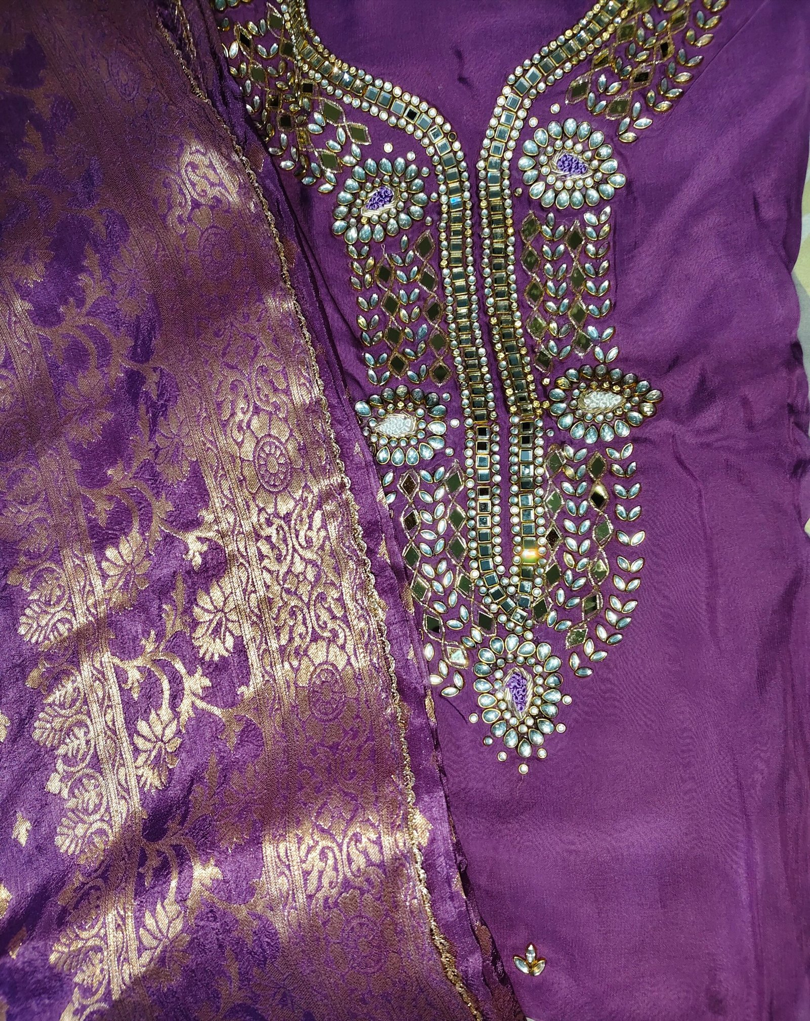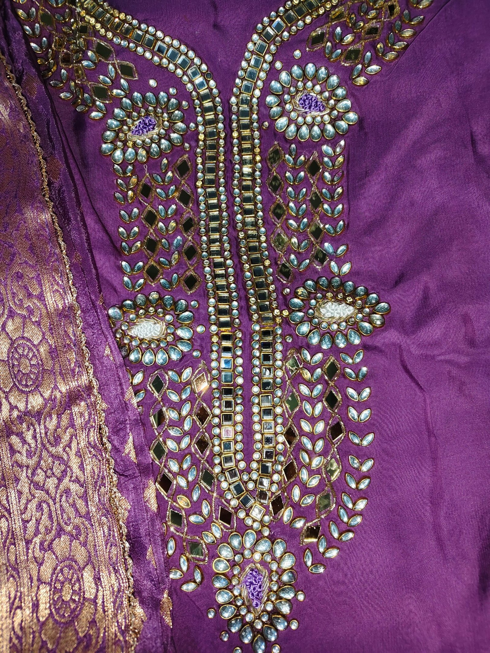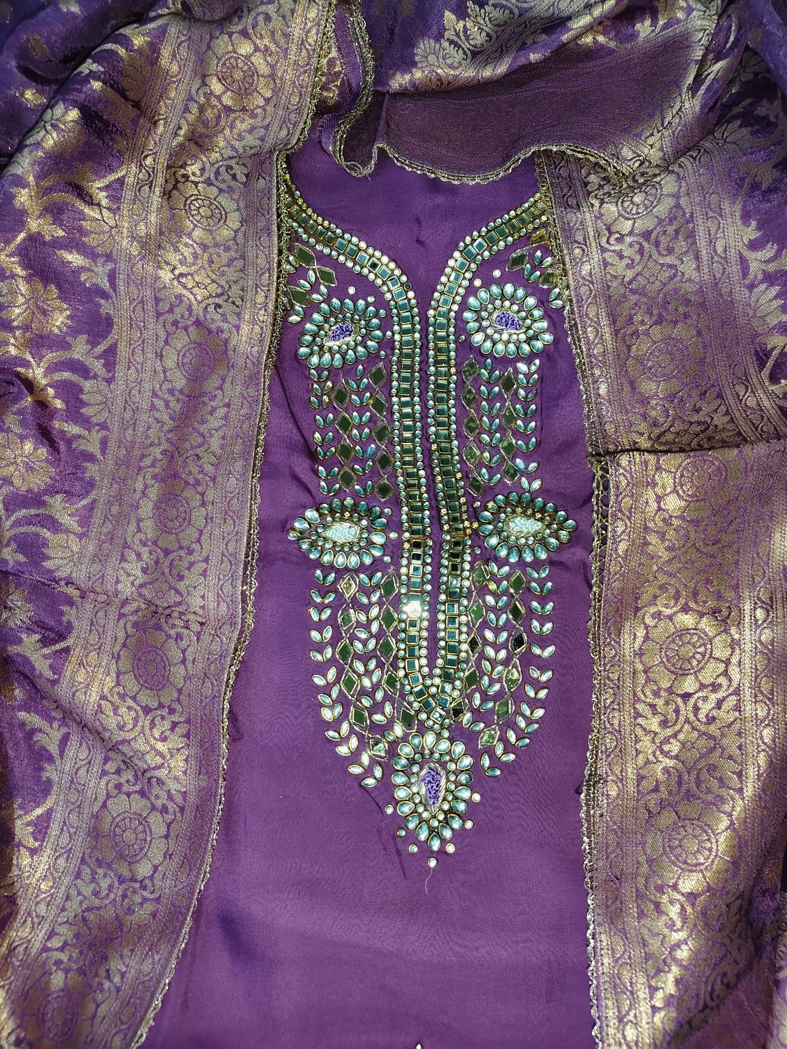 Organza 3-piece suit with kundan work on neckline. Dupatta -banarasi. Bottom -Santoon.