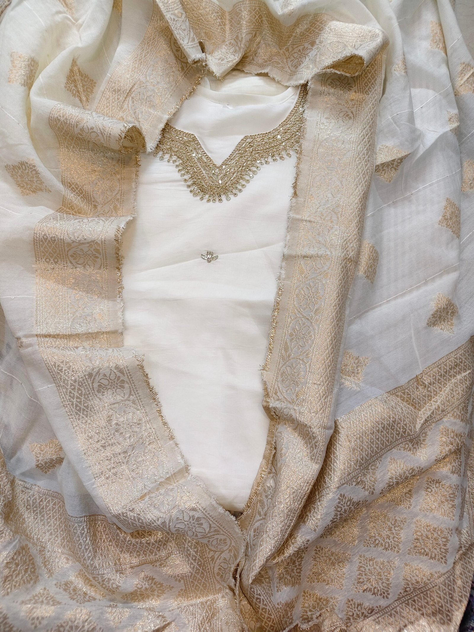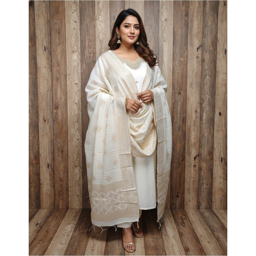 Roman silk 3 -piece suit with embroidery. Size – 40-42 inches Length – 42 inches Duppata -jakard