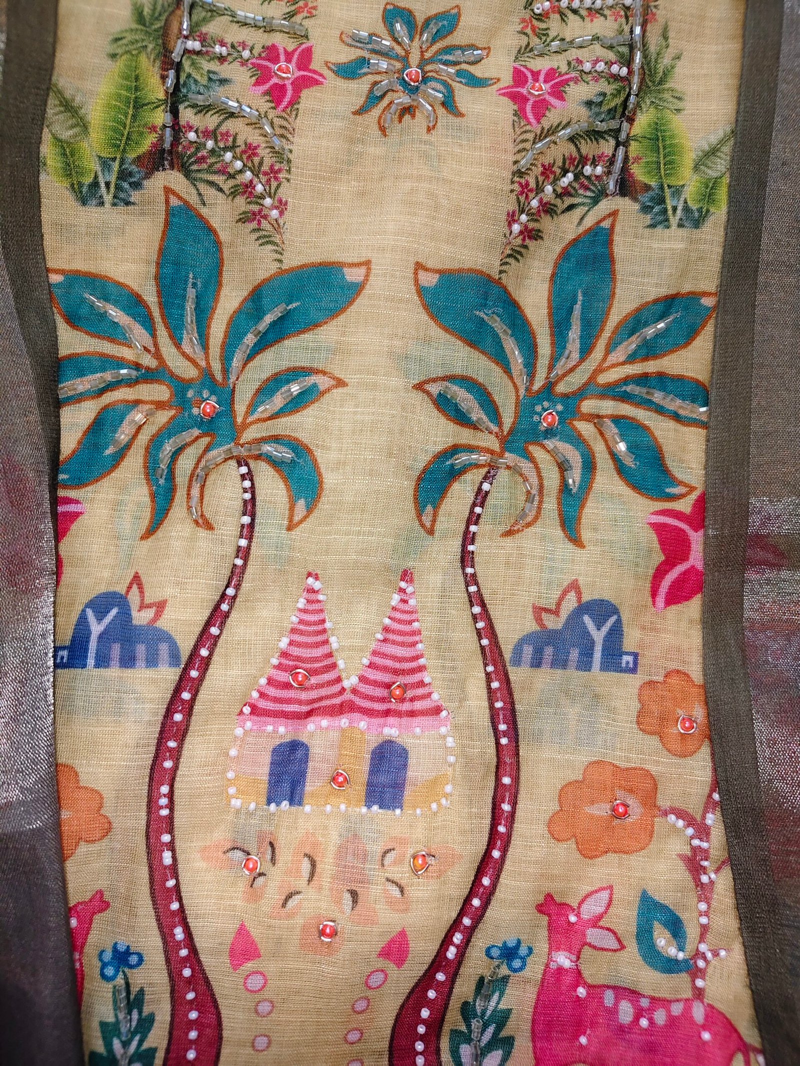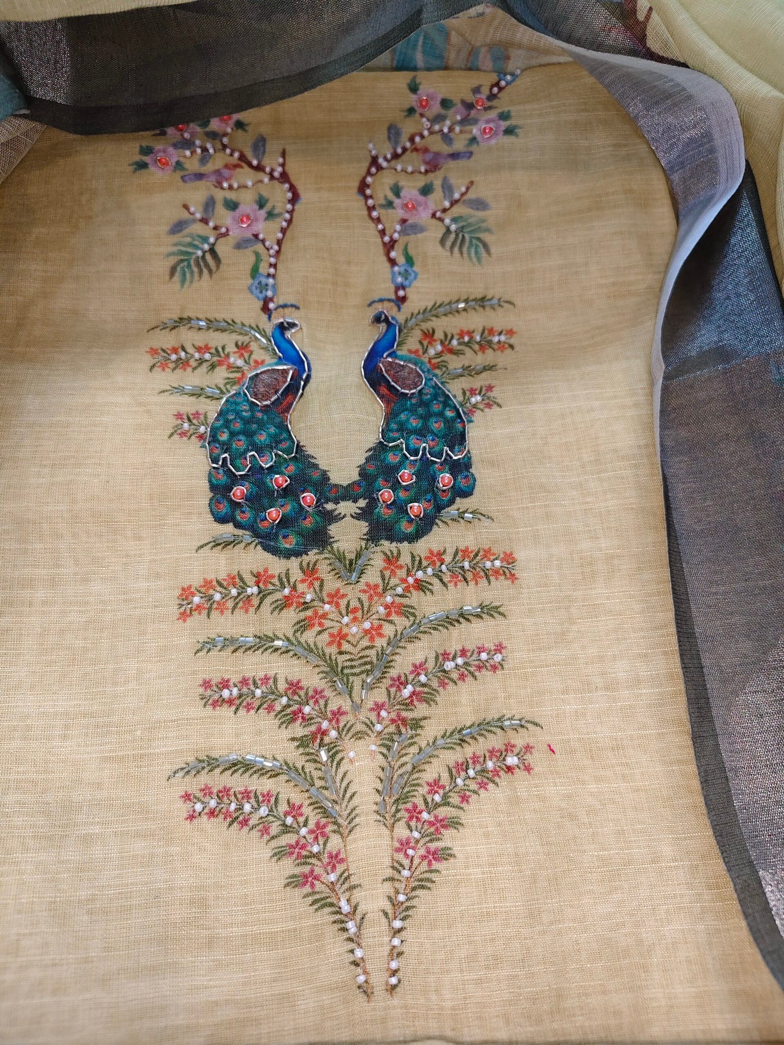 Linen cotton 3-piece suit with pearl hand work all over kurta. Bottom -Santoon