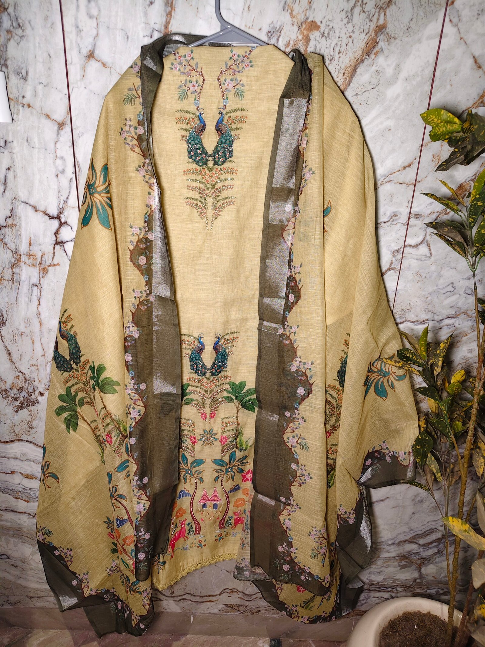 Linen cotton 3-piece suit with pearl hand work all over kurta.