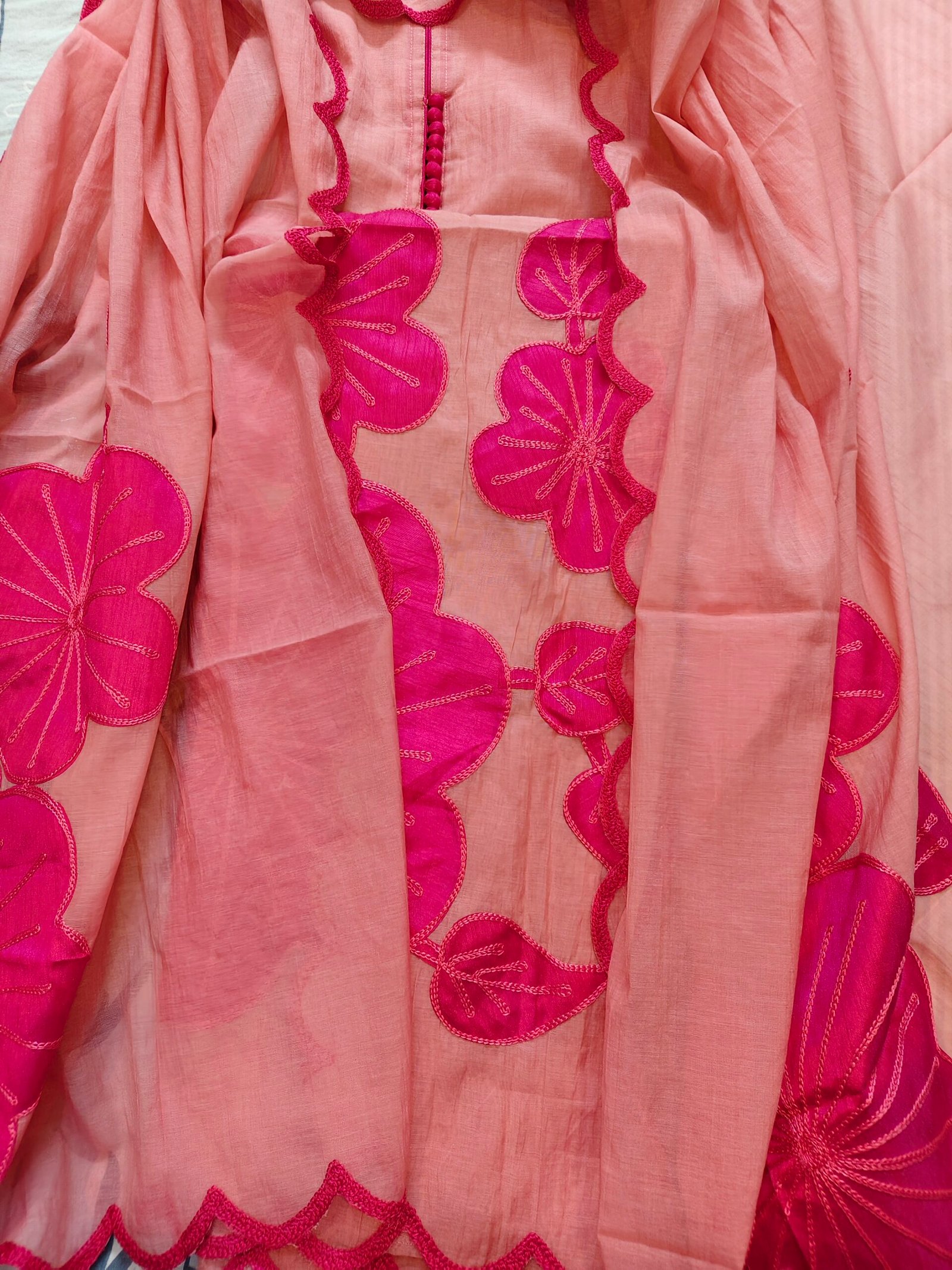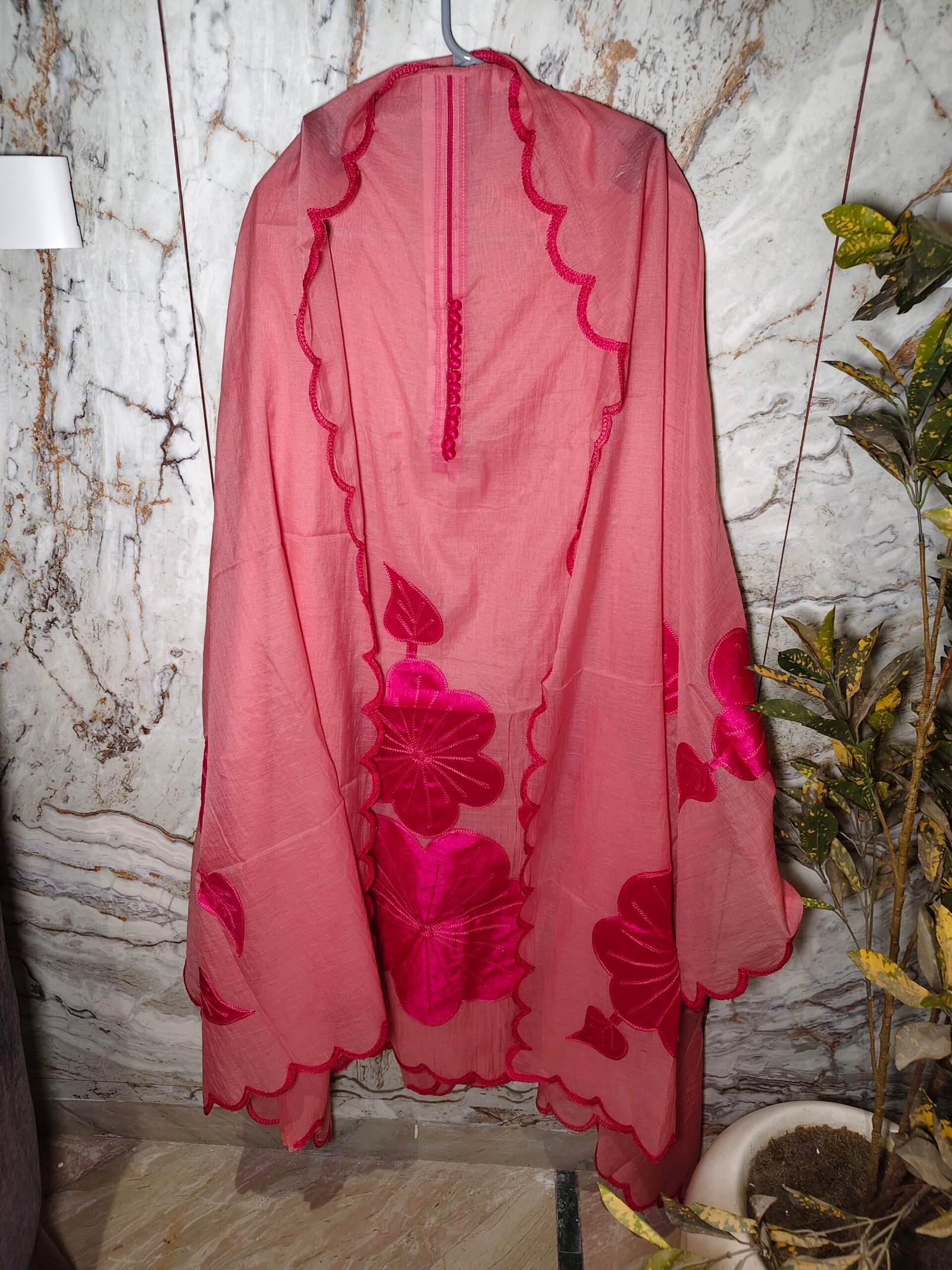 Mul cotton 3 -piece suit with patch work on kurta and duppata. Duppata -muslin cotton. Bottom -Santoon.
