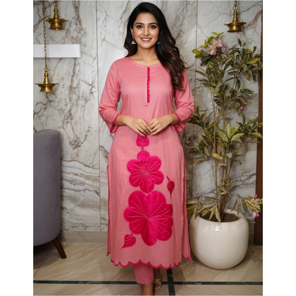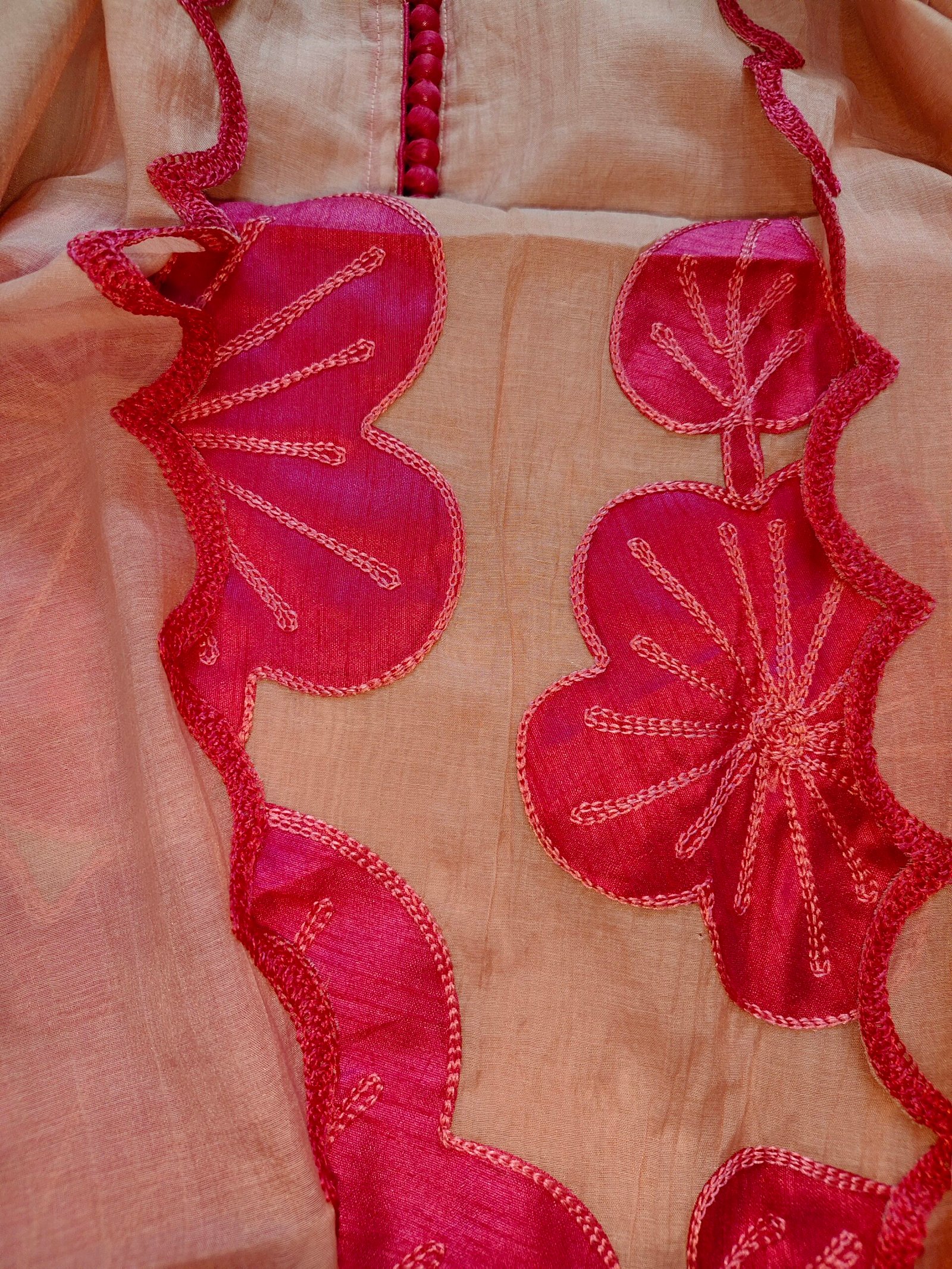 Mul cotton 3 -piece suit with patch work on kurta and duppata.
