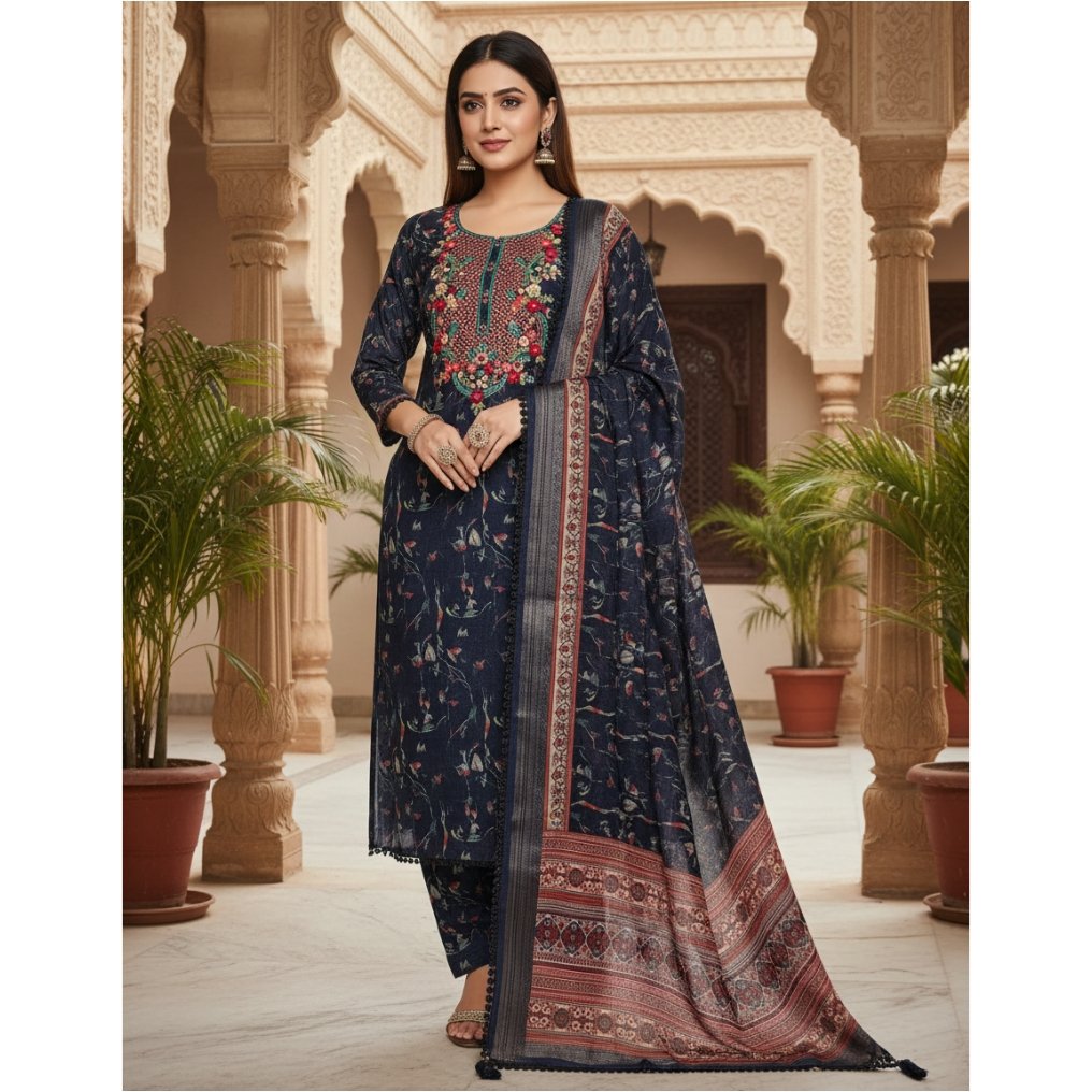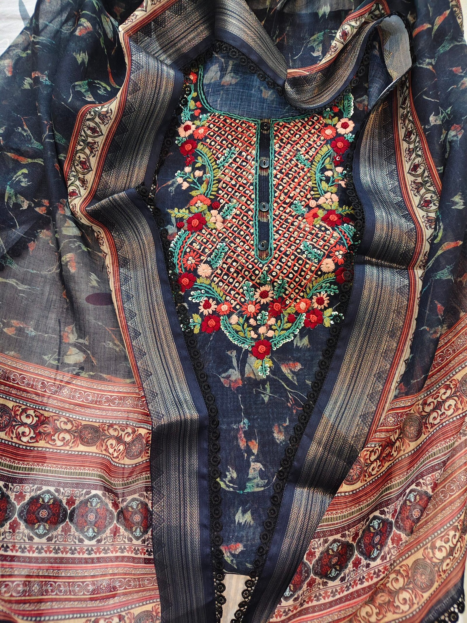 Linen cotton 3-piece suit with hand embroidery on neckline. Dupatta – linen. Bottom -Santoon.