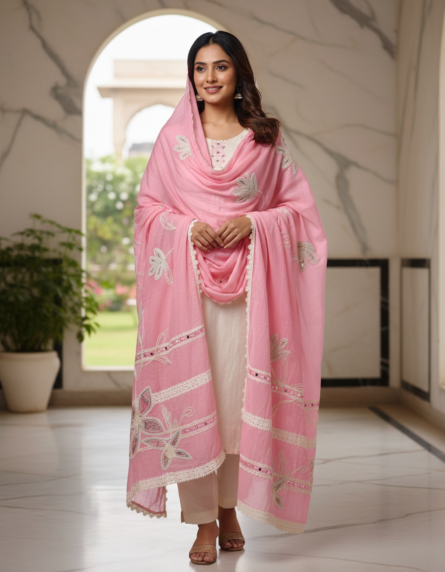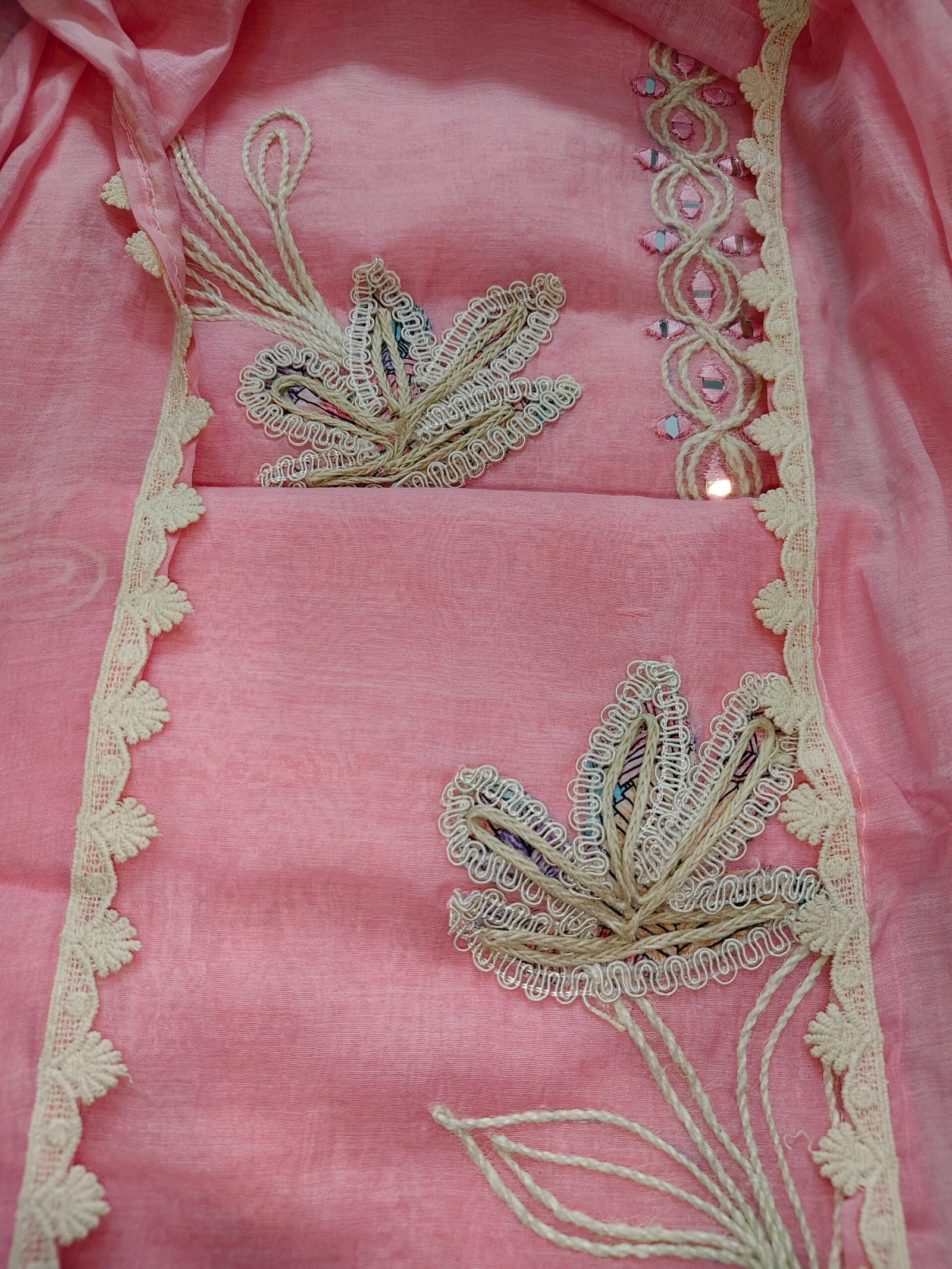Mul  cotton 3 -piece suit with jute, mirror and lace work all over kurta and dupatta. Bottom -Santoon.