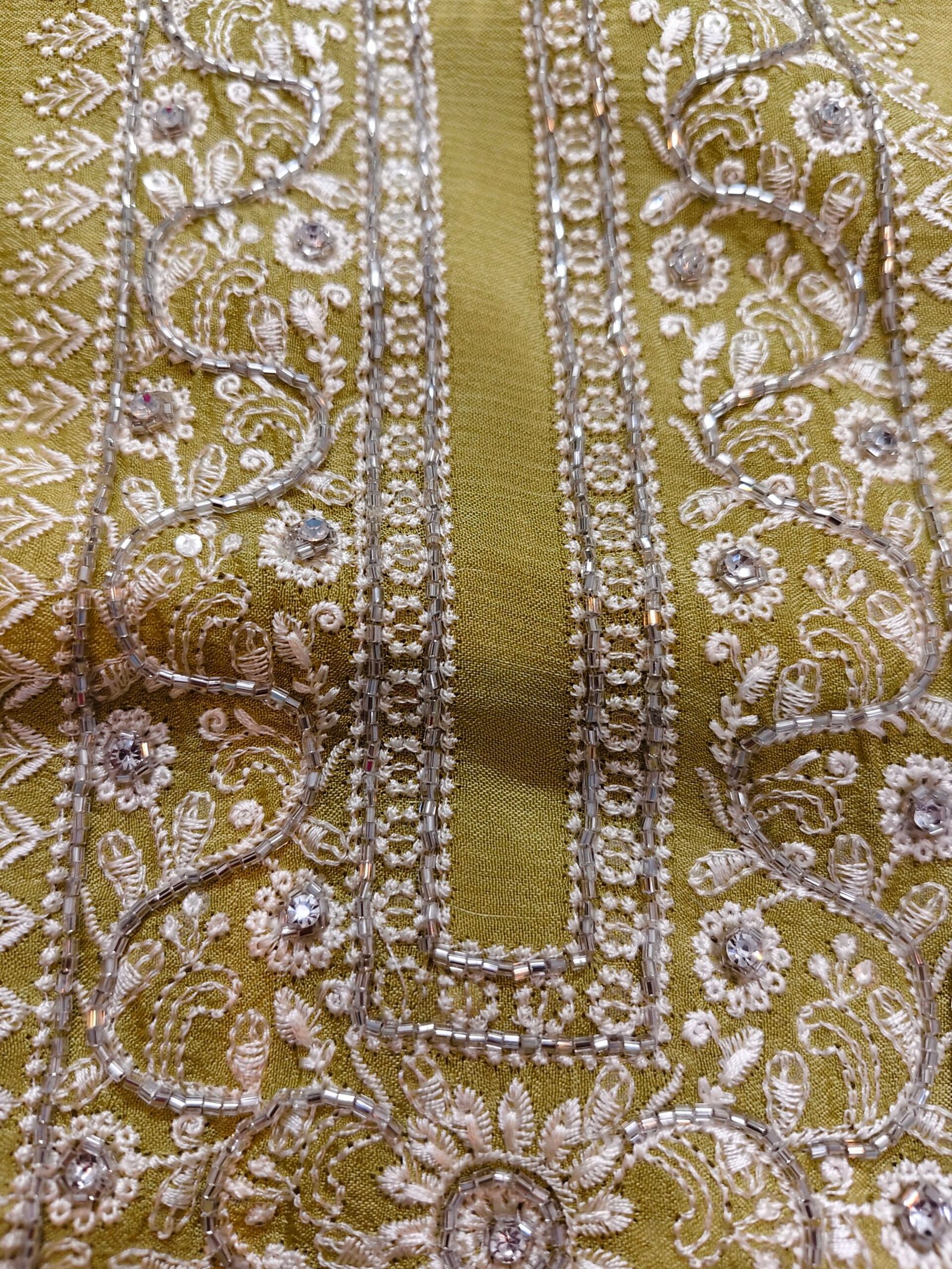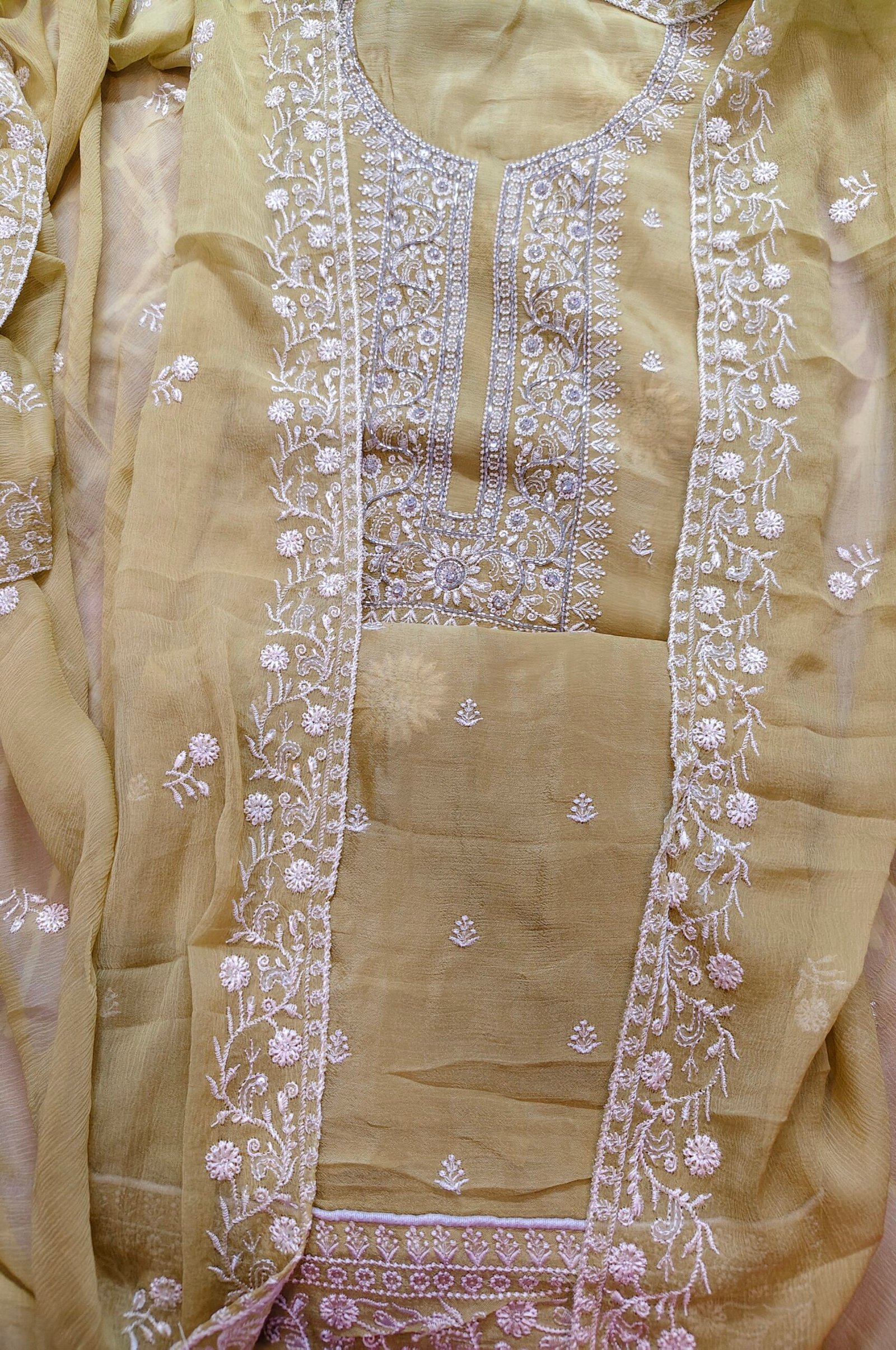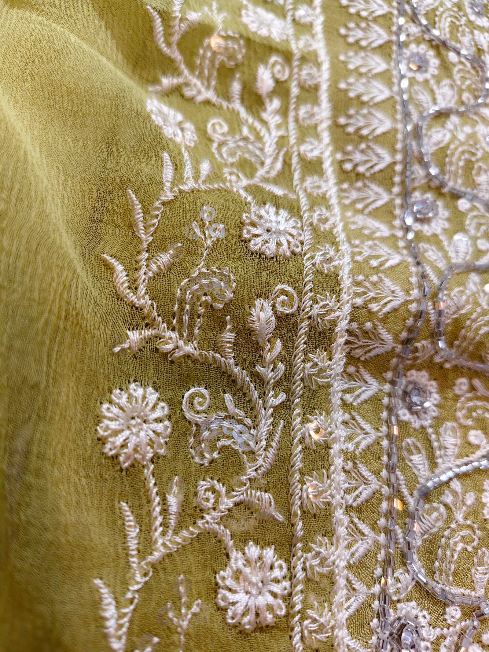 Chinnon fabric 3 -piece suit with cut dana thread embroidery on neckline with pure chiffon embroided dupatta.