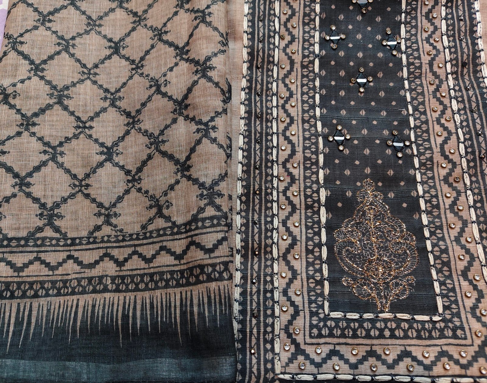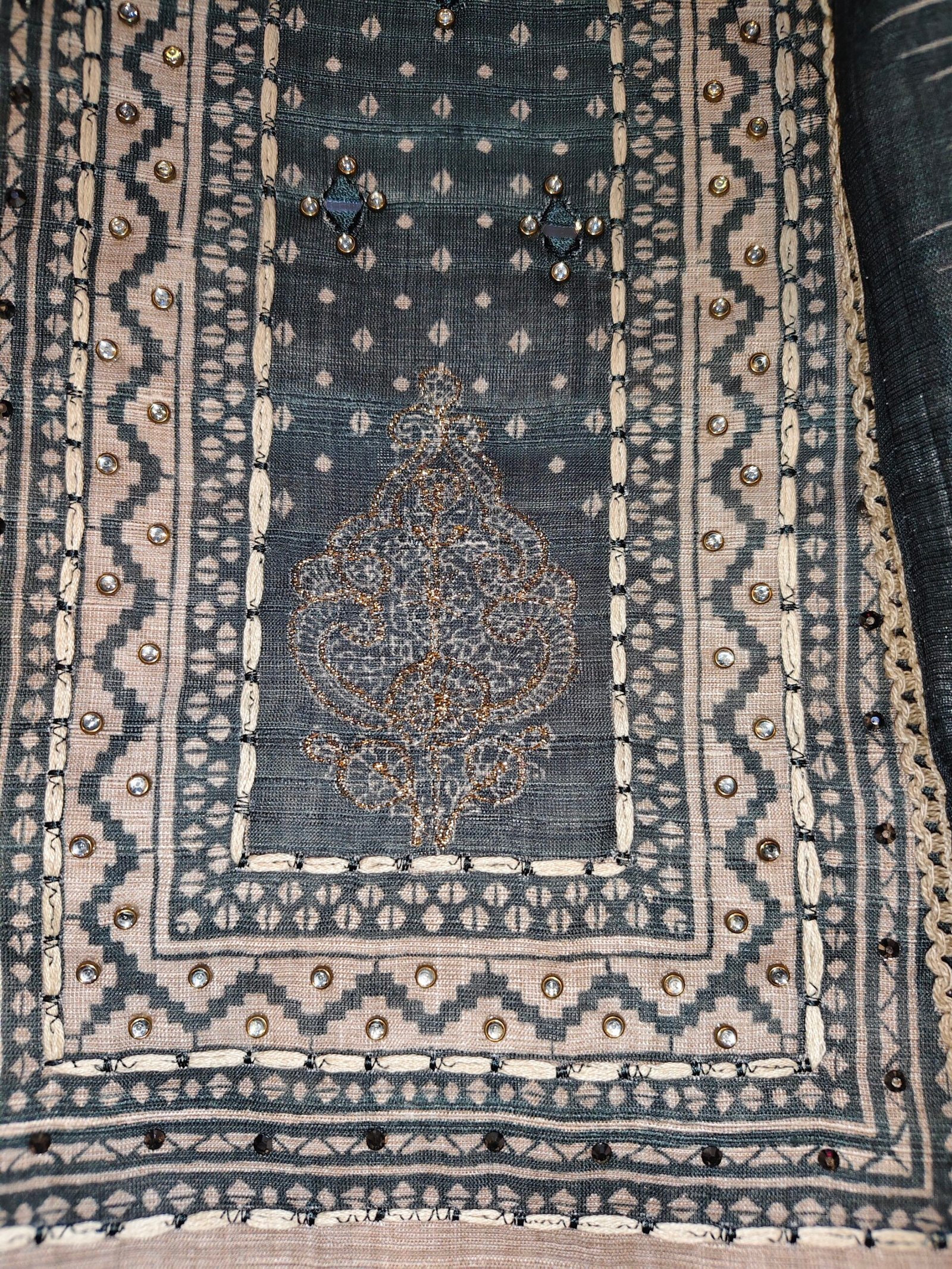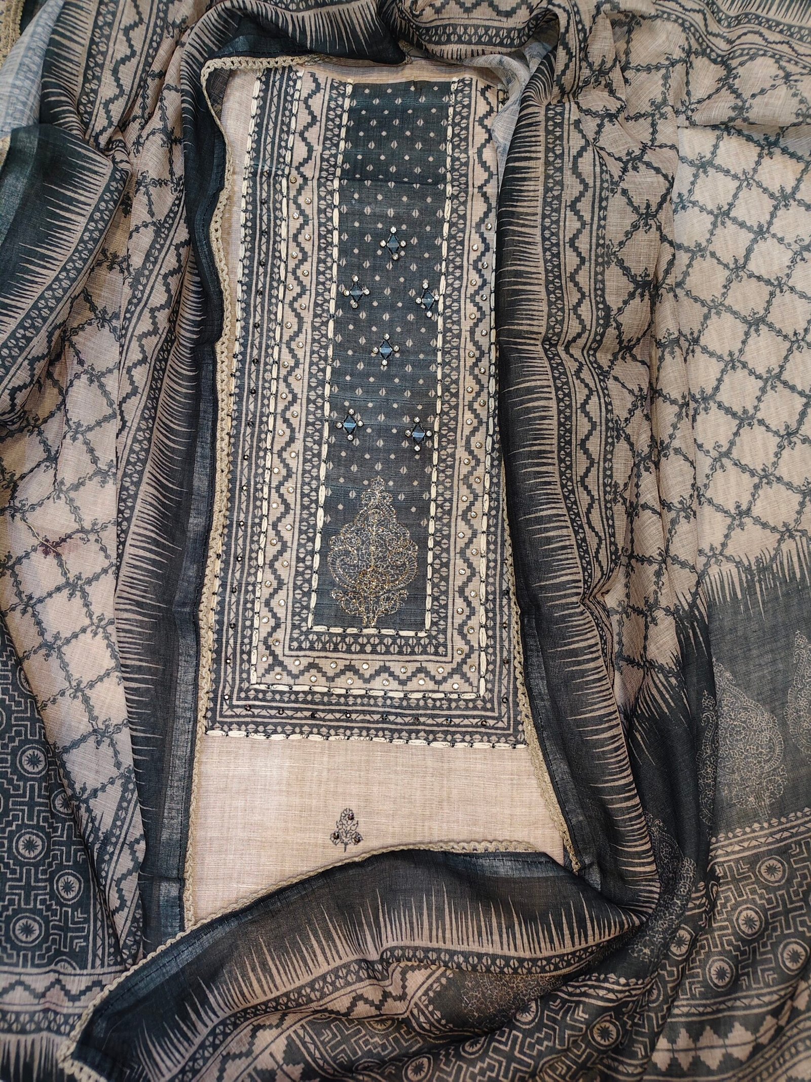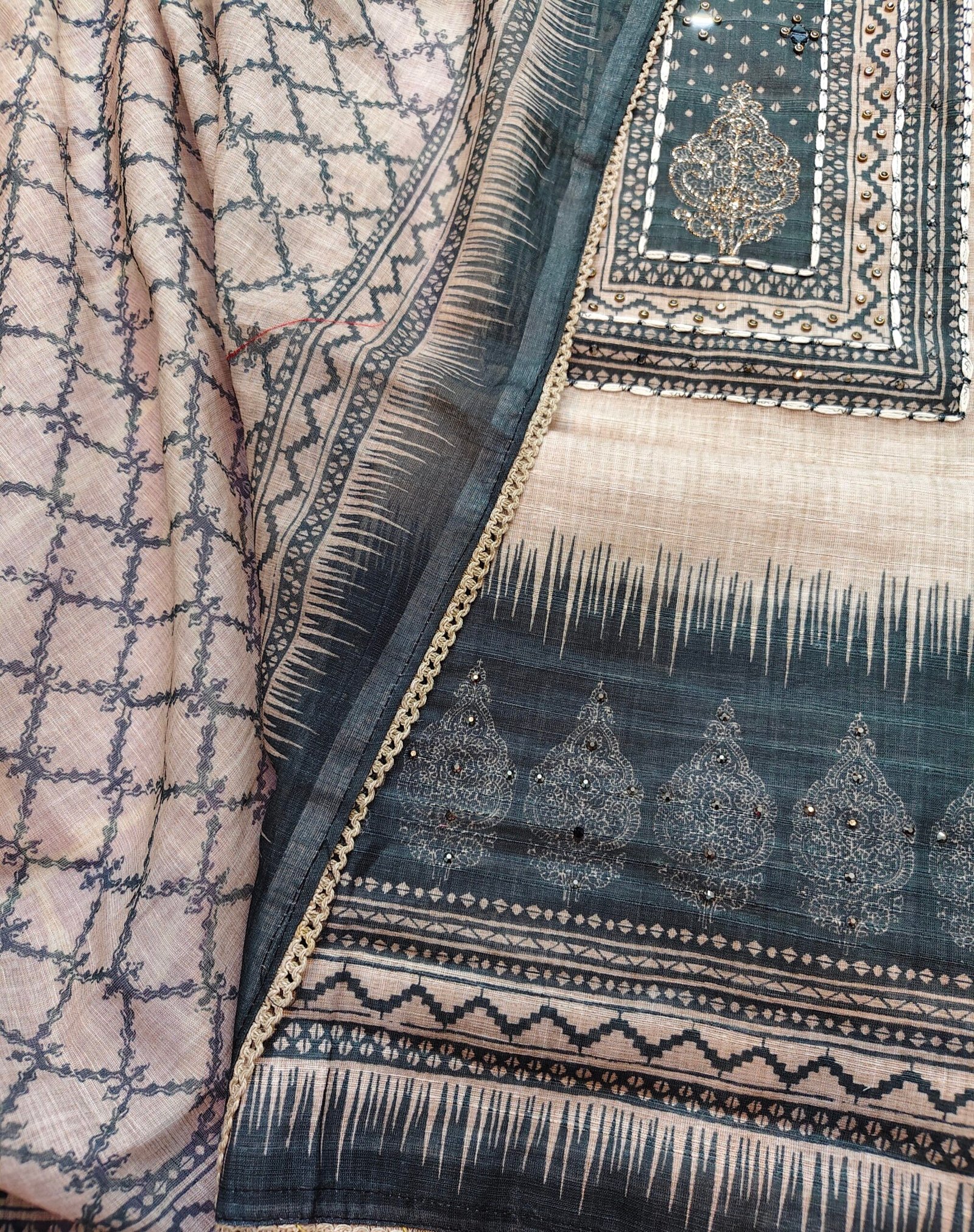 Khadi linen cotton 3-piece suit with mirror, thread, neemzari and kundan work on neckline Bottom- Santoor (2.5m)