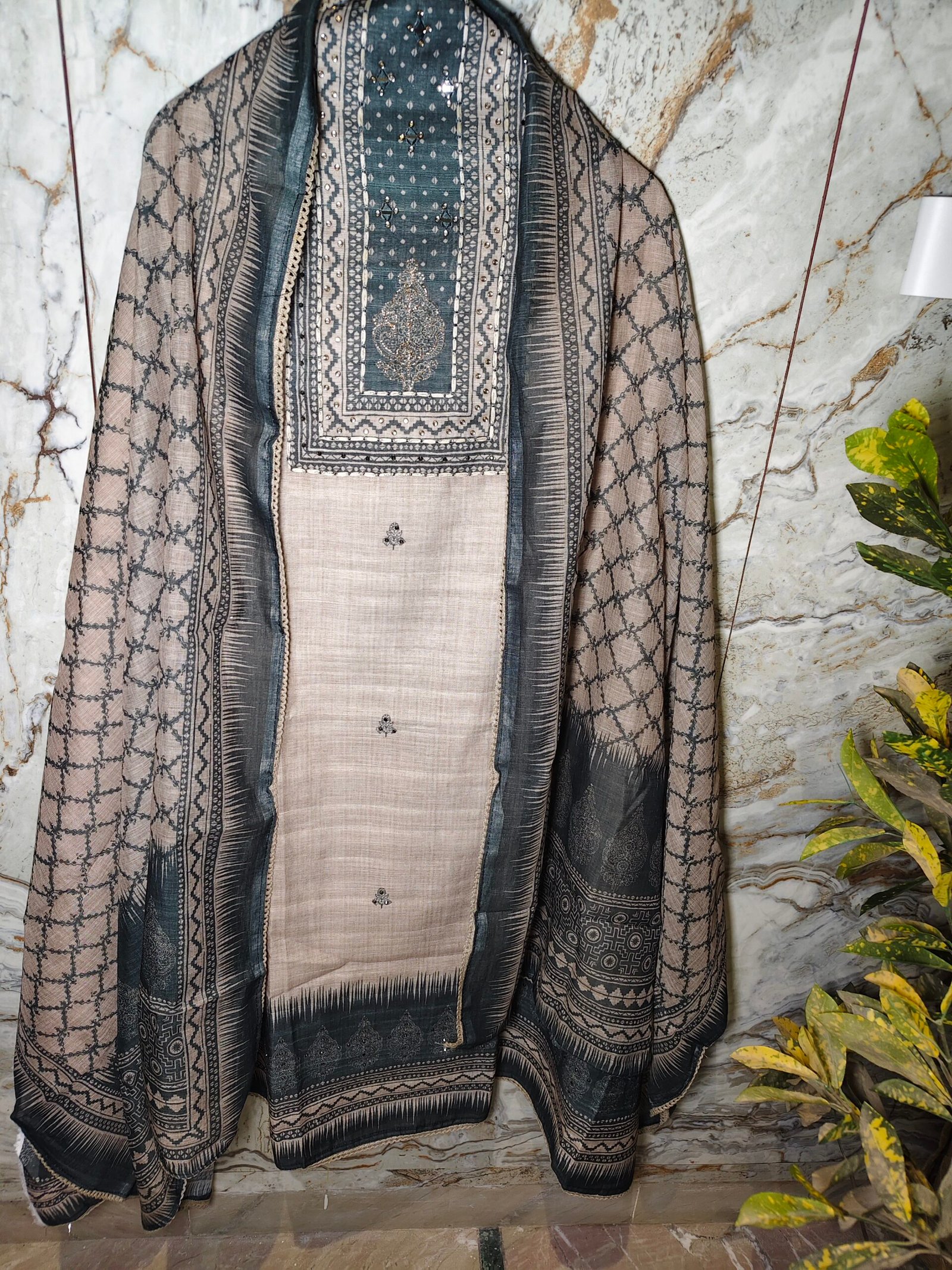 Khadi linen cotton 3-piece suit with mirror, thread, neemzari and kundan work on neckline