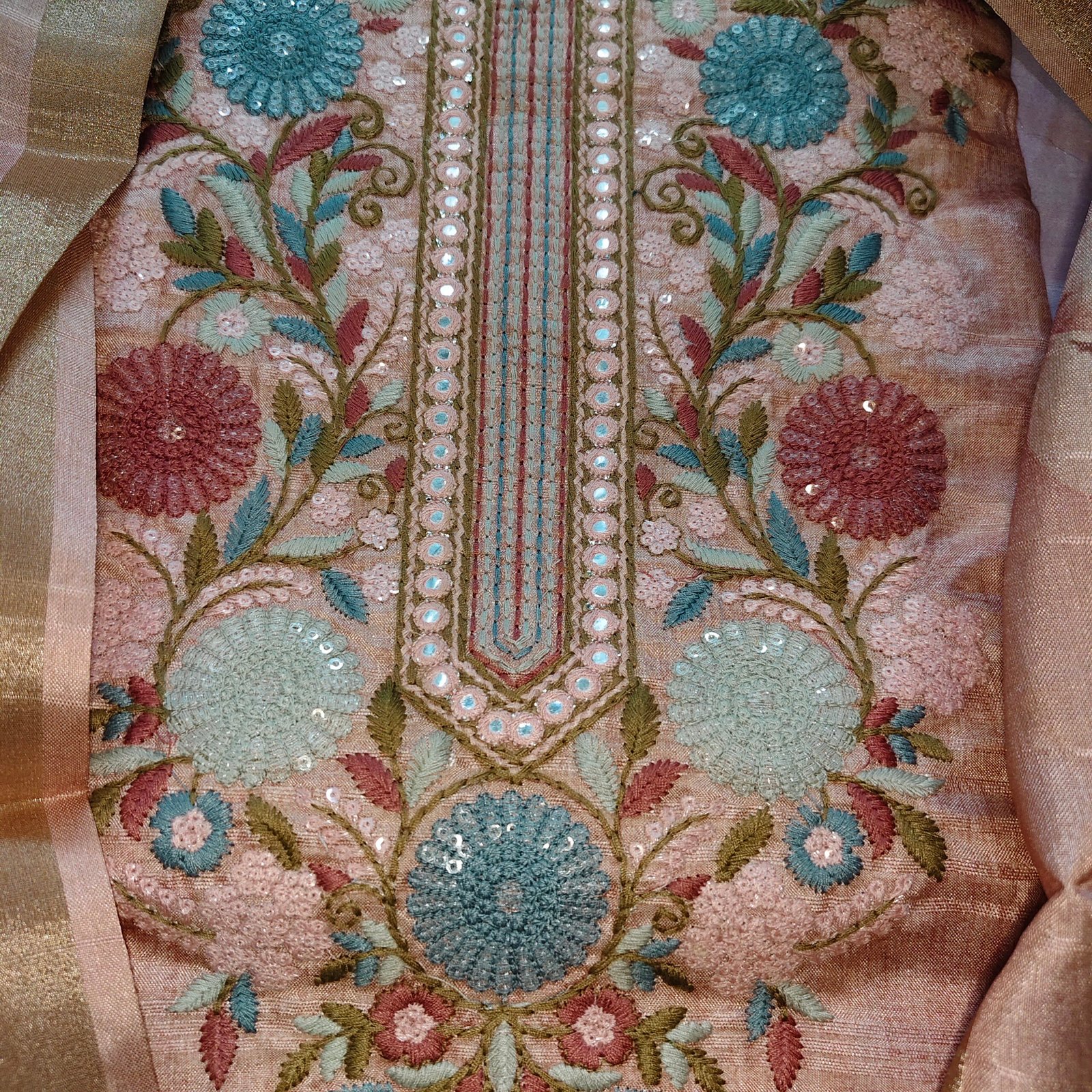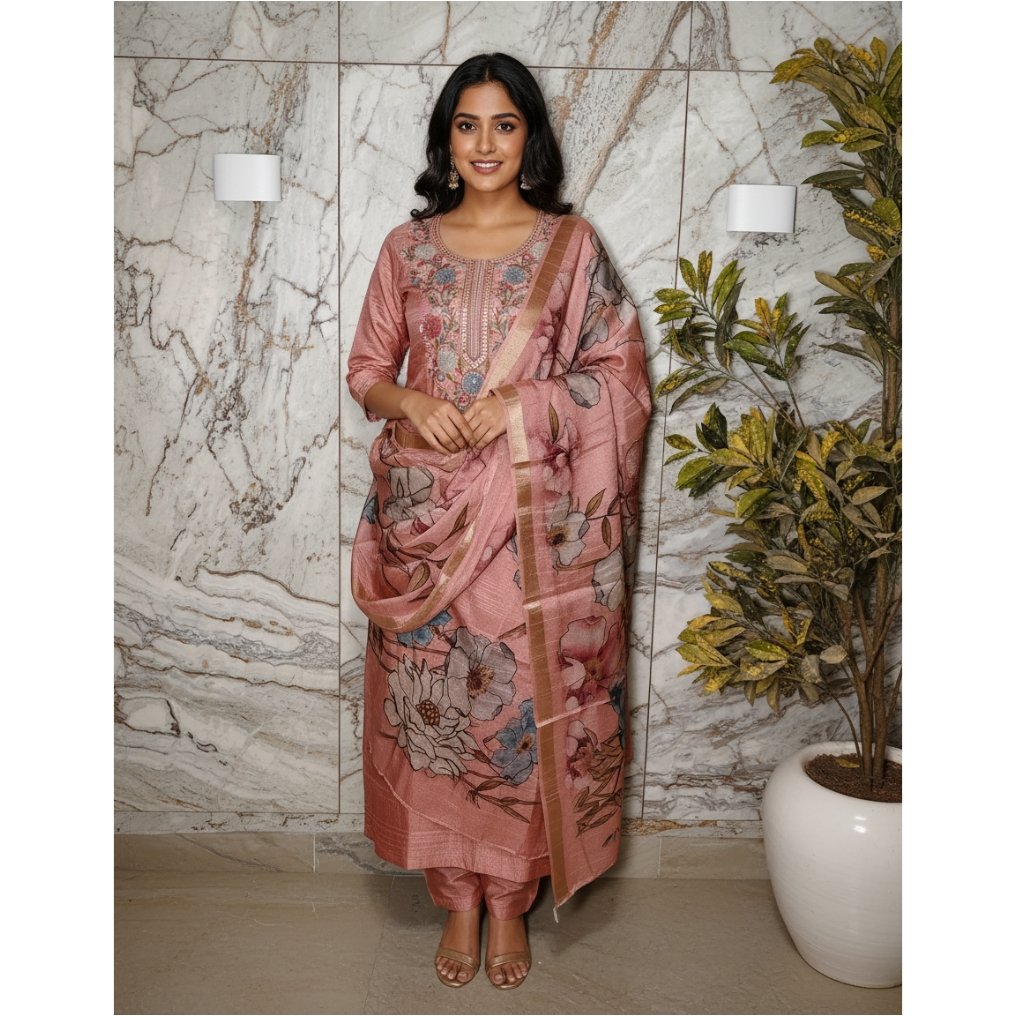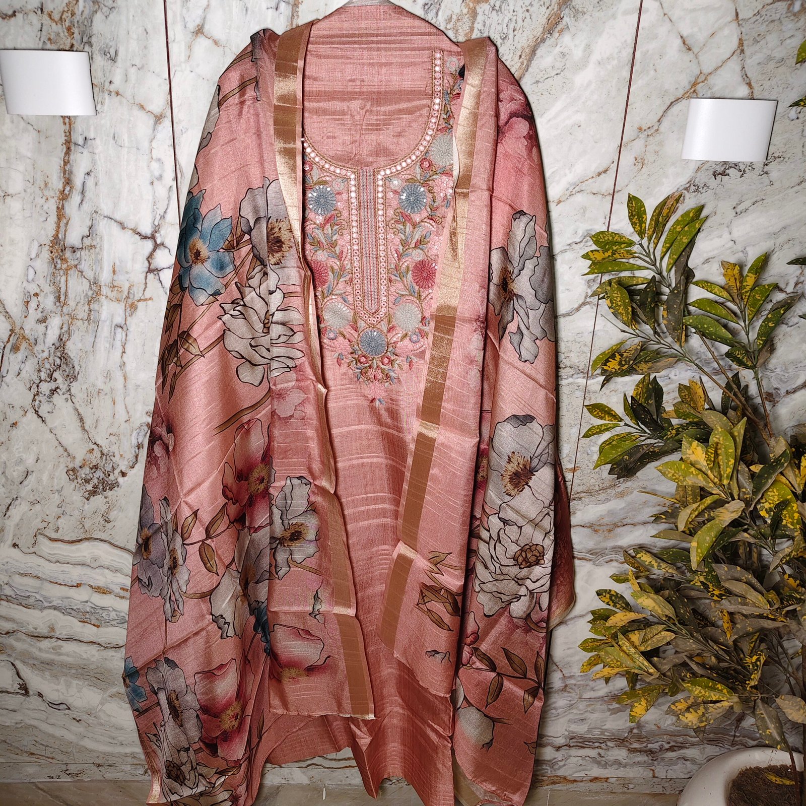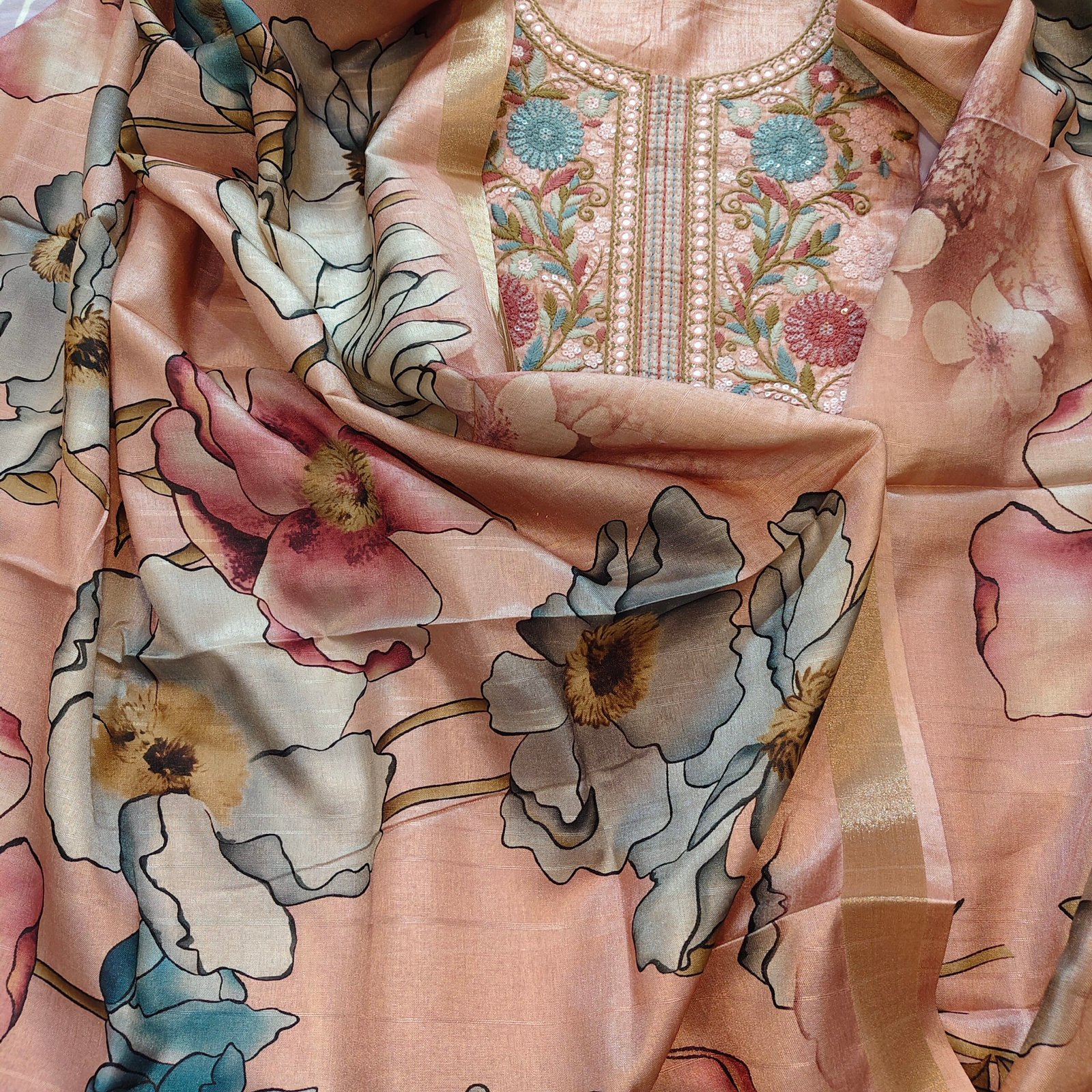 Silk suit with embroidery and mirror work on neckline and silk digital print dupatta.