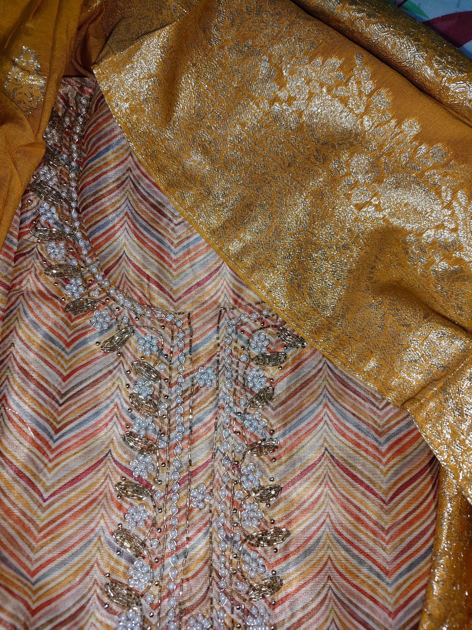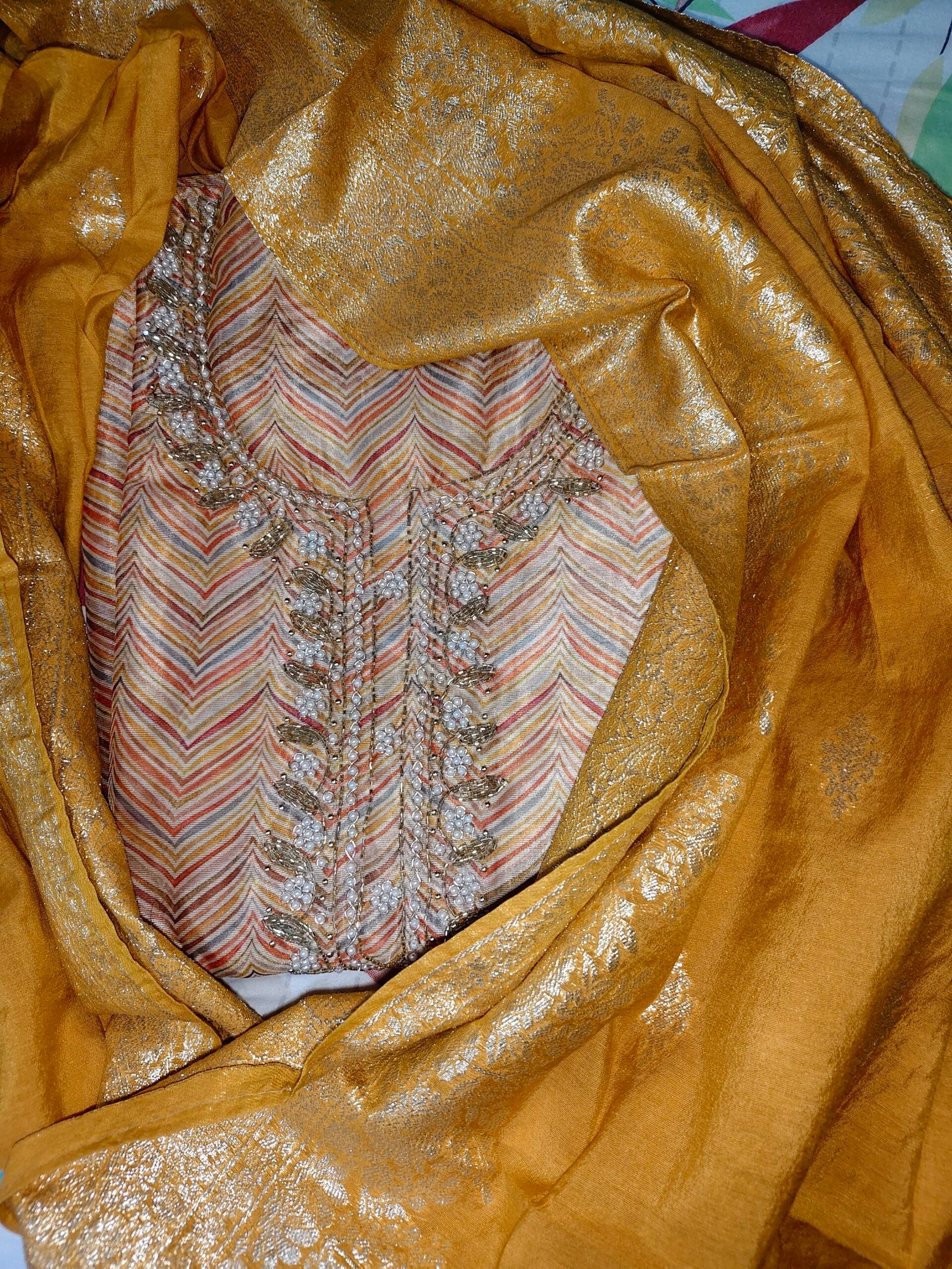 Maheshwari Silk suit with pearls and cut work  on neckline with jackard dupatta.