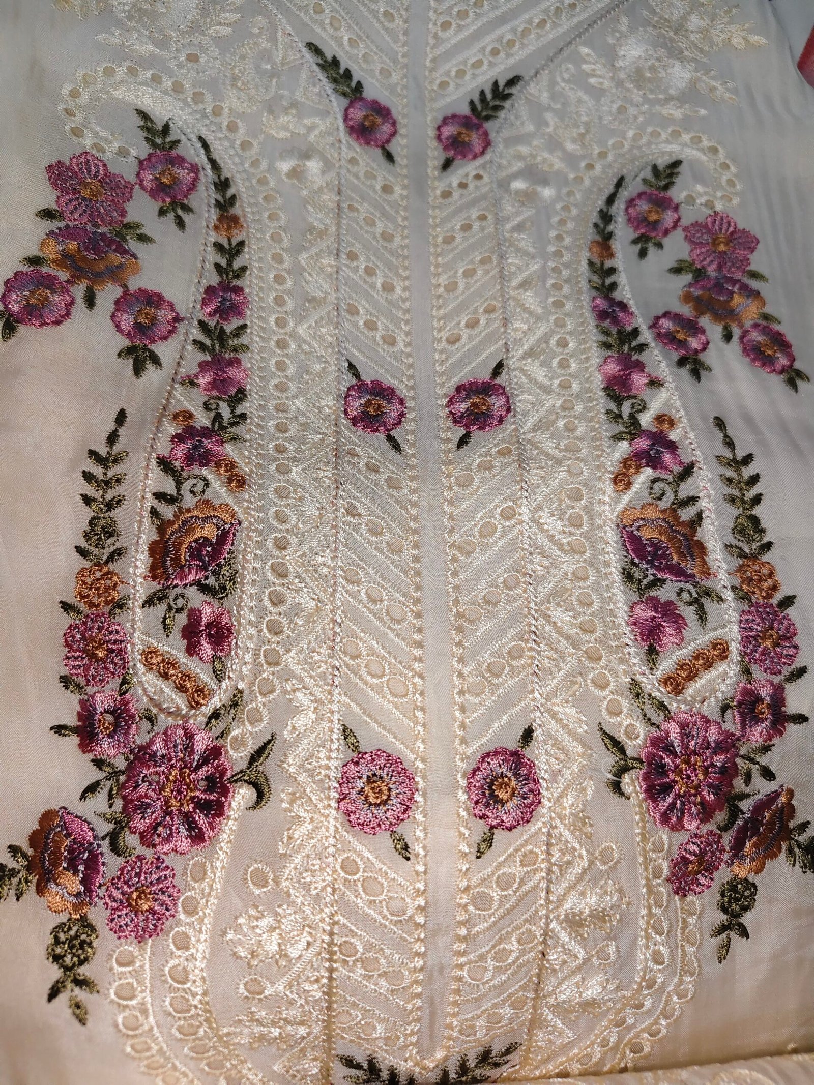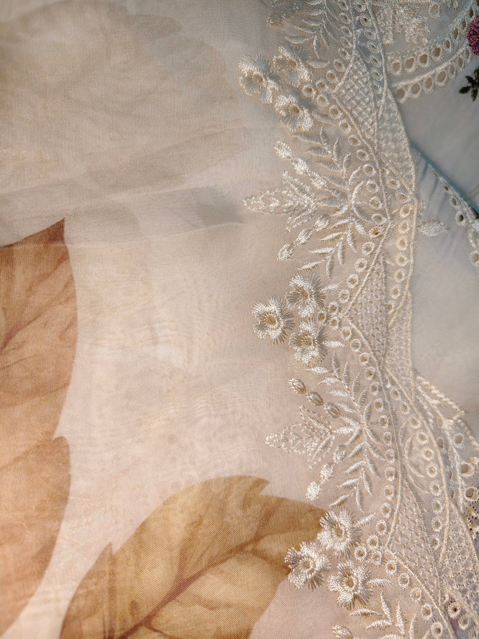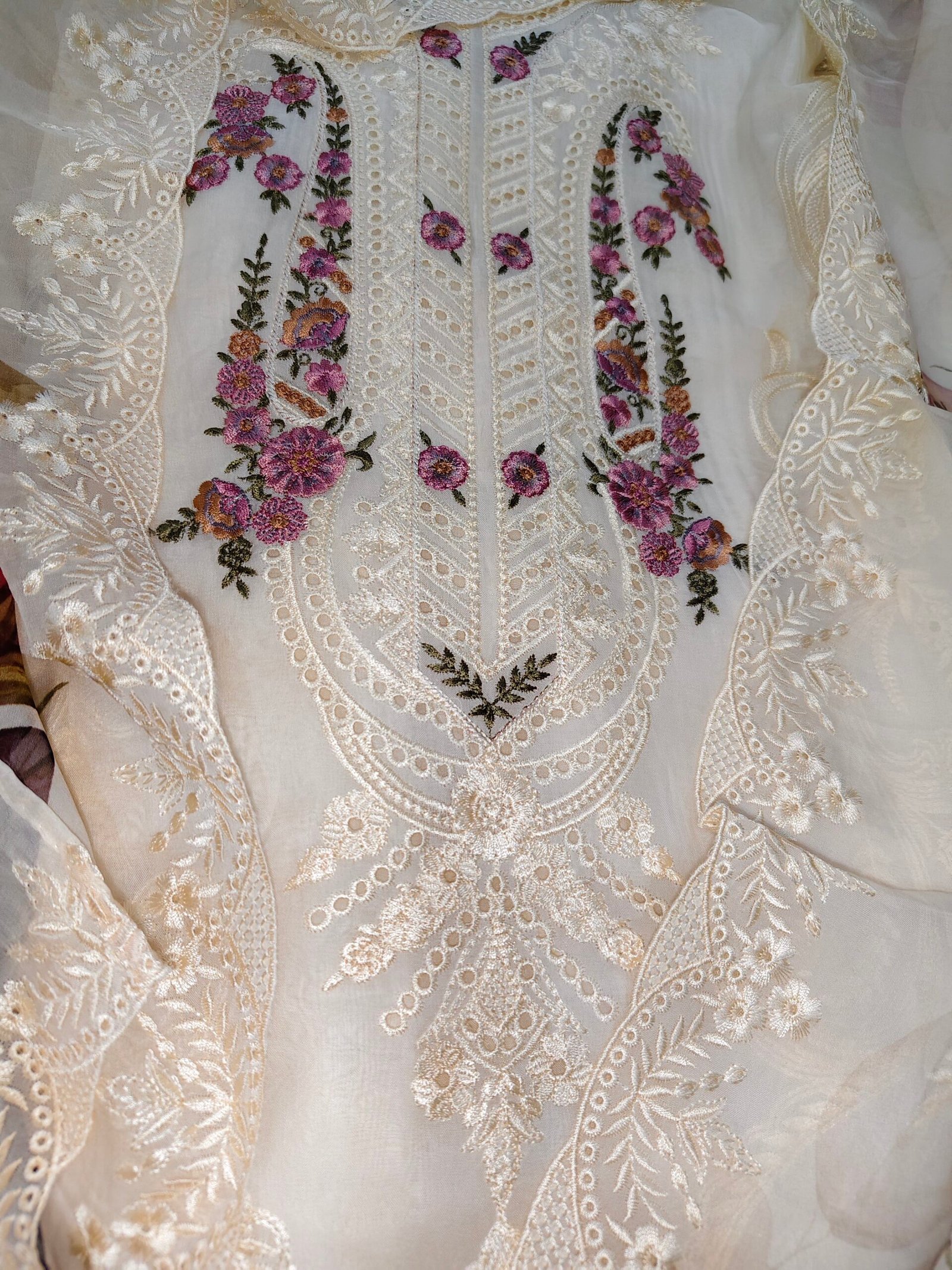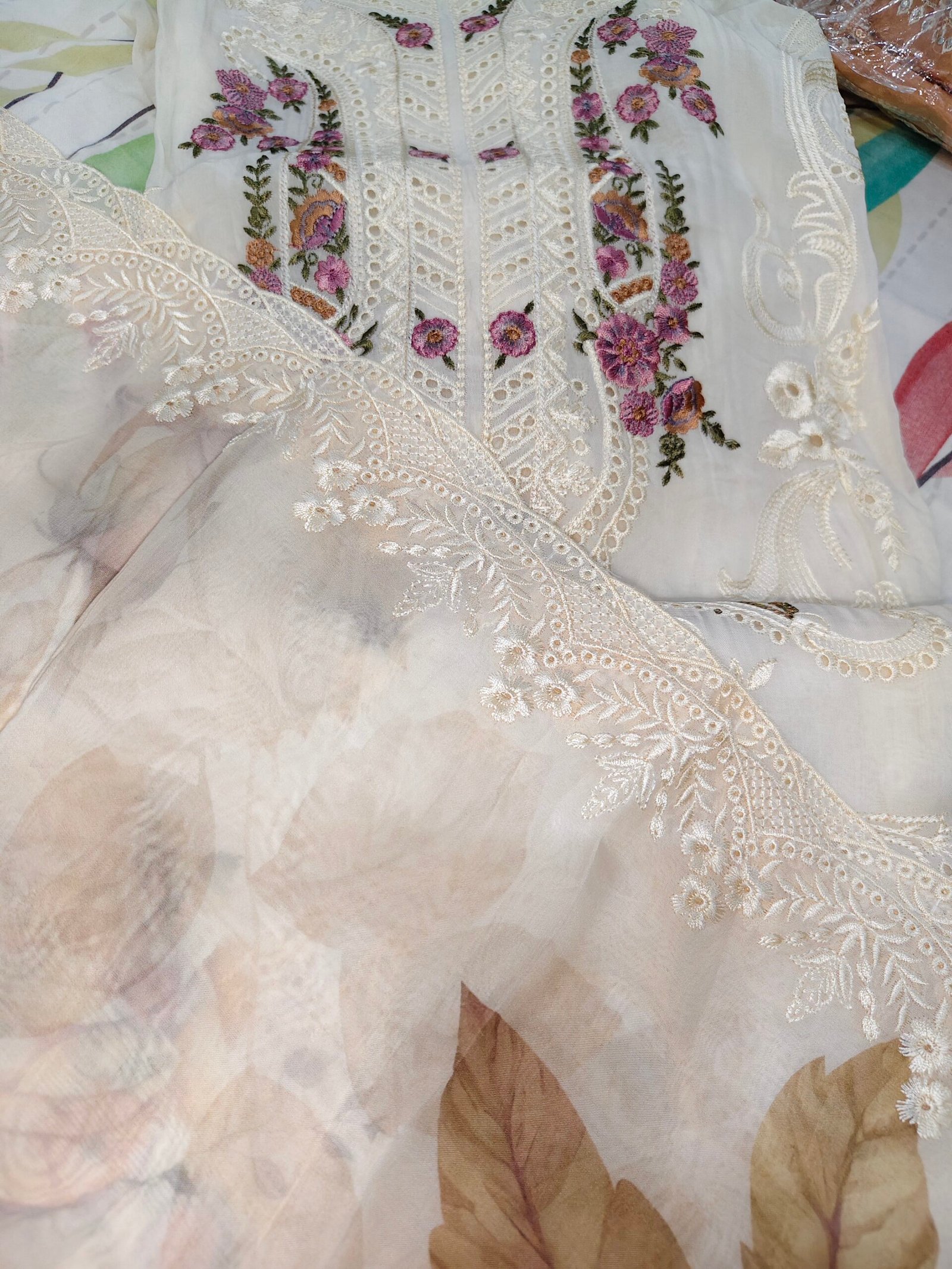 Semi- Organza 3 piece suit with full cut work all over suit and gital print dupatta.