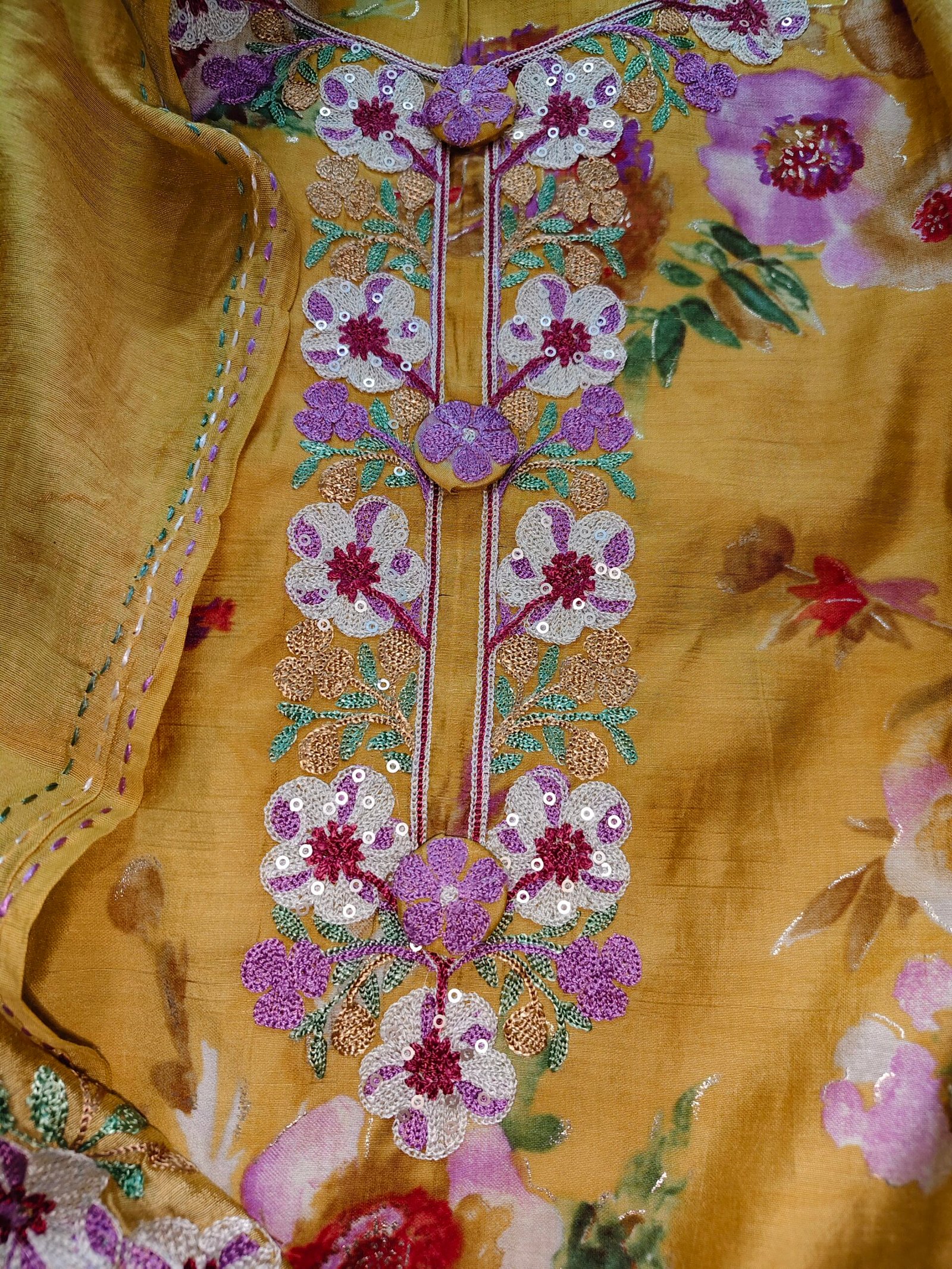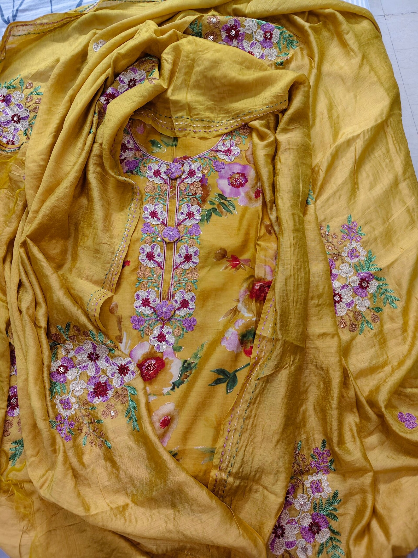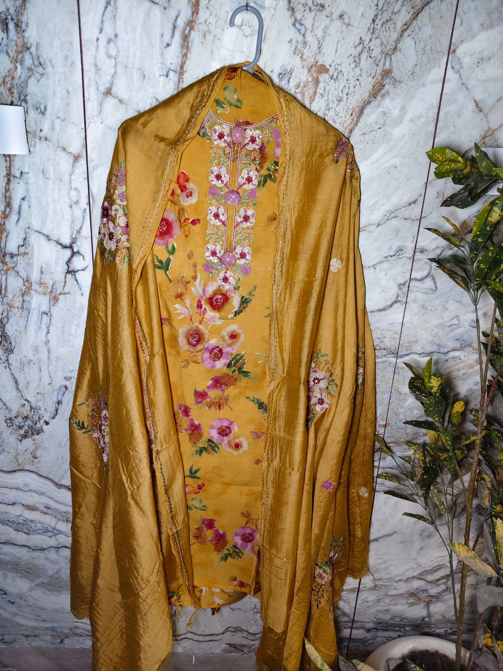 Modal 3 -piece unstitched suit with arry work on neckline. Dupatta -Chanderi with arry and katha stitch.