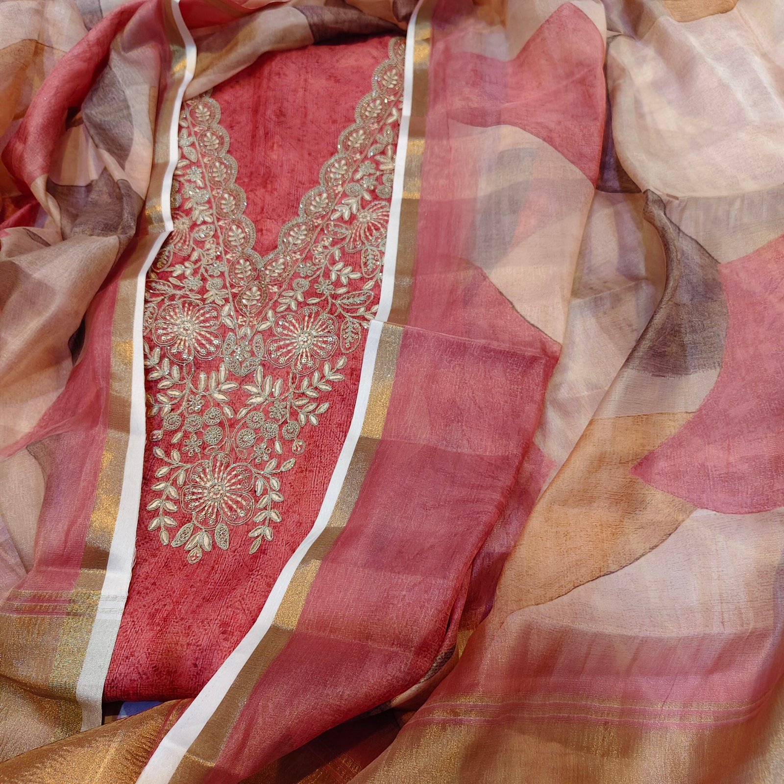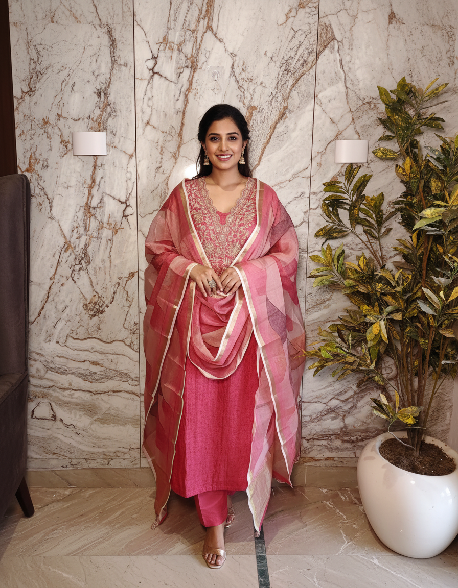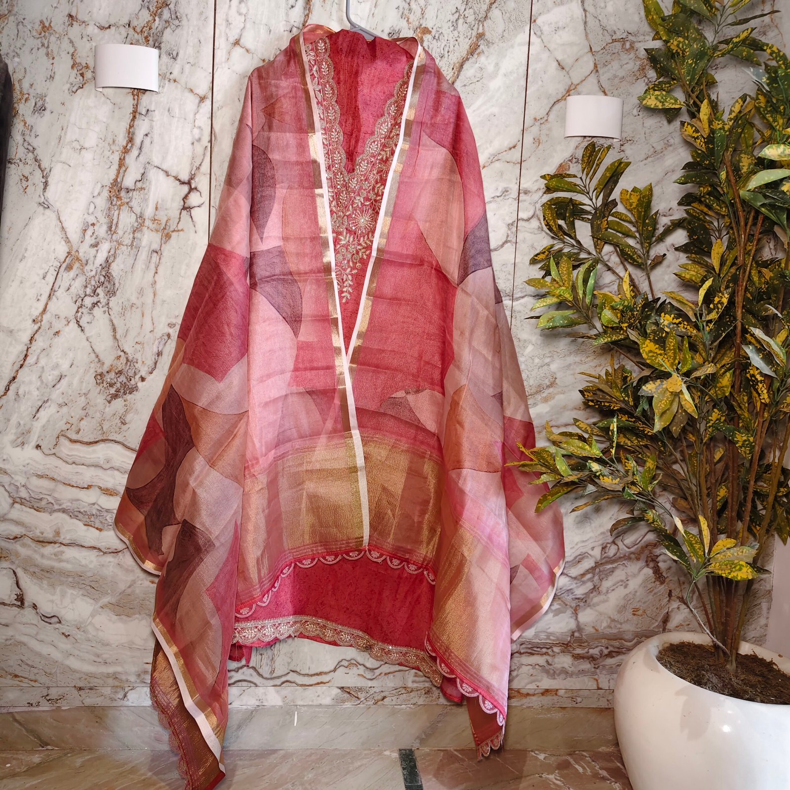 Beautifully detailed silk suit with timeless elegance, enhanced by a digitally printed dupatta and intricate golden thread embroidery.