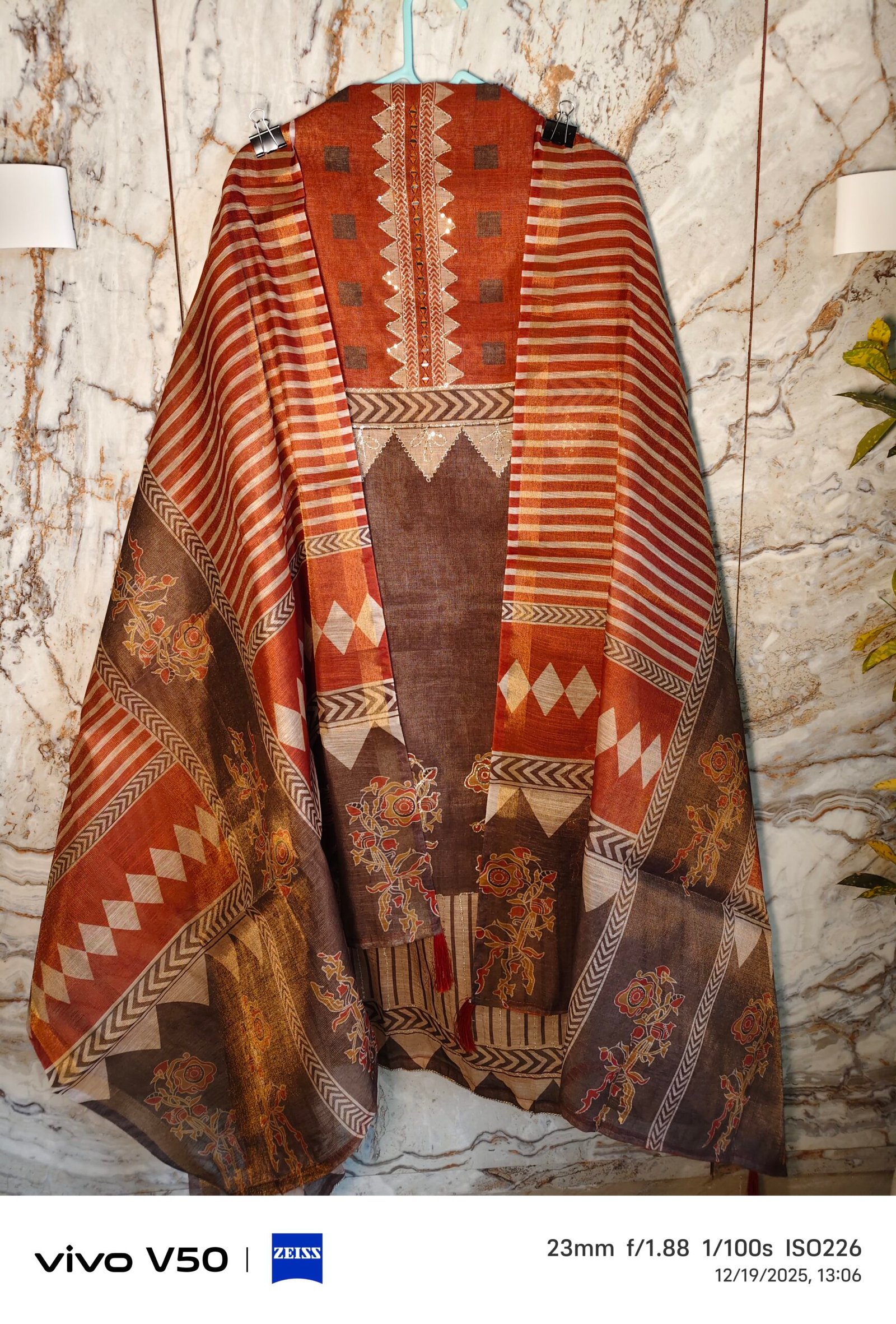 Shimmer Chanderi 3-piece suit with mirror and neemzari embroidery on neckline.