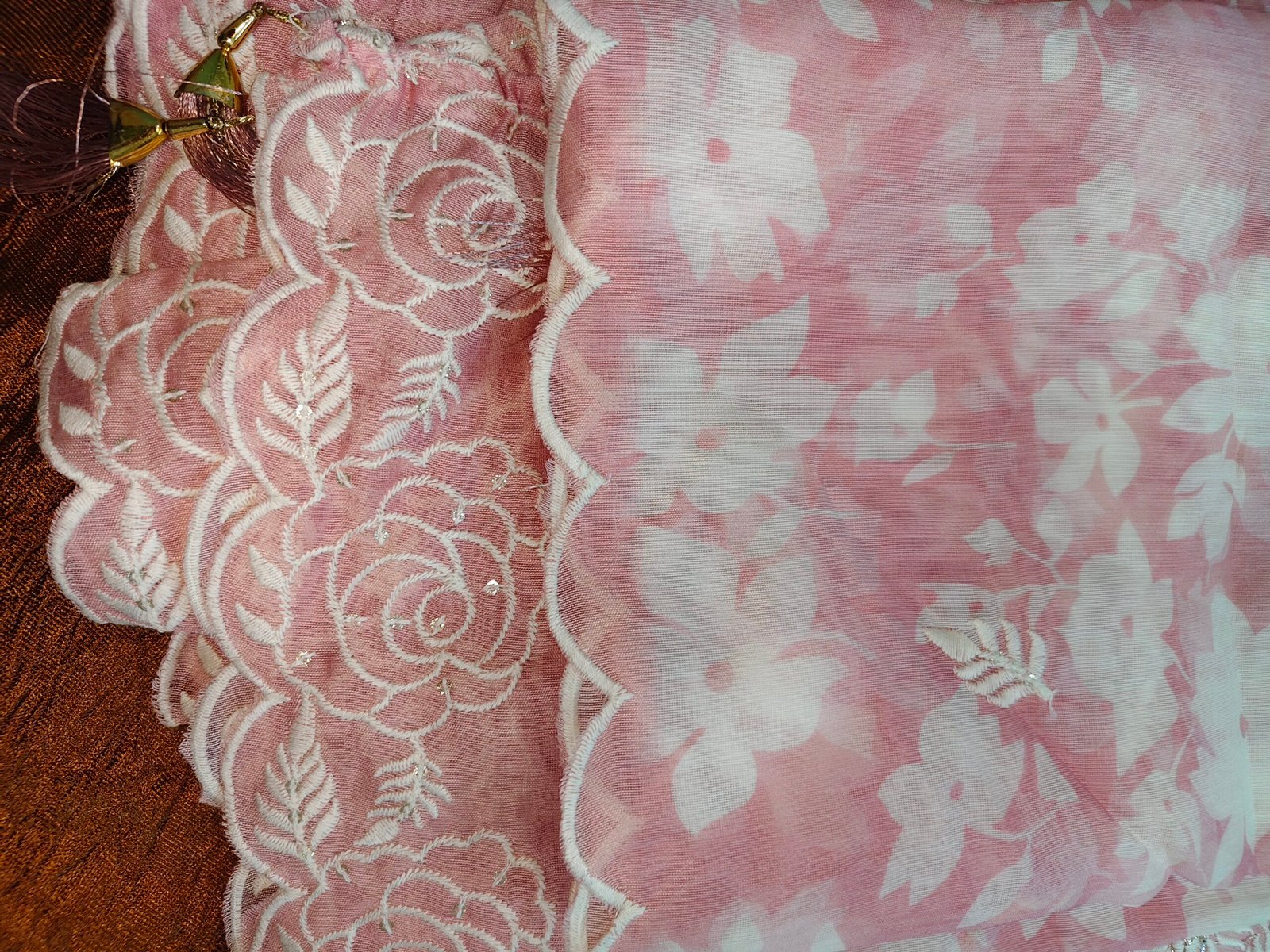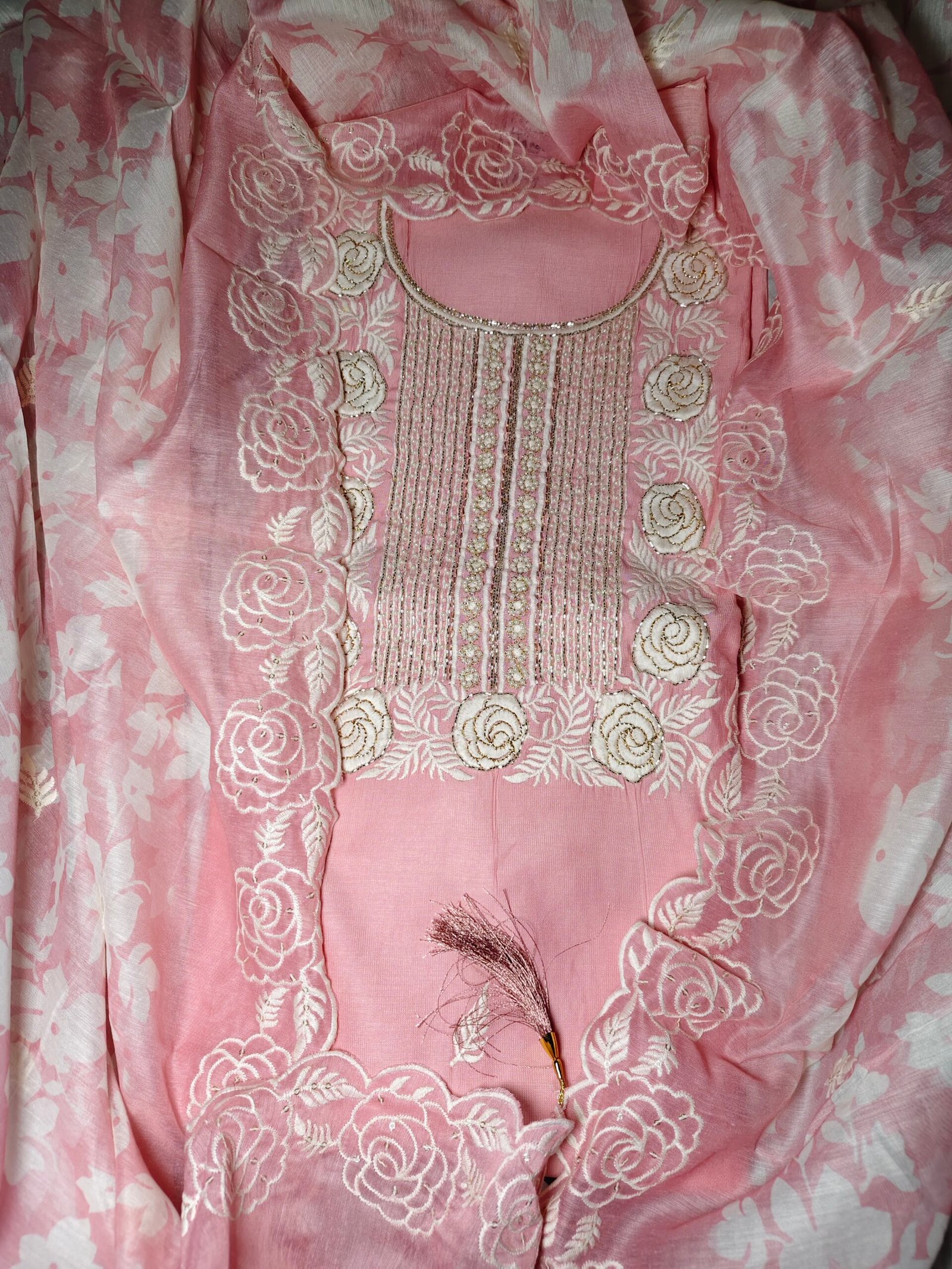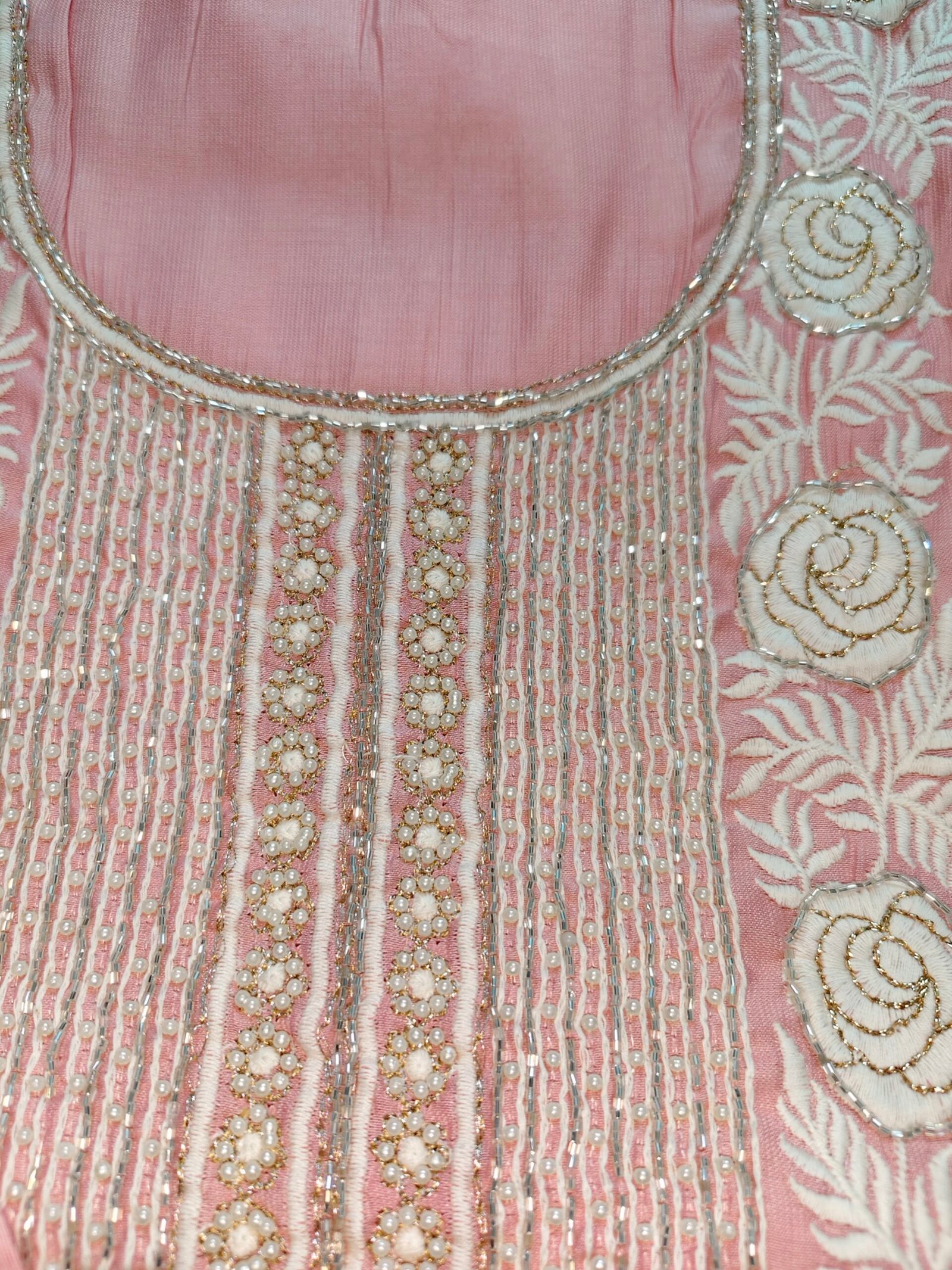 Pink Cotton chanderi 3- piece suit with pearl and nalki work. Kurta goes with pink cut work elegant embroidery dupatta. Bottom -Santoon (2.5m)
