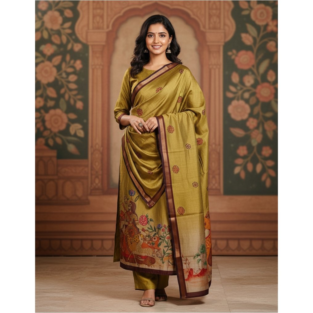 Maheshwari Silk 3 -piece suit with digital print dupatta.