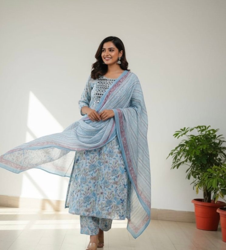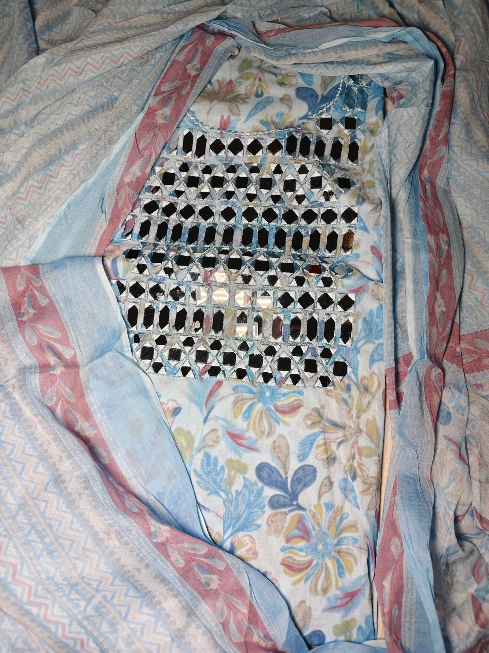 Light blue cotton 3-piece suit with heavy real mirror work on neckline. Bottom- cotton (2.5m)