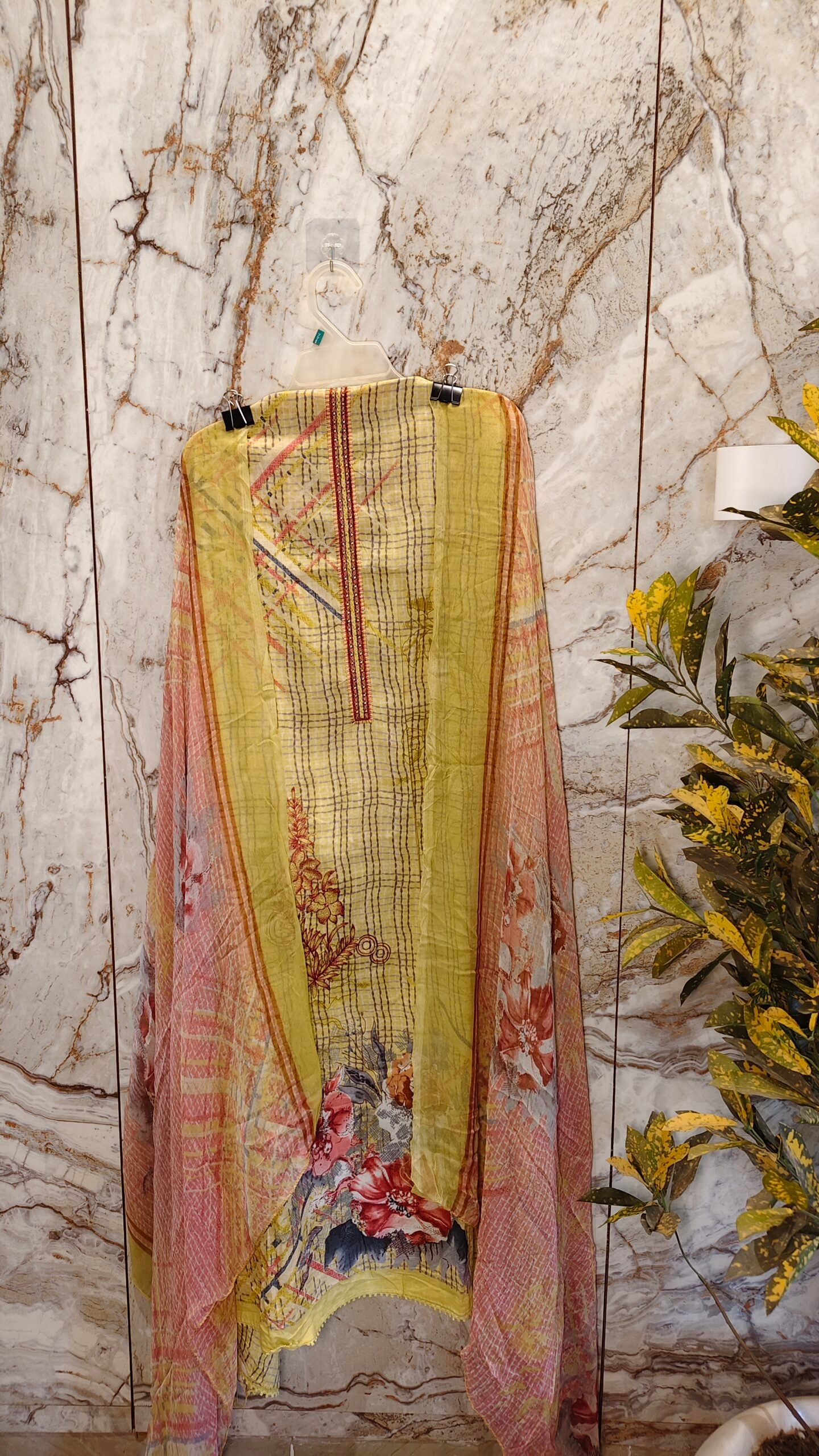 Semi-lone cotton 3-piece suit with embroidery on neckline and daaman. Duppata -pure chiffon Bottom -cotton (2.5m)
