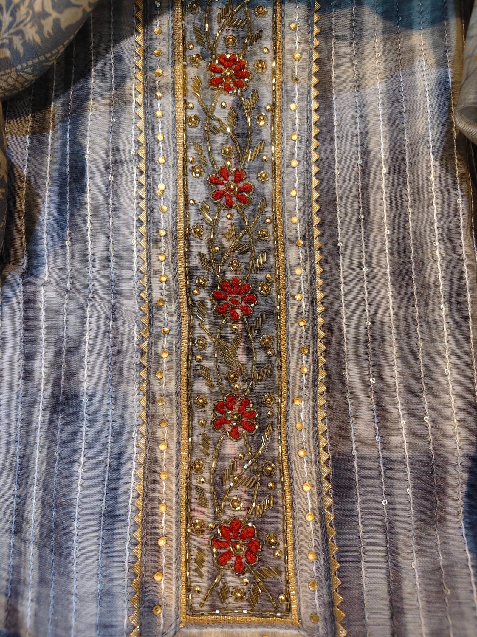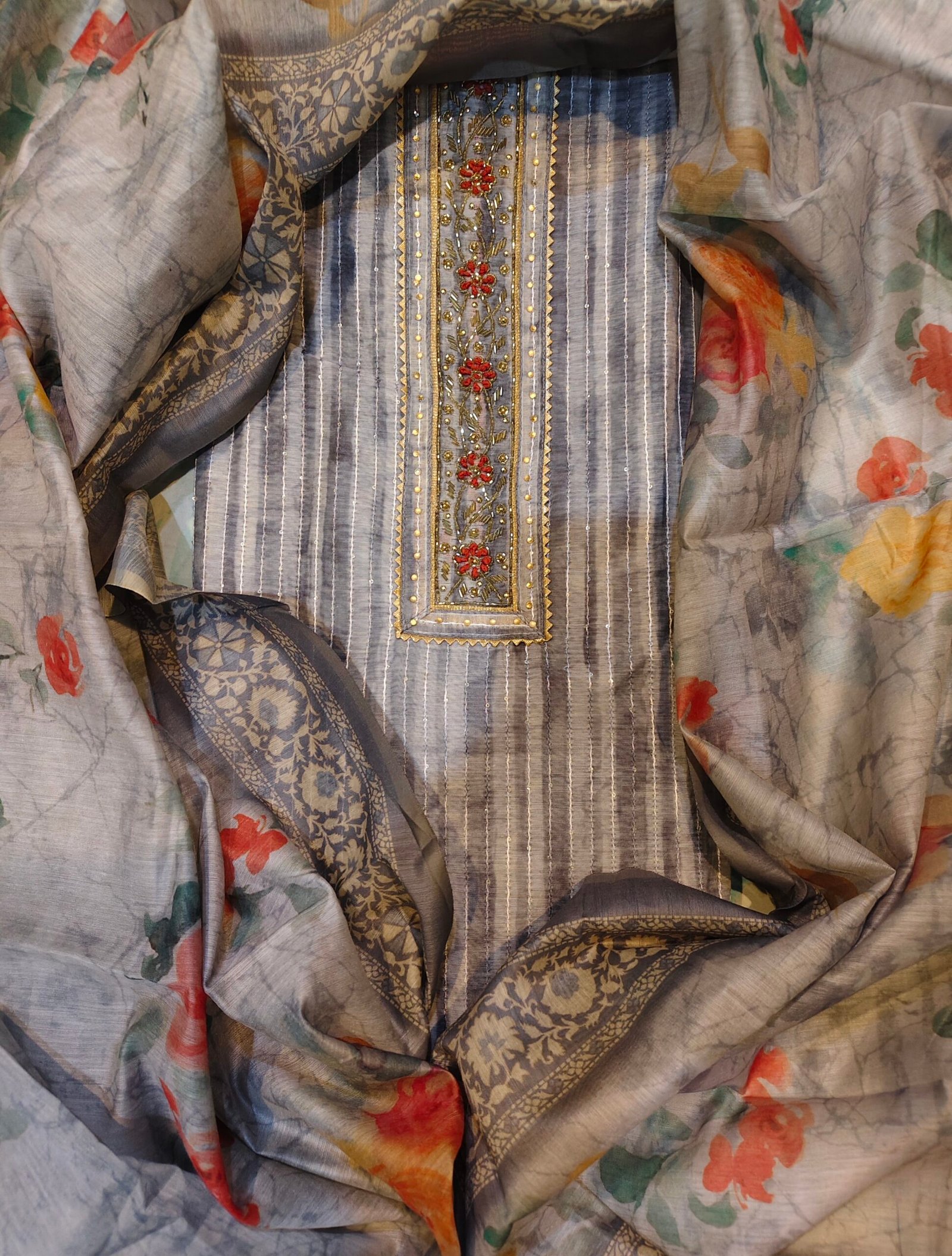 Chanderi suitv3- piece suit embellished with cut dana and intricate hand work, beautifully finished with lace detailing on the neckline for an elegant look.