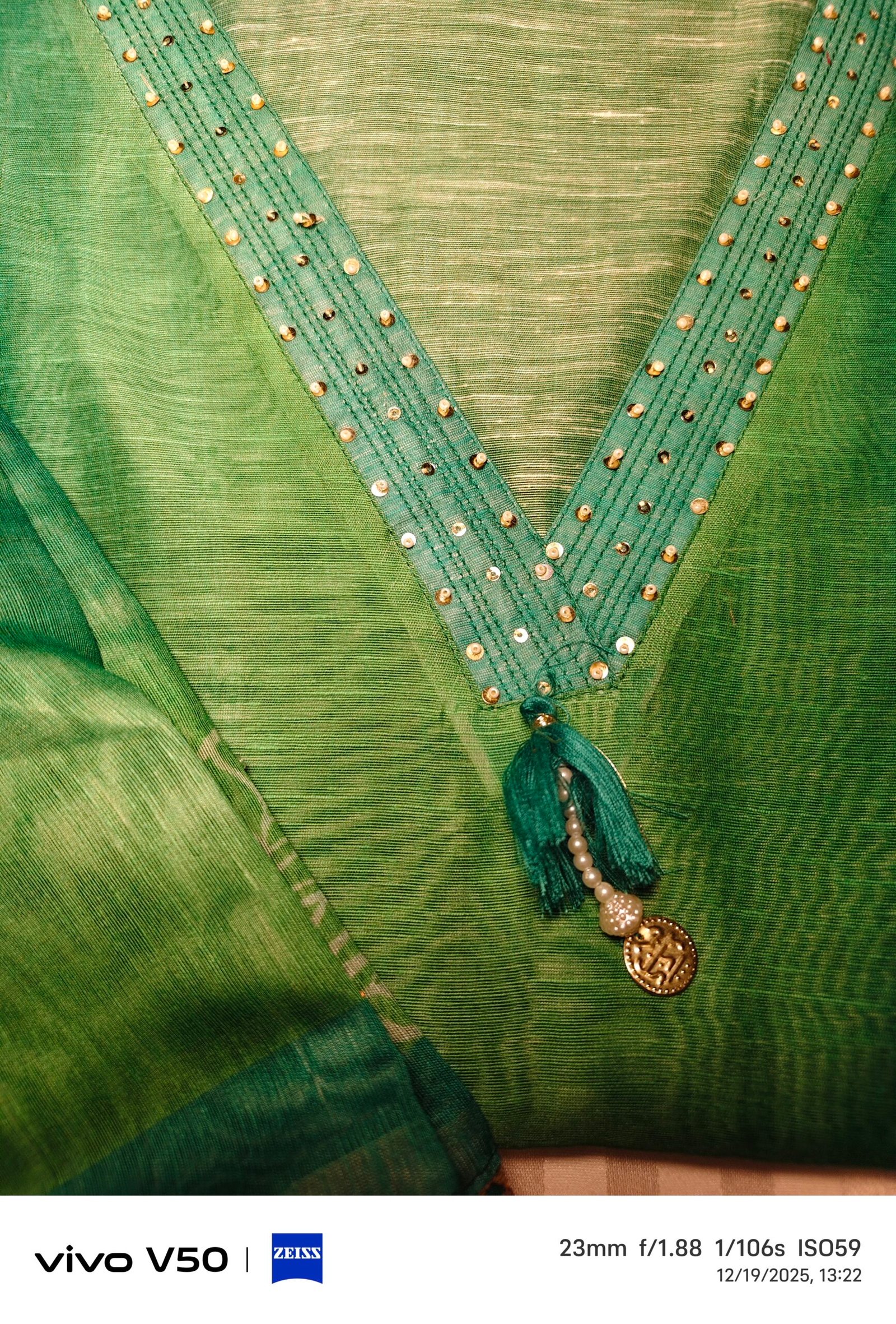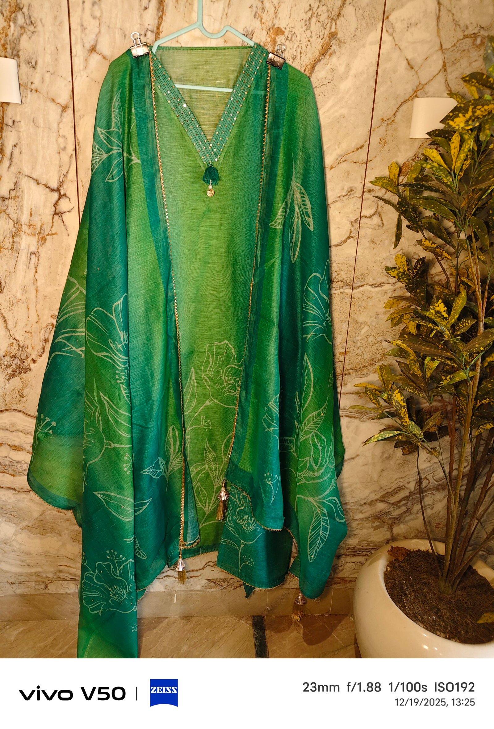 Maheshwari unstitched 3-piece suit featuring elegant sequin work on the kurta, with rich gotta patti detailing on the daaman and dupatta. Finished with beautiful tassels on the dupatta, this suit blends traditional craftsmanship with timeless elegance—perfect for special occasions.