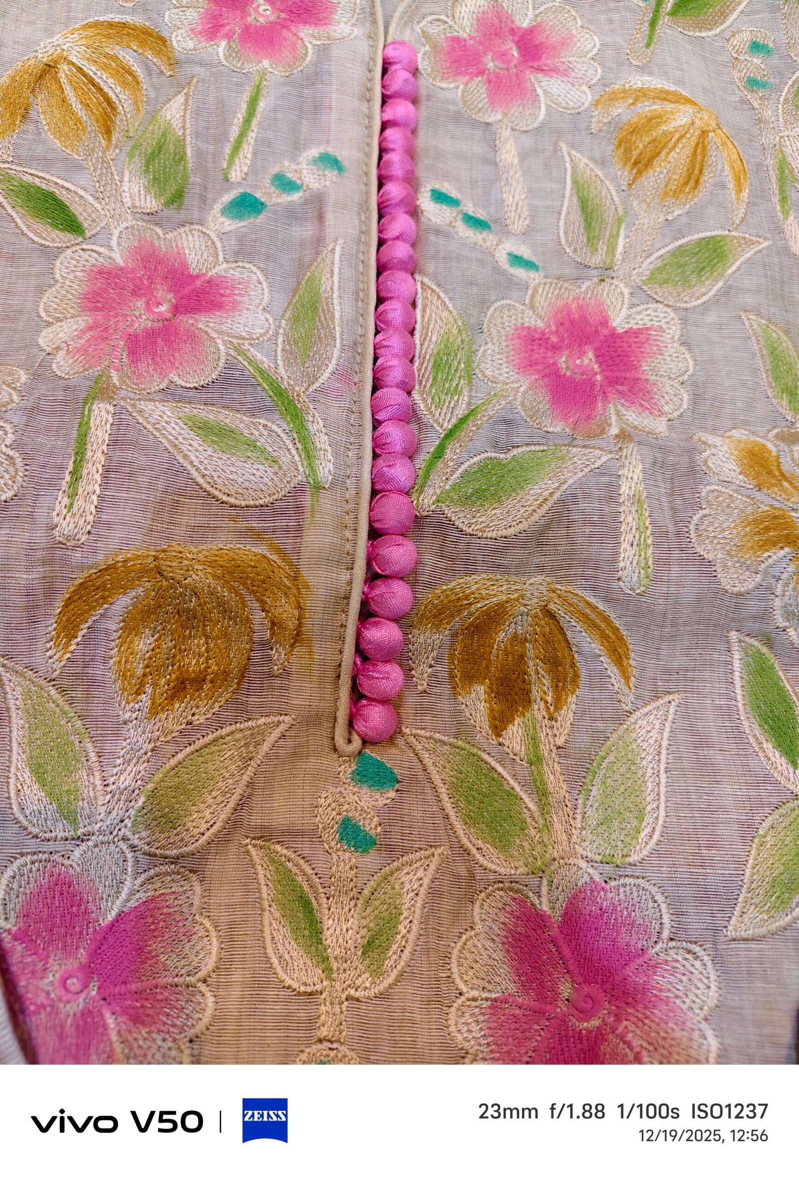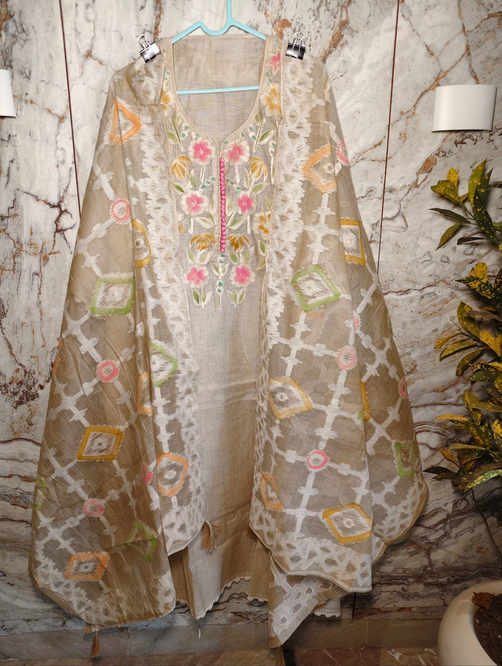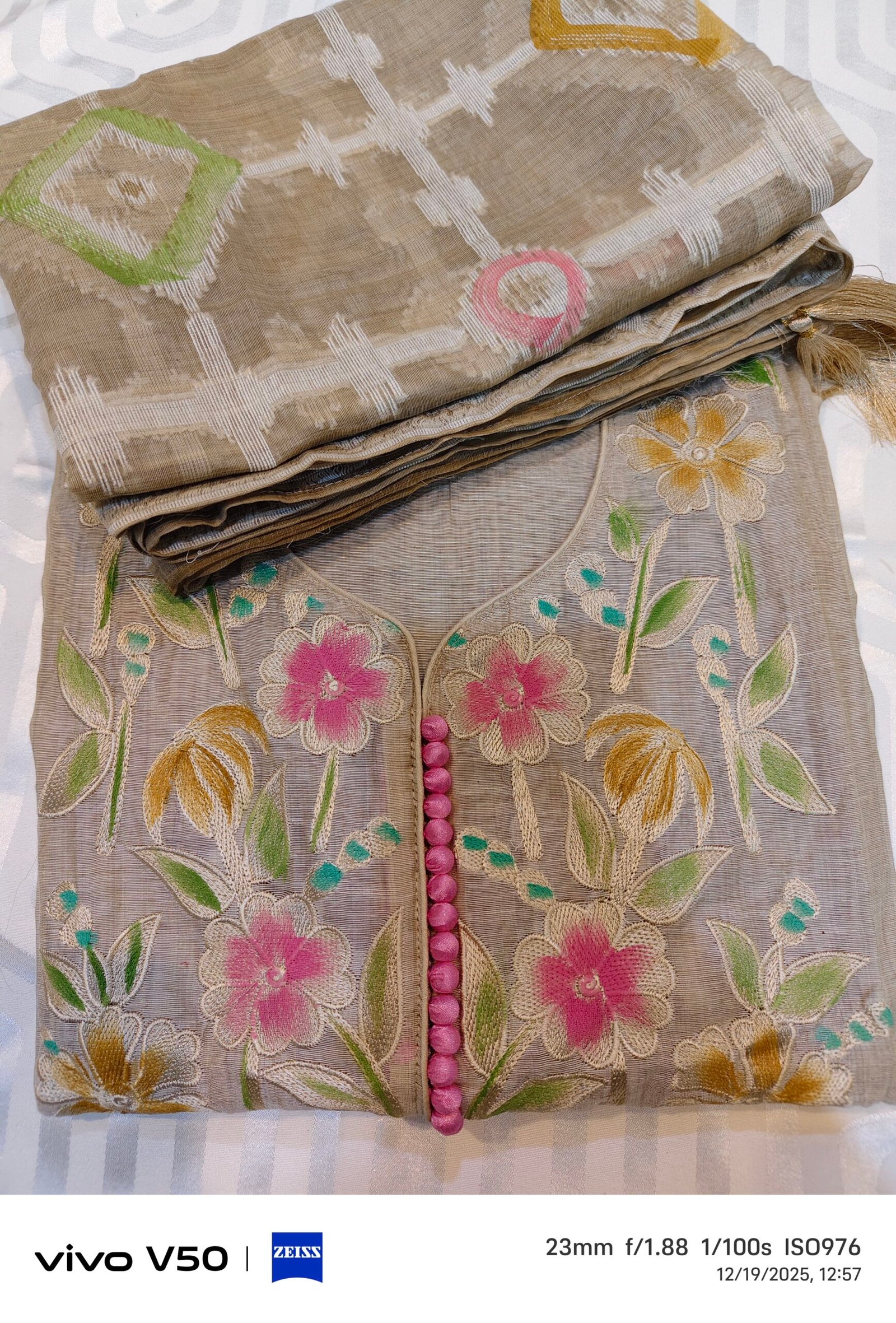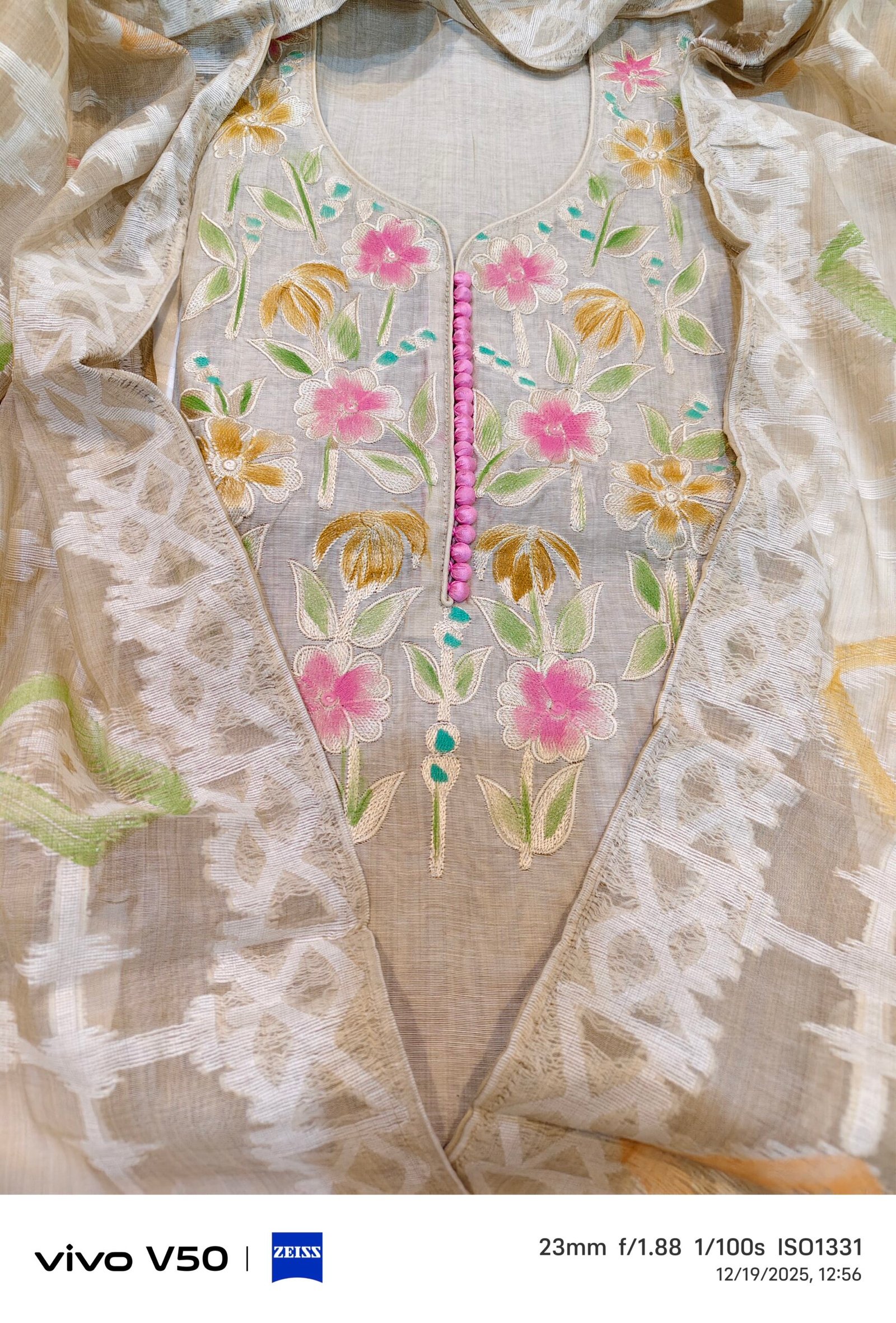 Maheshwari silk unstitched 3-piece suit featuring elegant  embroidery  with potli button work on the kurta. Finished with beautiful tassels on the  jaamdani dupatta, this suit blends traditional craftsmanship with timeless elegance—perfect for festive and special occasions.
