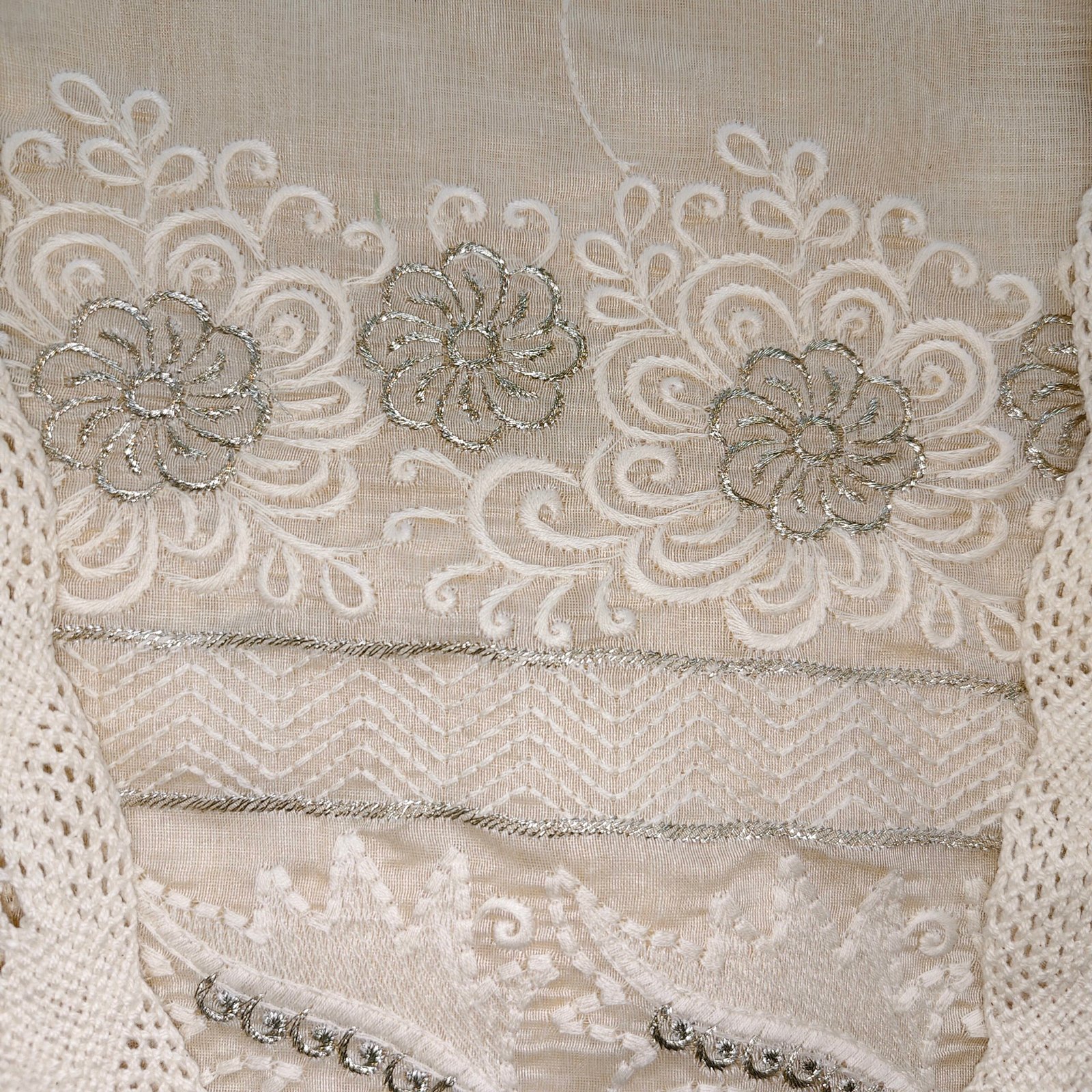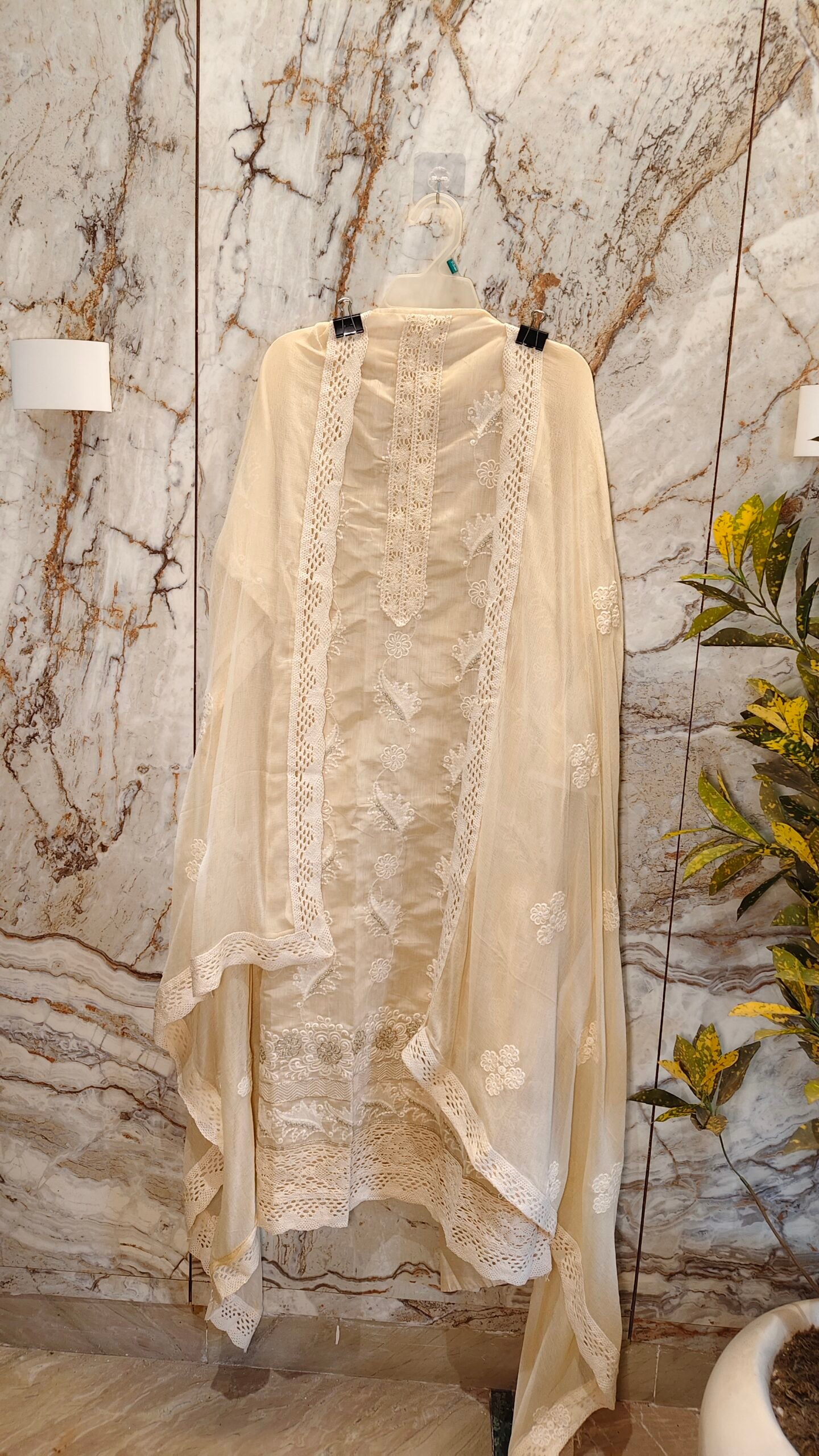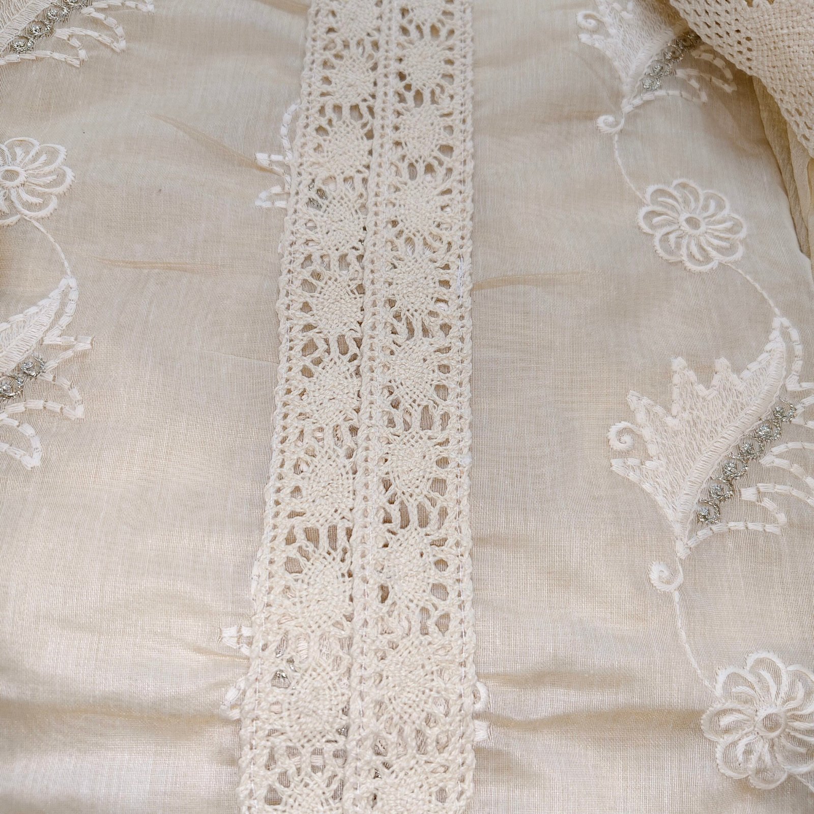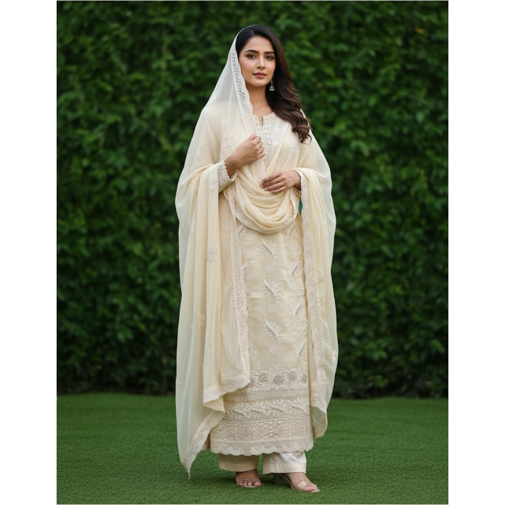 Slab cotton 3-piece suit with embroidery and lace on daaman with semi chiffon dupatta with laces and embroidery.