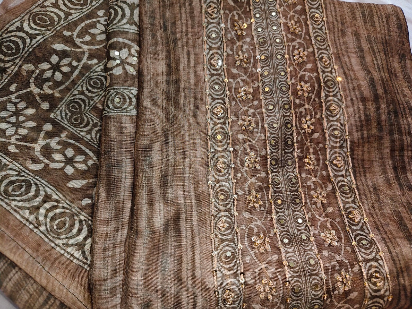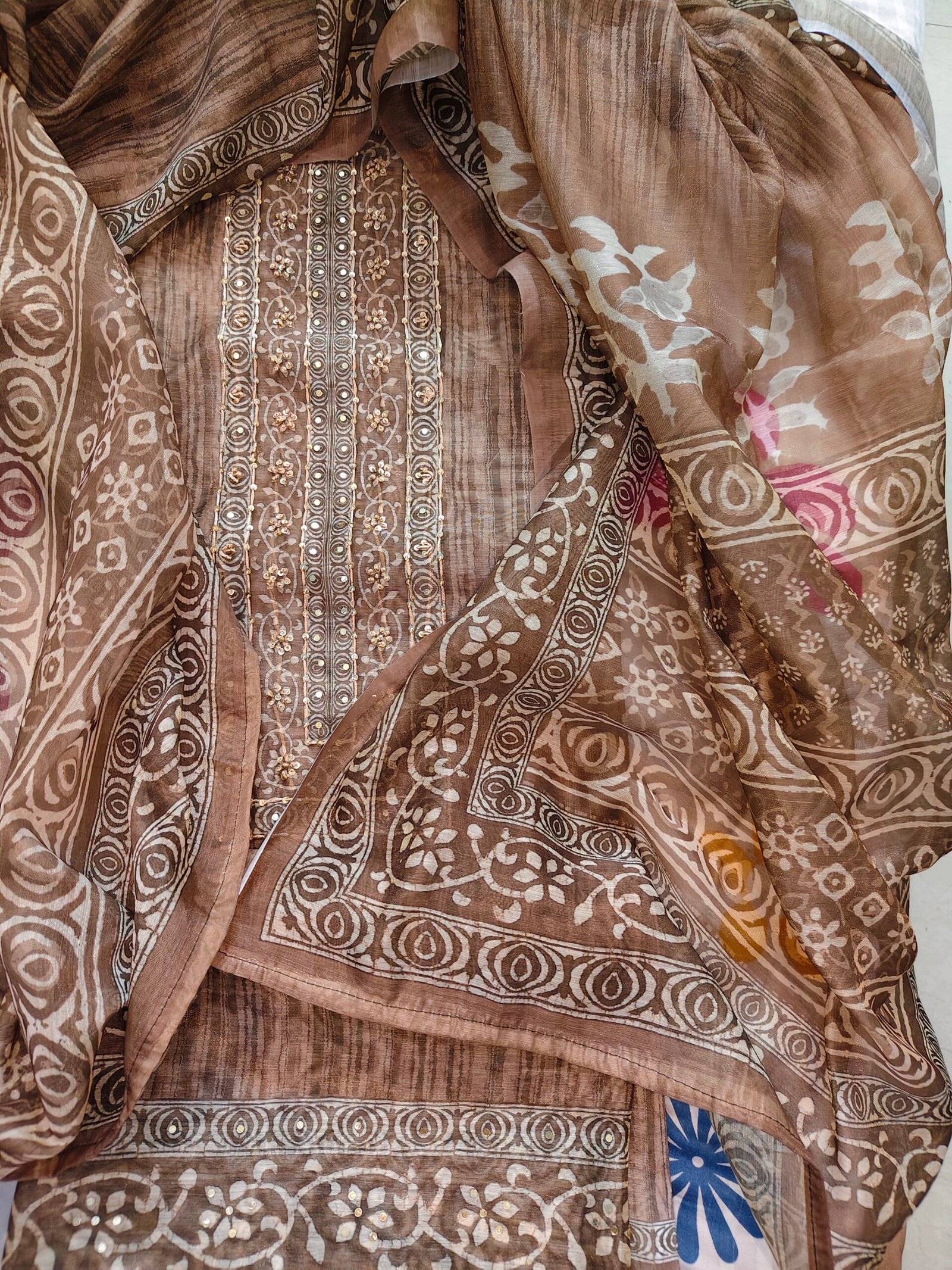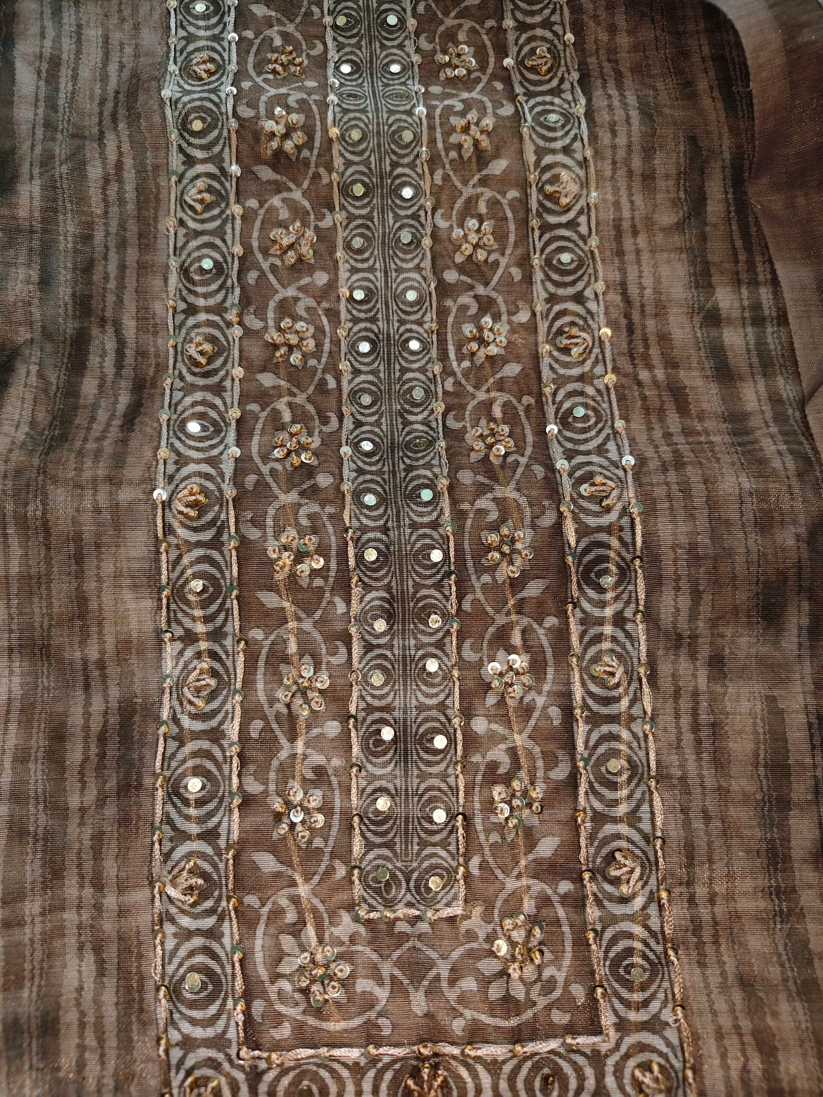 Mul chanderi 3 -piece suit with sequence and neemzari work on neckline and daaman.