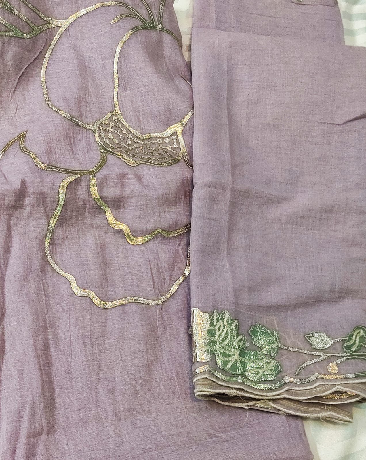 Mul chanderi 3 -piece suit with golden leather work on kurta and dupatta.