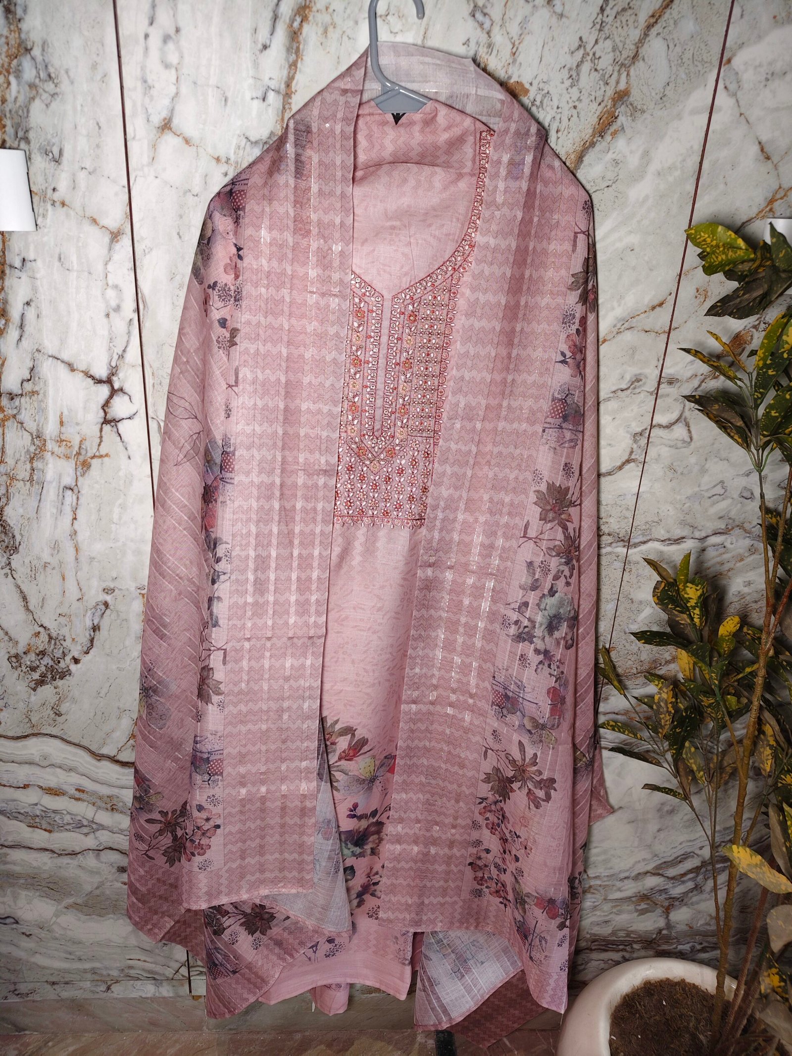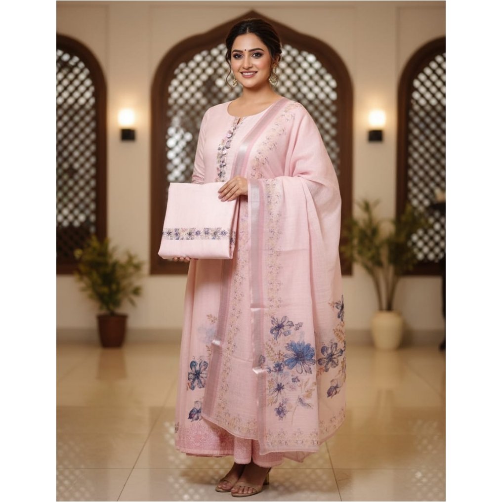 Pink linen cotton 3-piece suit with thread and sequence work on neckline and lace on daaman. Bottom fabric -Santoon (2.5 m)