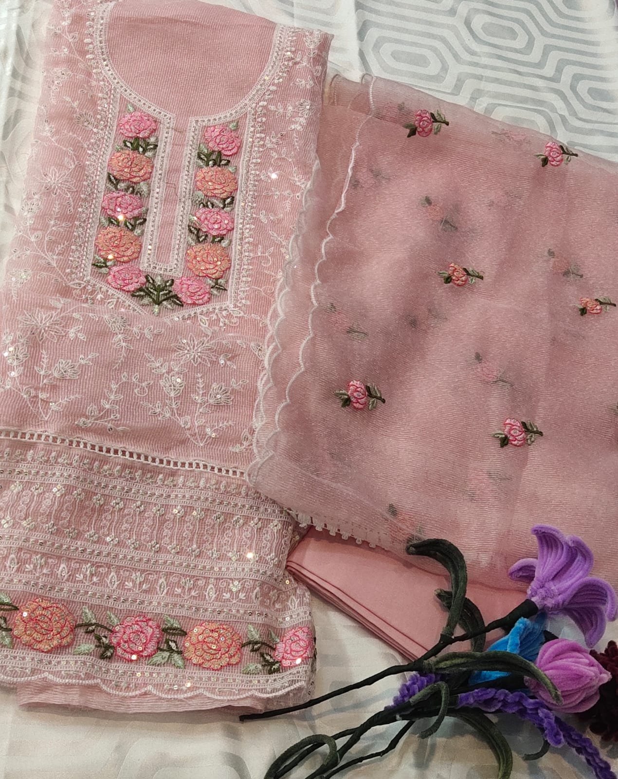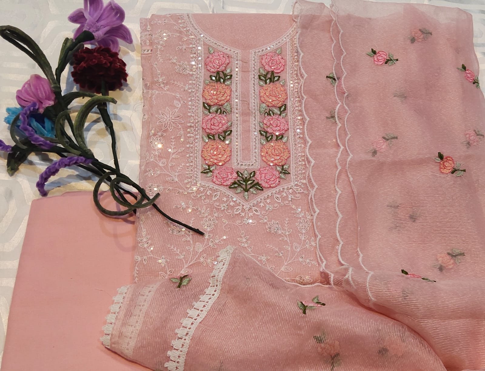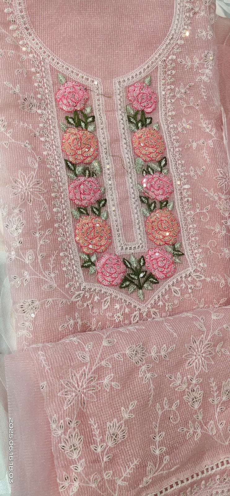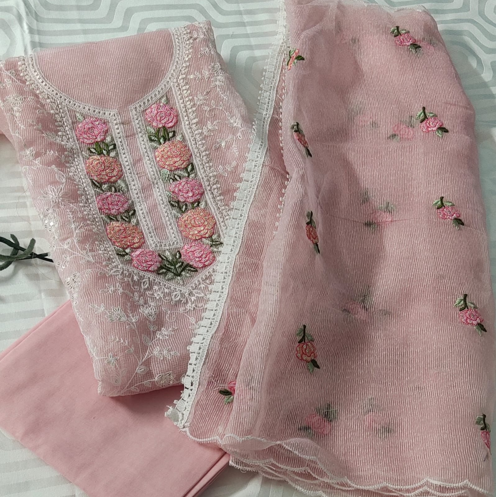Kota doria 3 -piece suit with embroidery all over suit and dupatta.