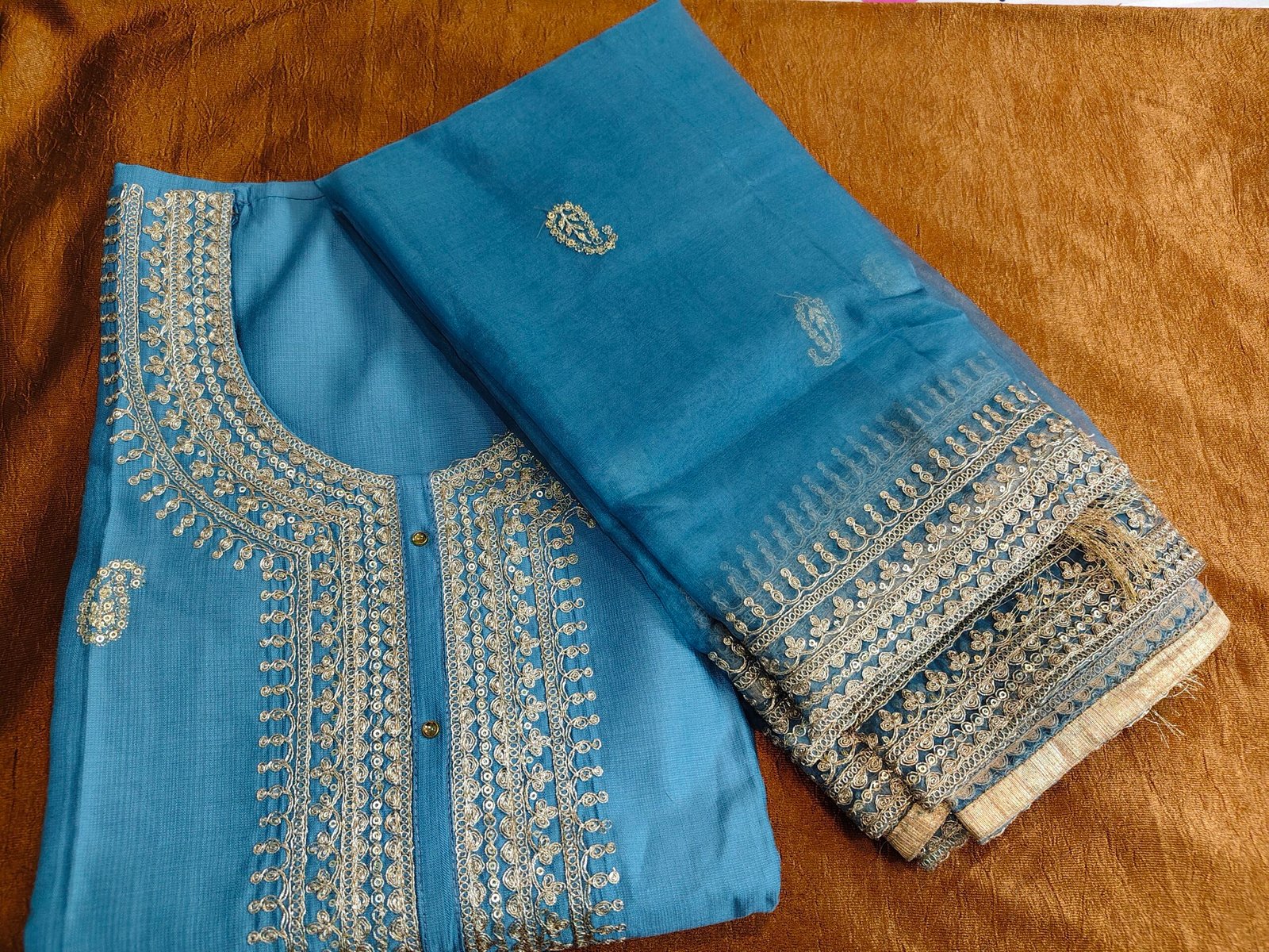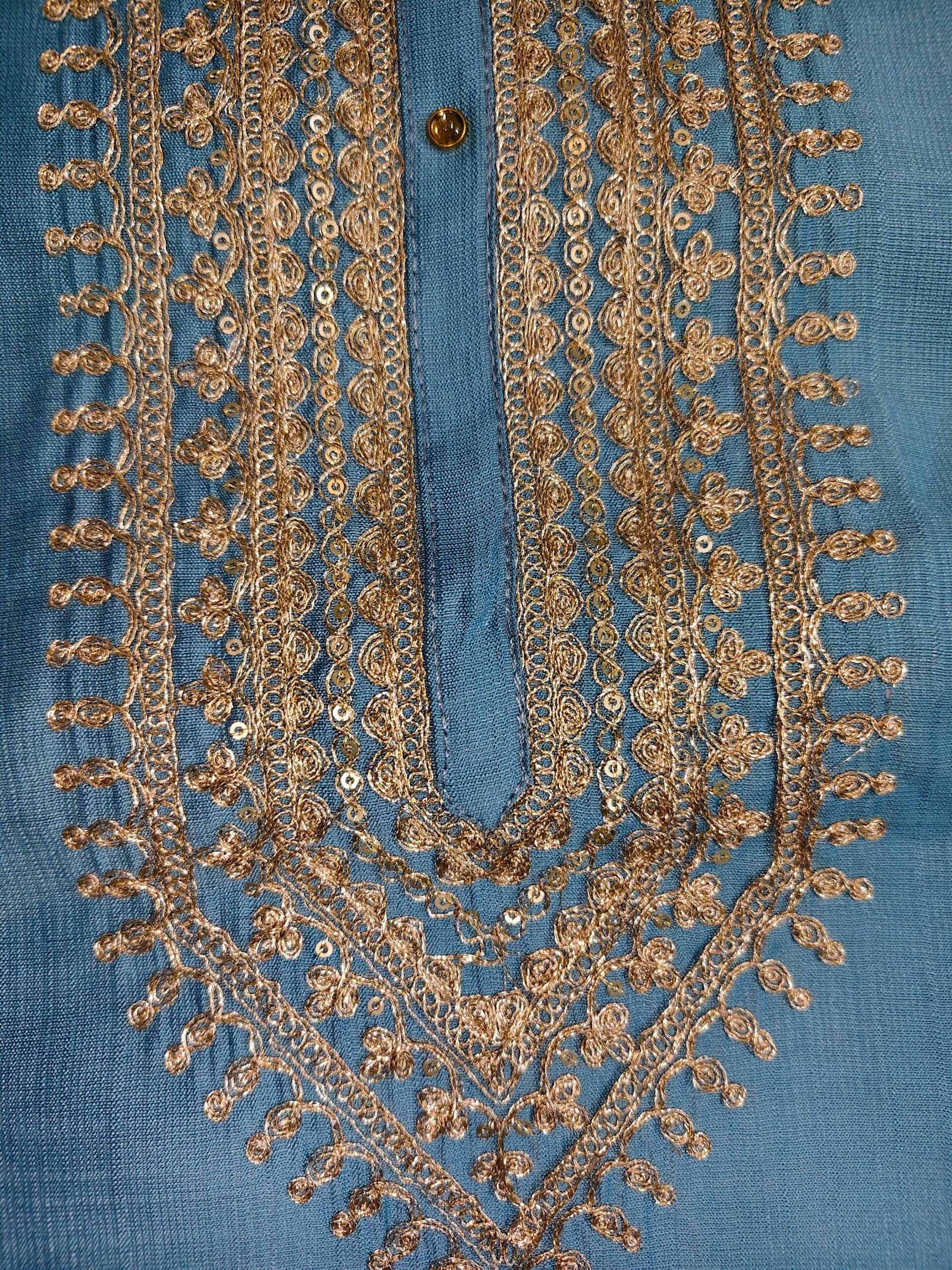 Cotton silk 3 -piece suit with embroidery on neckline, daaman and dupatta.