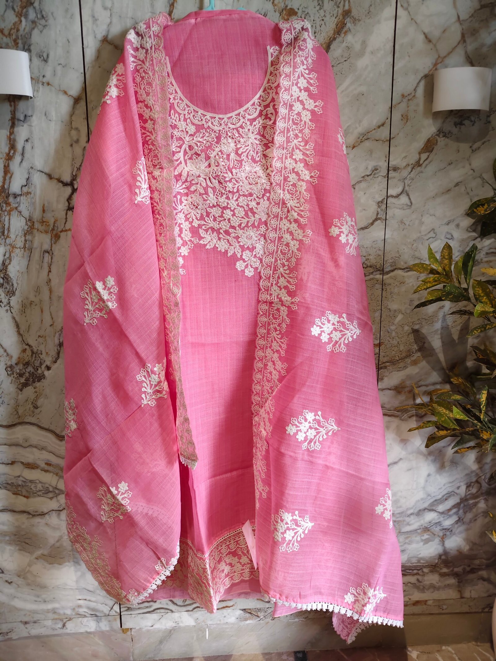 Kota Doriya 3 -piece unstitched suit with full embroidery all over kurta and dupatta with laces .
