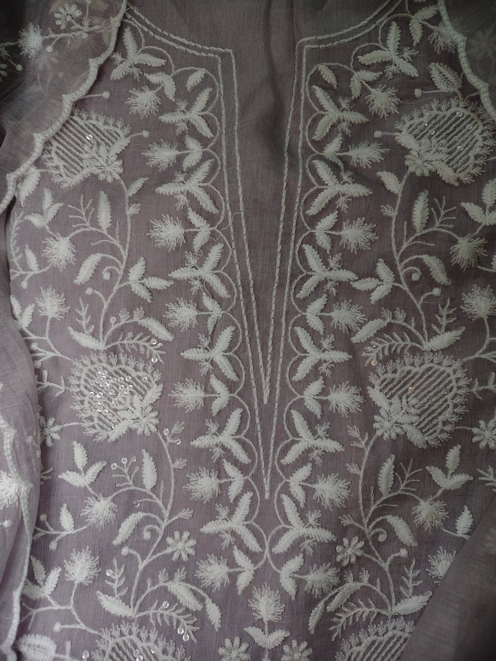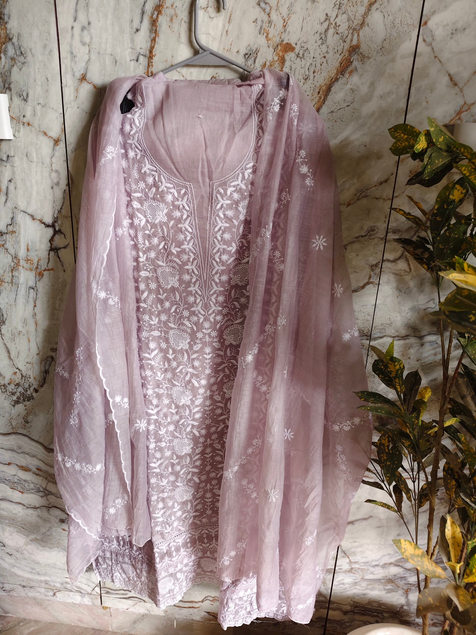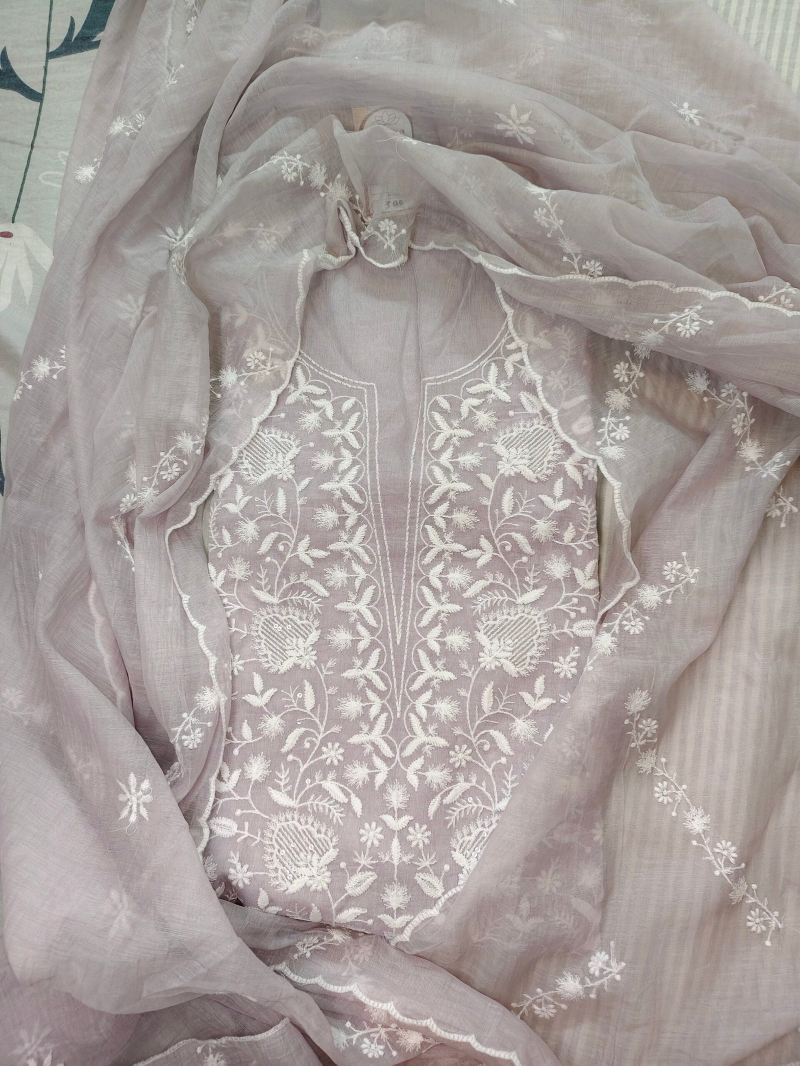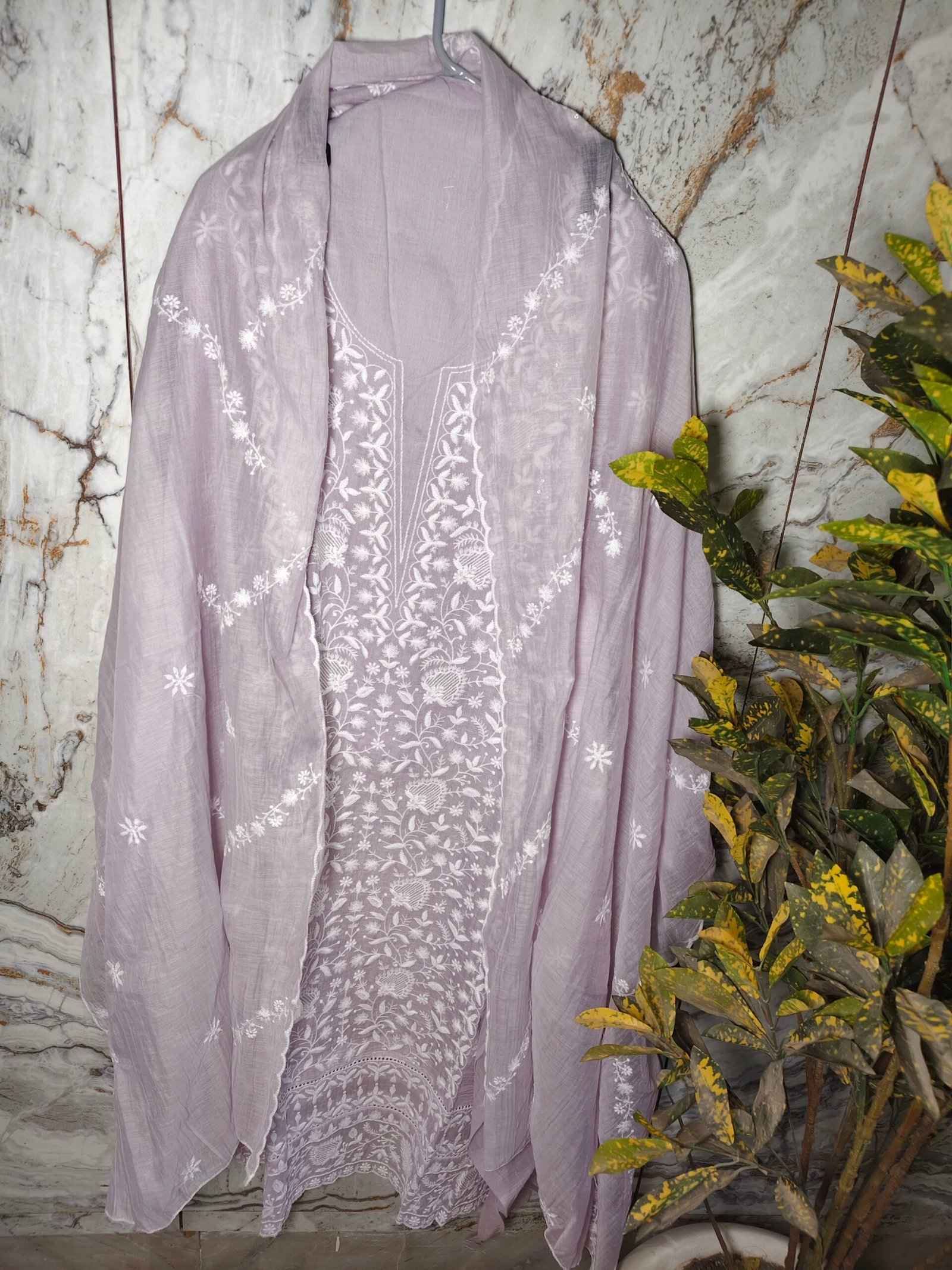 light purple pastel shade Pure mul cotton 3 -piece suit with beautiful heavy embroidery all over suit and dupatta.