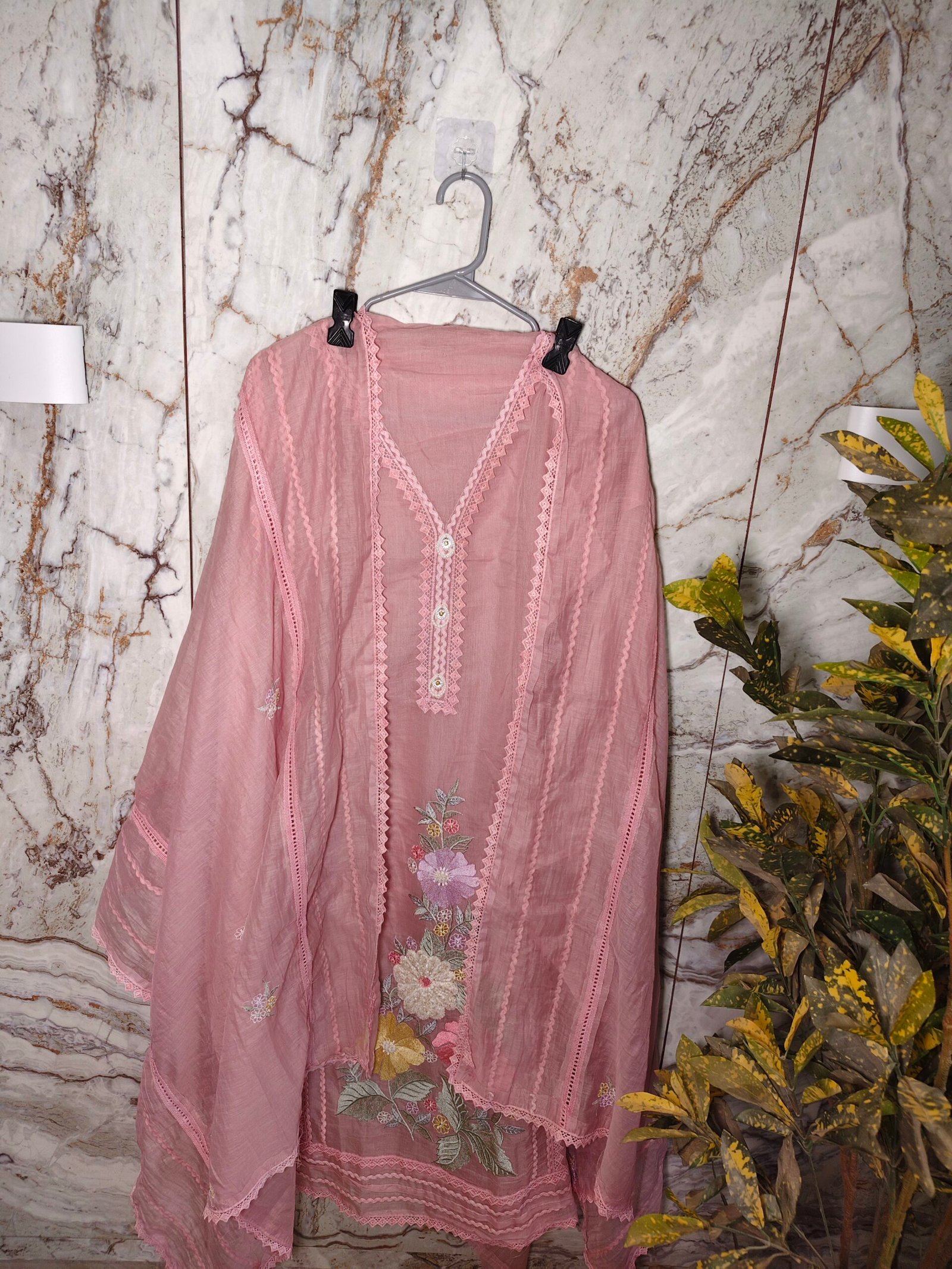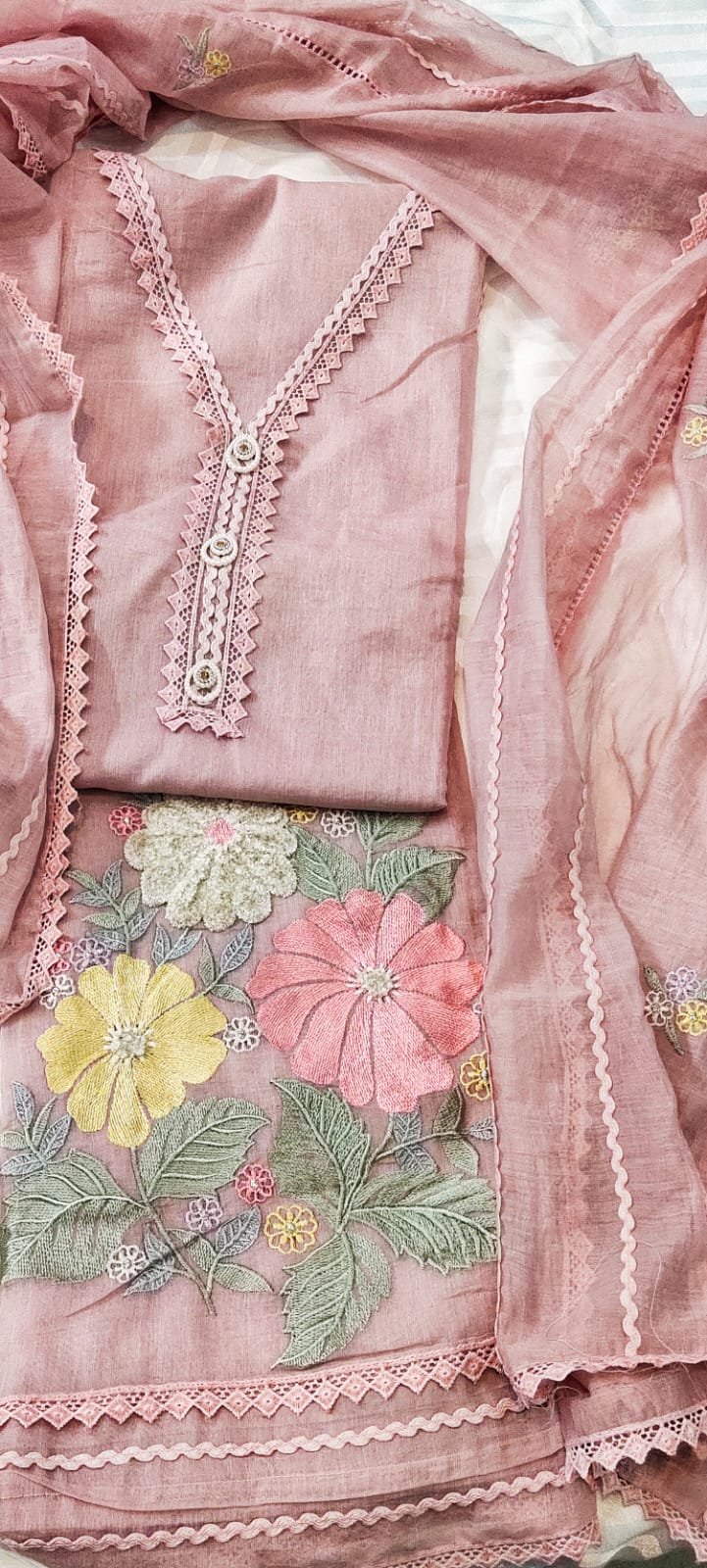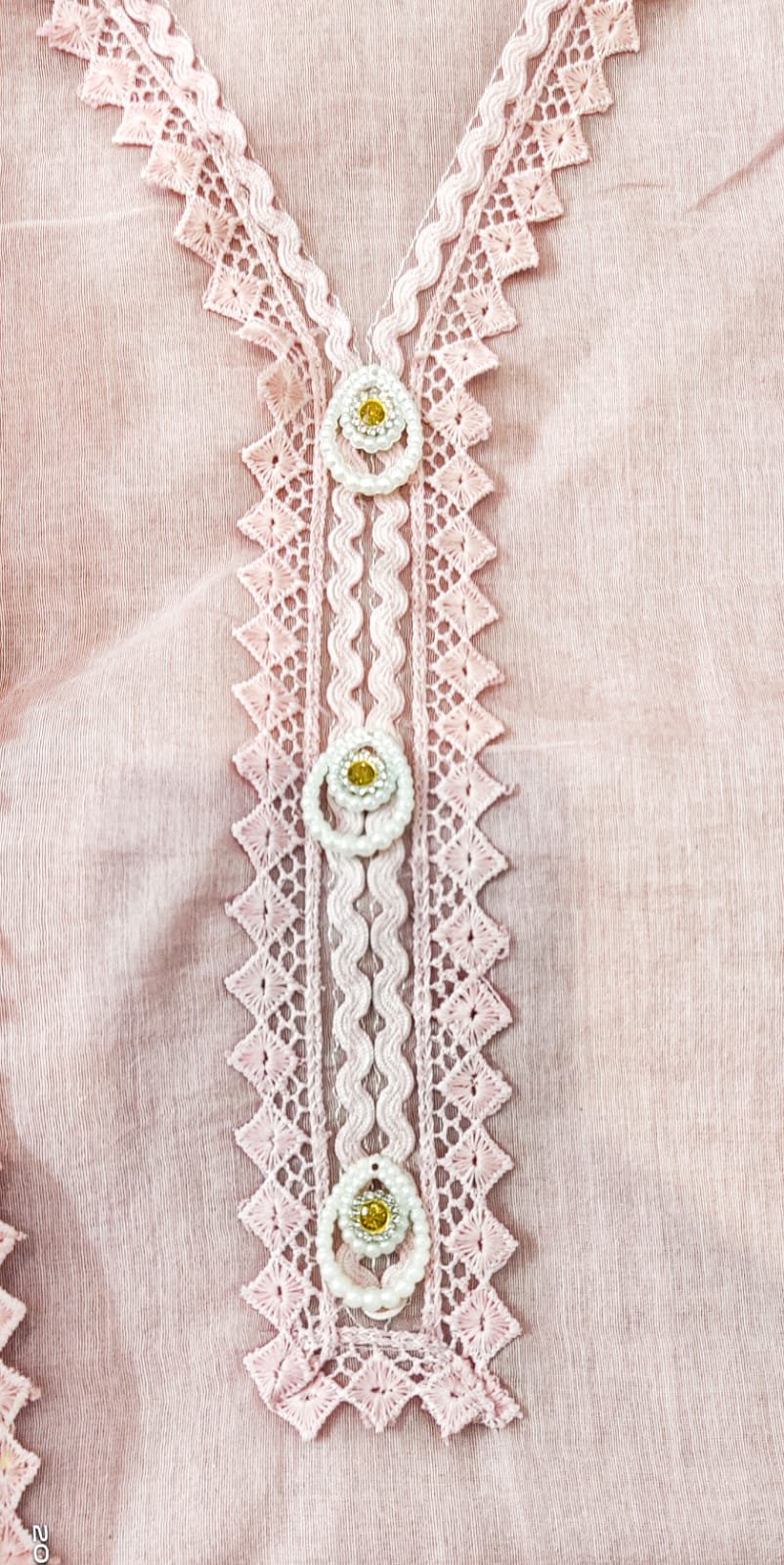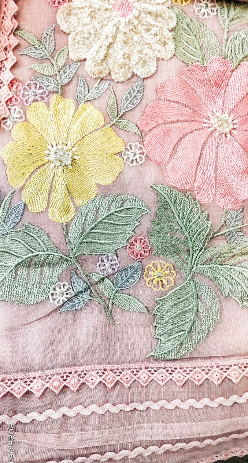 Mul cotton 3 -piece suit with embroidery on daaman and dupatta lace work on border of dupatta and neckline of kurta bottom -Santoon (2.5m)