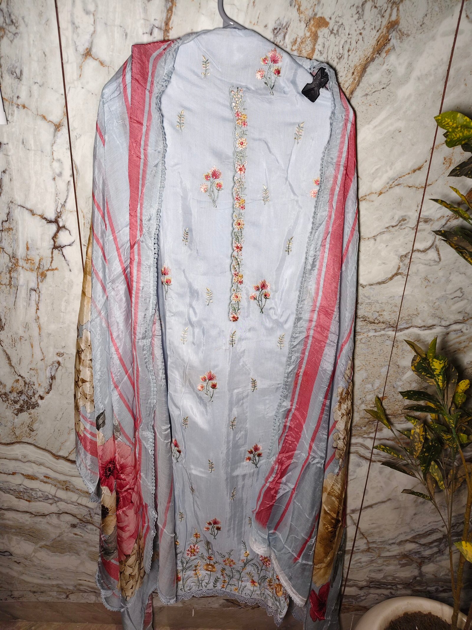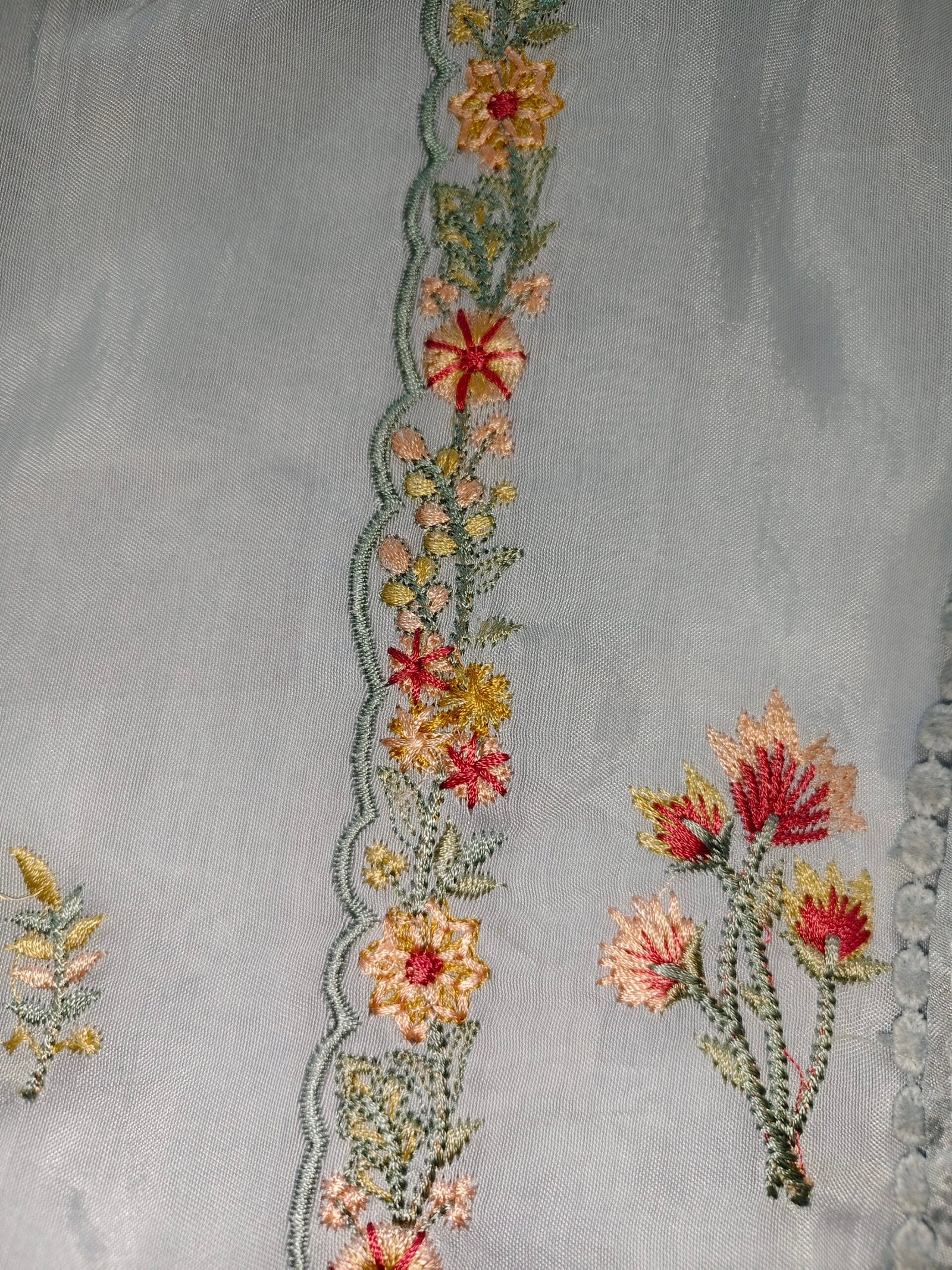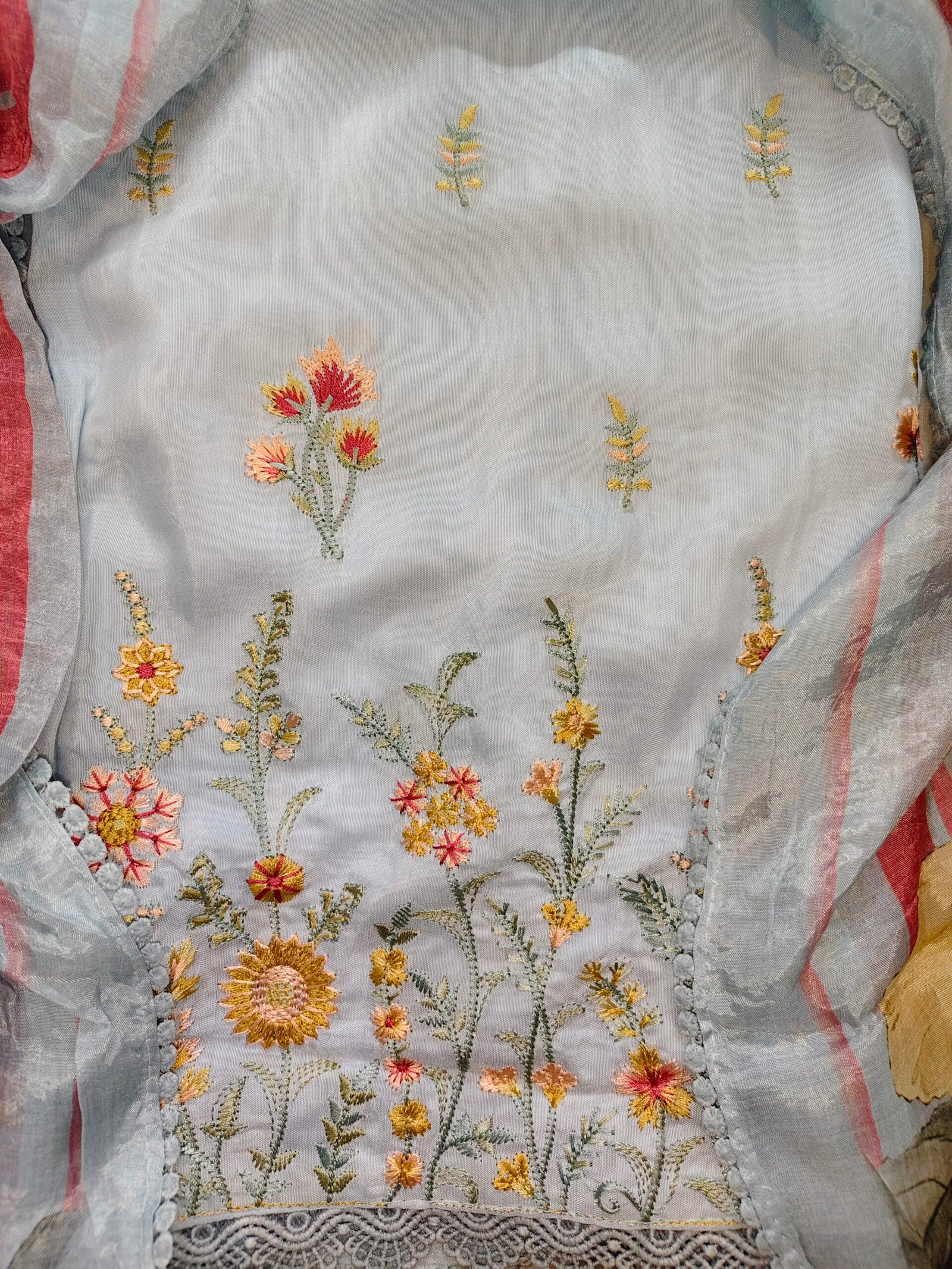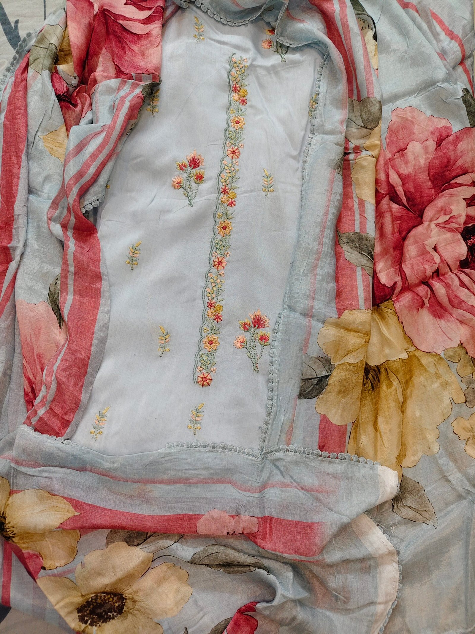 Light blue pastel shade,Muslin fabric 3-piece suit with embroidery on neckline and daaman.lace on border of dupatta daaman and sleeves. Bottom -Santoon (2.5m)