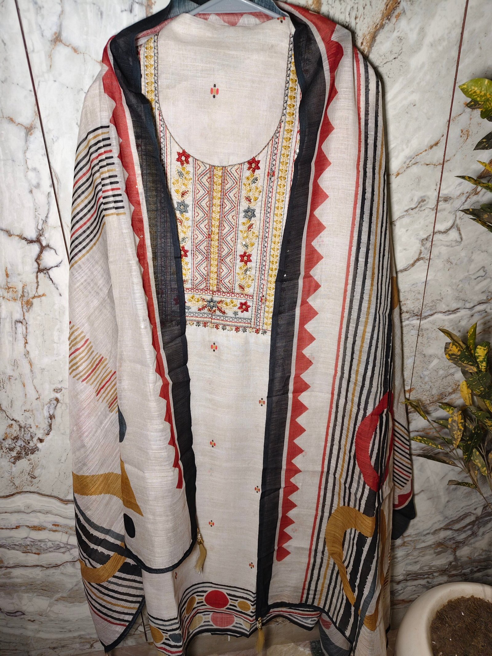 Linen cotton 3-piece suit with hand embroidery on neckline. Bottom -cotton (2.5m)