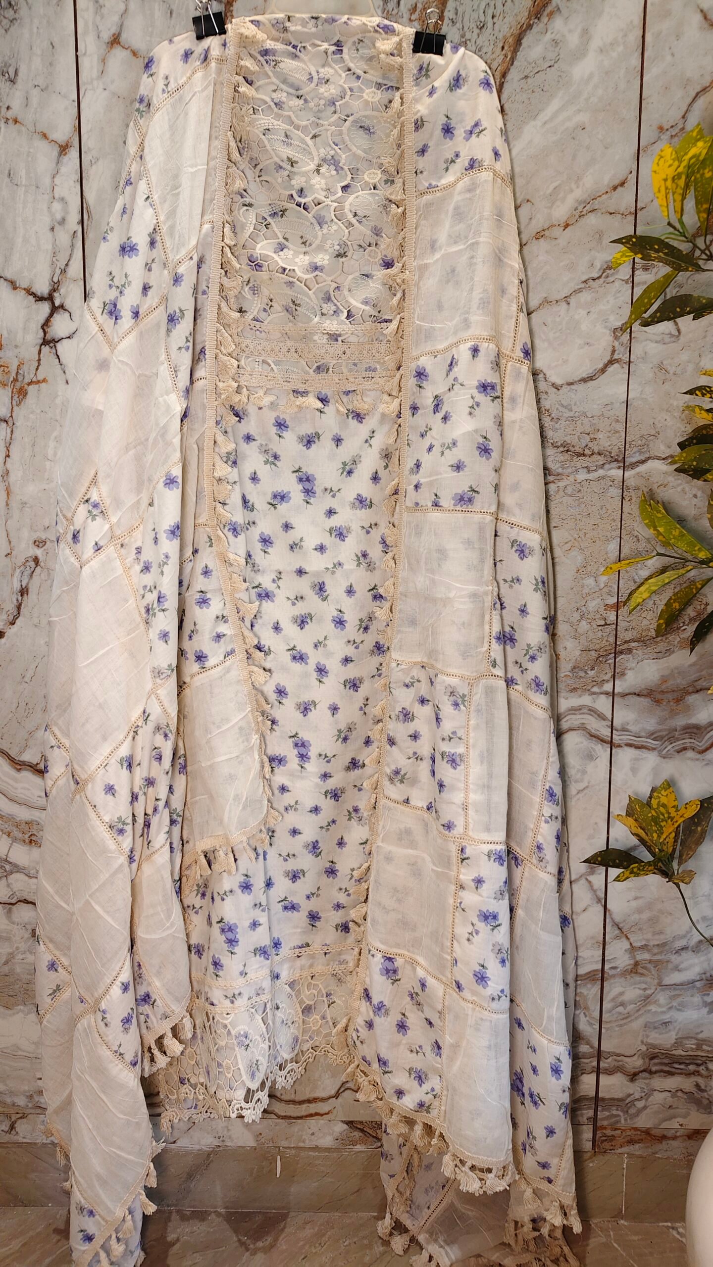 Cotton 3-piece suit with lace work on kurta and dupatta