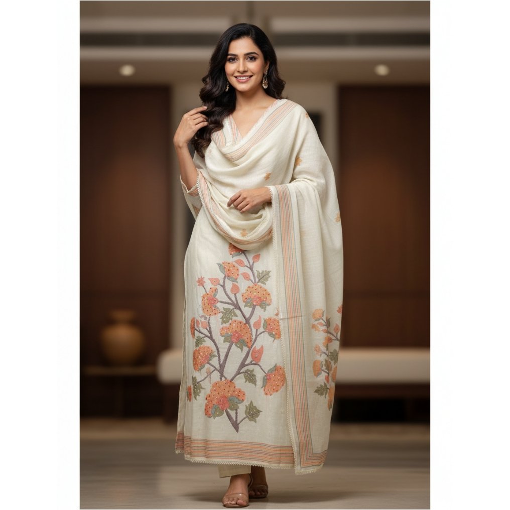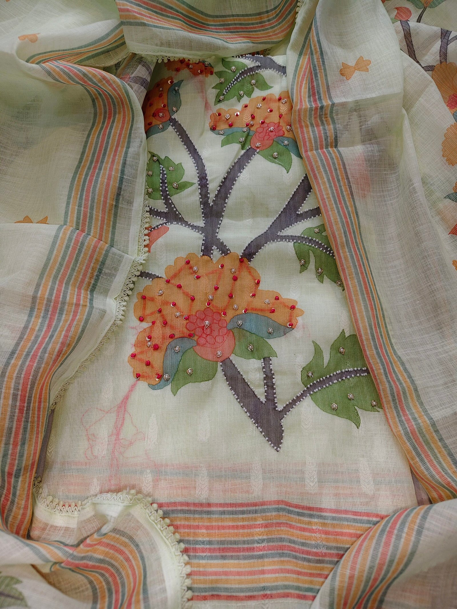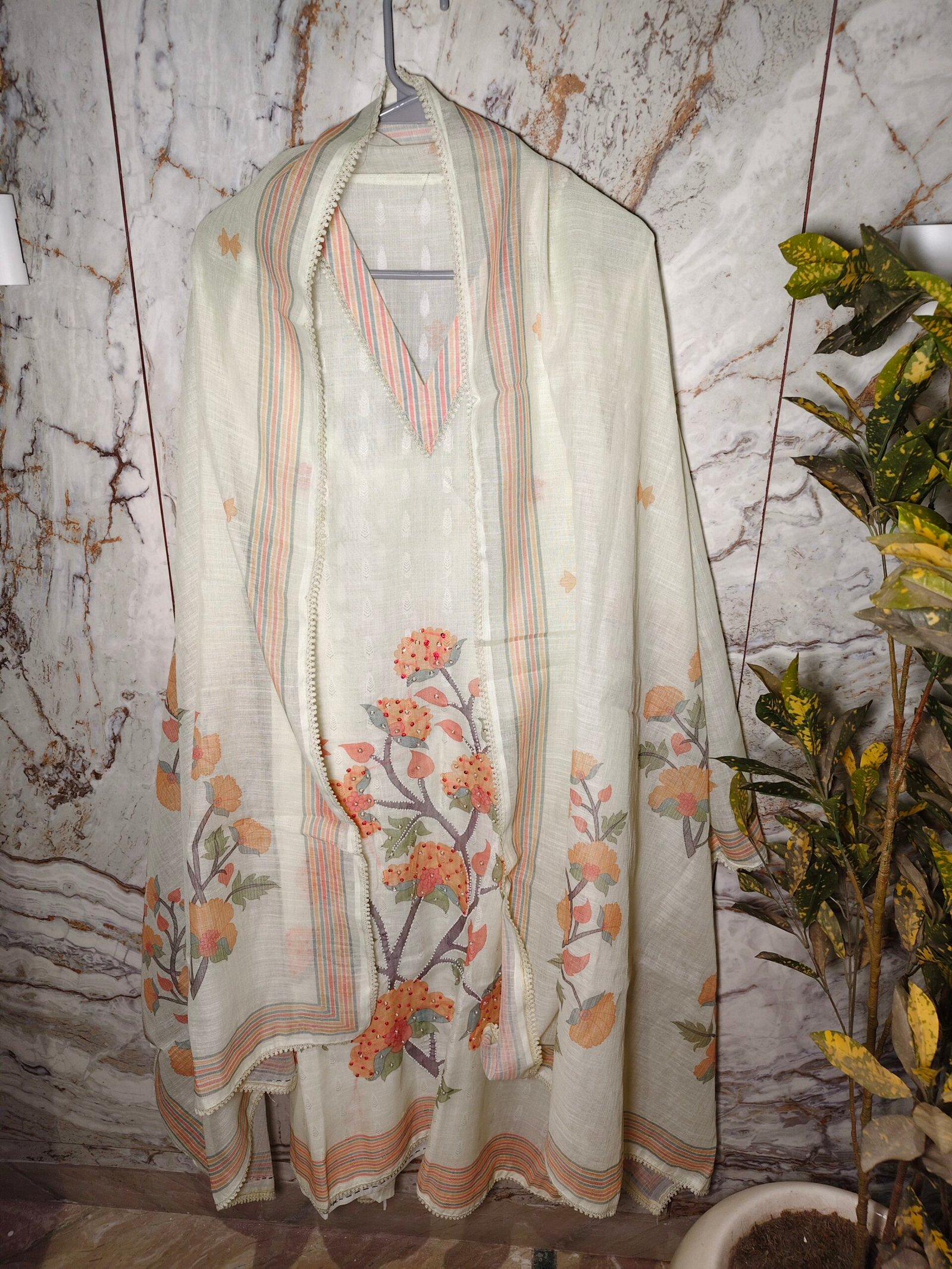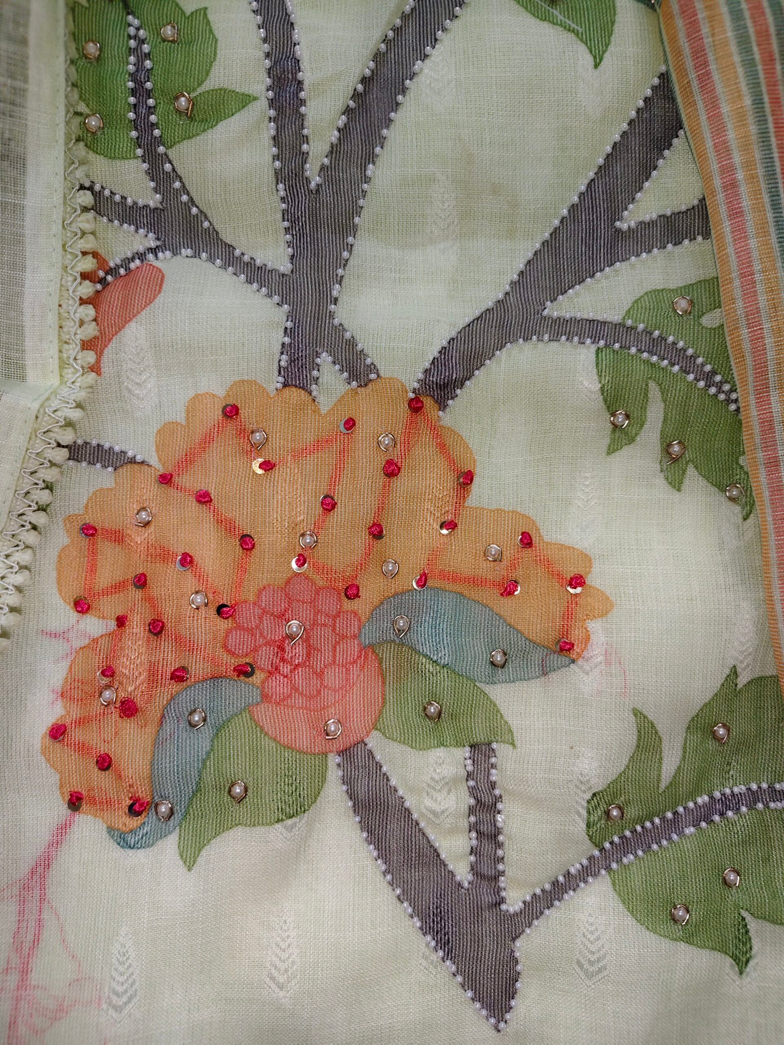 Linen cotton 3-piece suit with pearl work on daaman. Bottom -Santoon (2.5m)