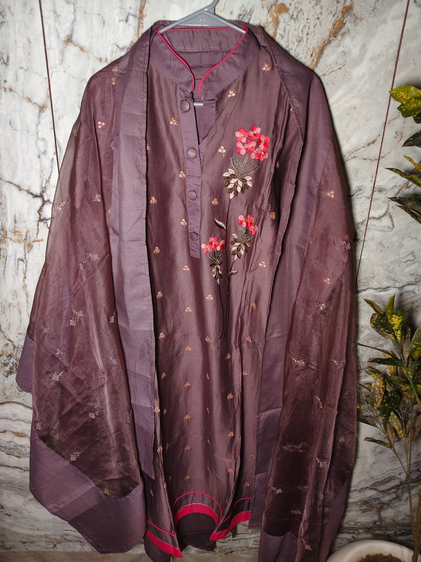 Onion shade Glace cotton 3-piece suit with embroidery on neckline . Dupatta -Organza with embroidery Bottom -cotton (2.5m)
