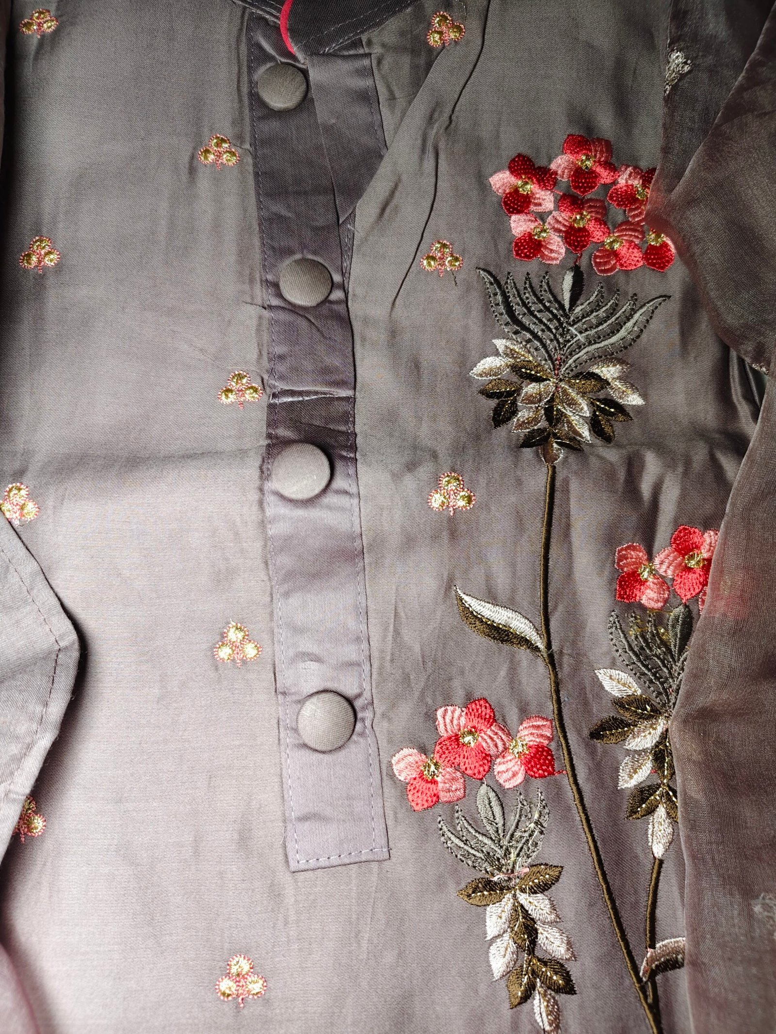 Onion shade Glace cotton 3-piece suit with embroidery on neckline .
