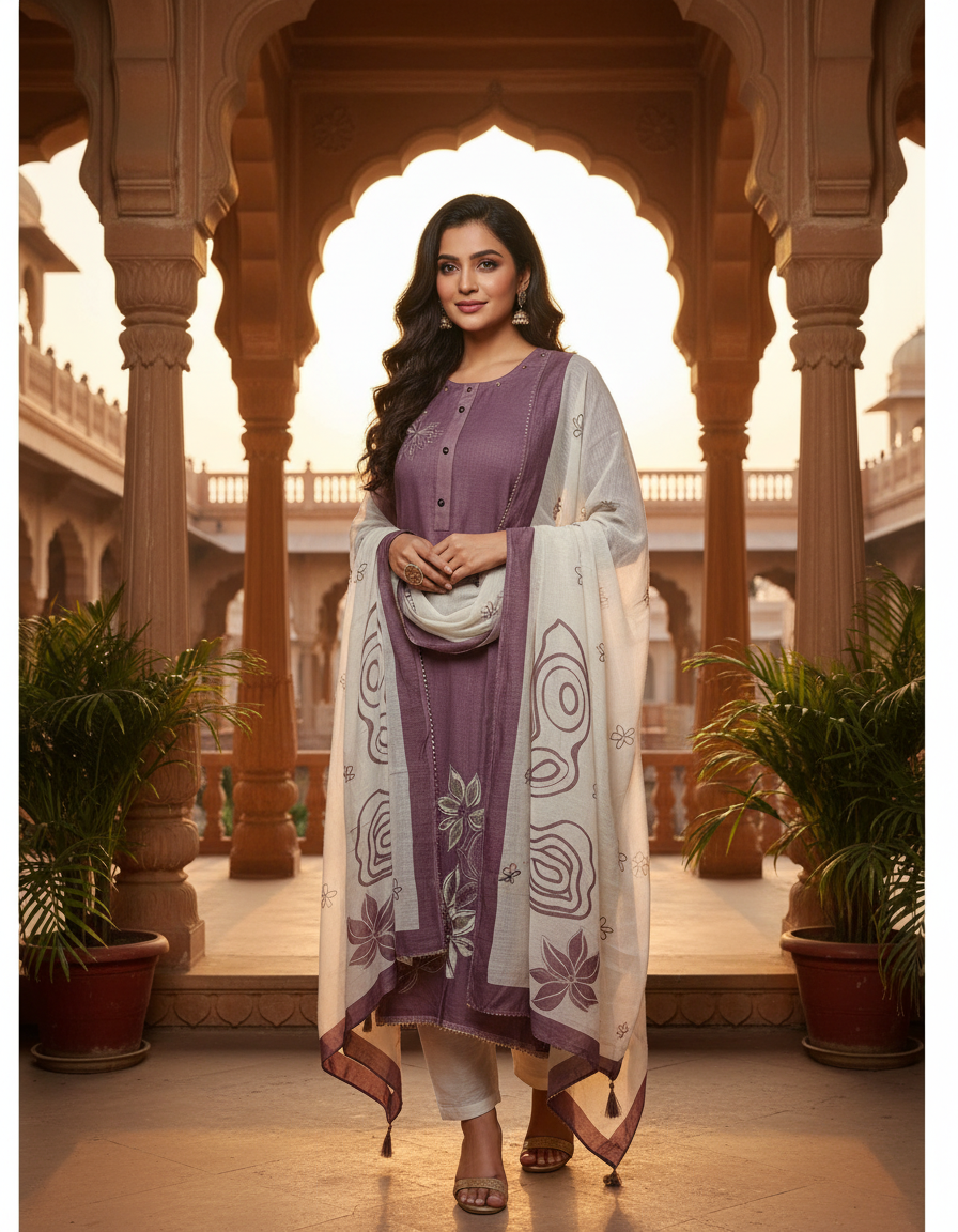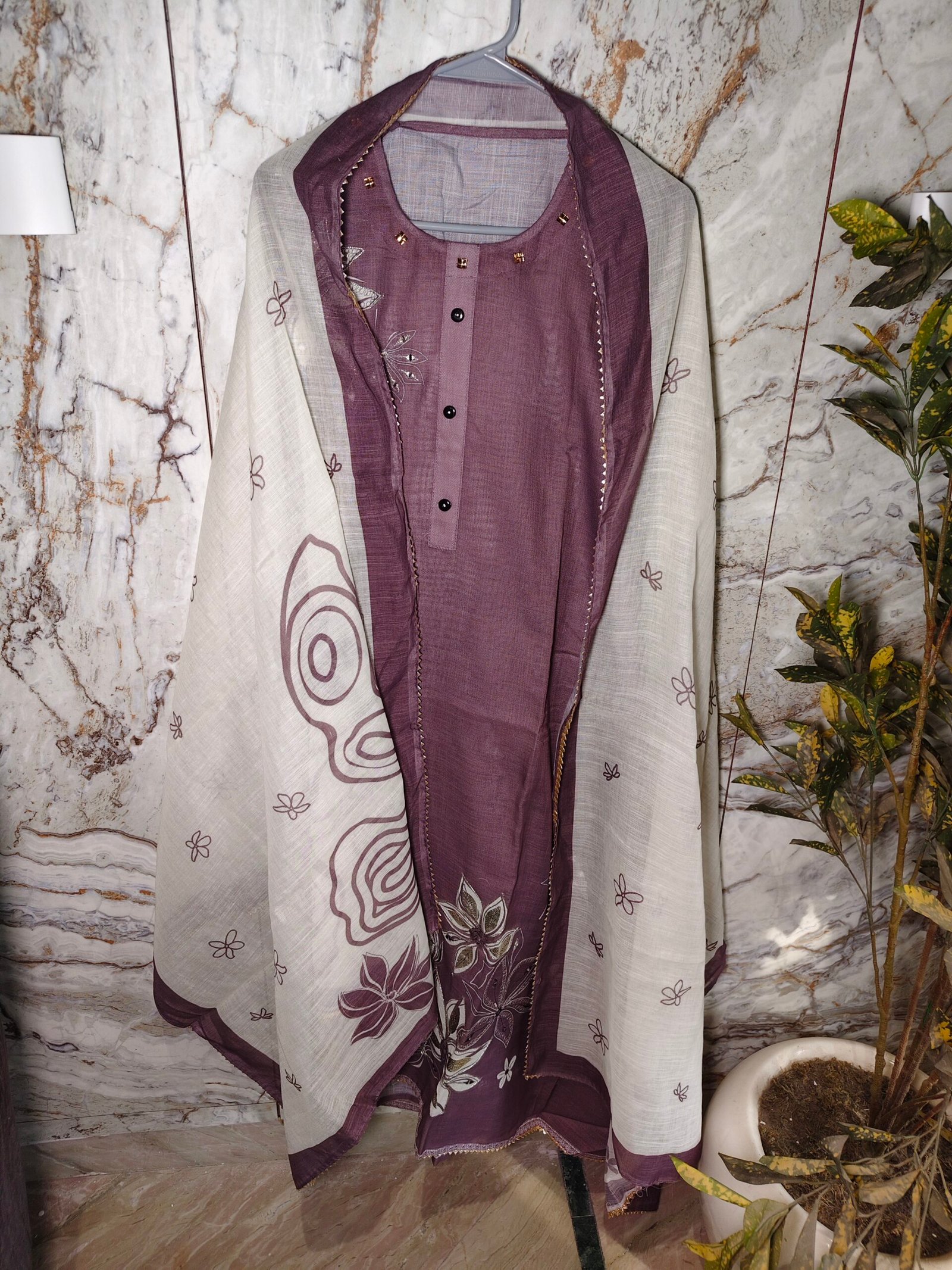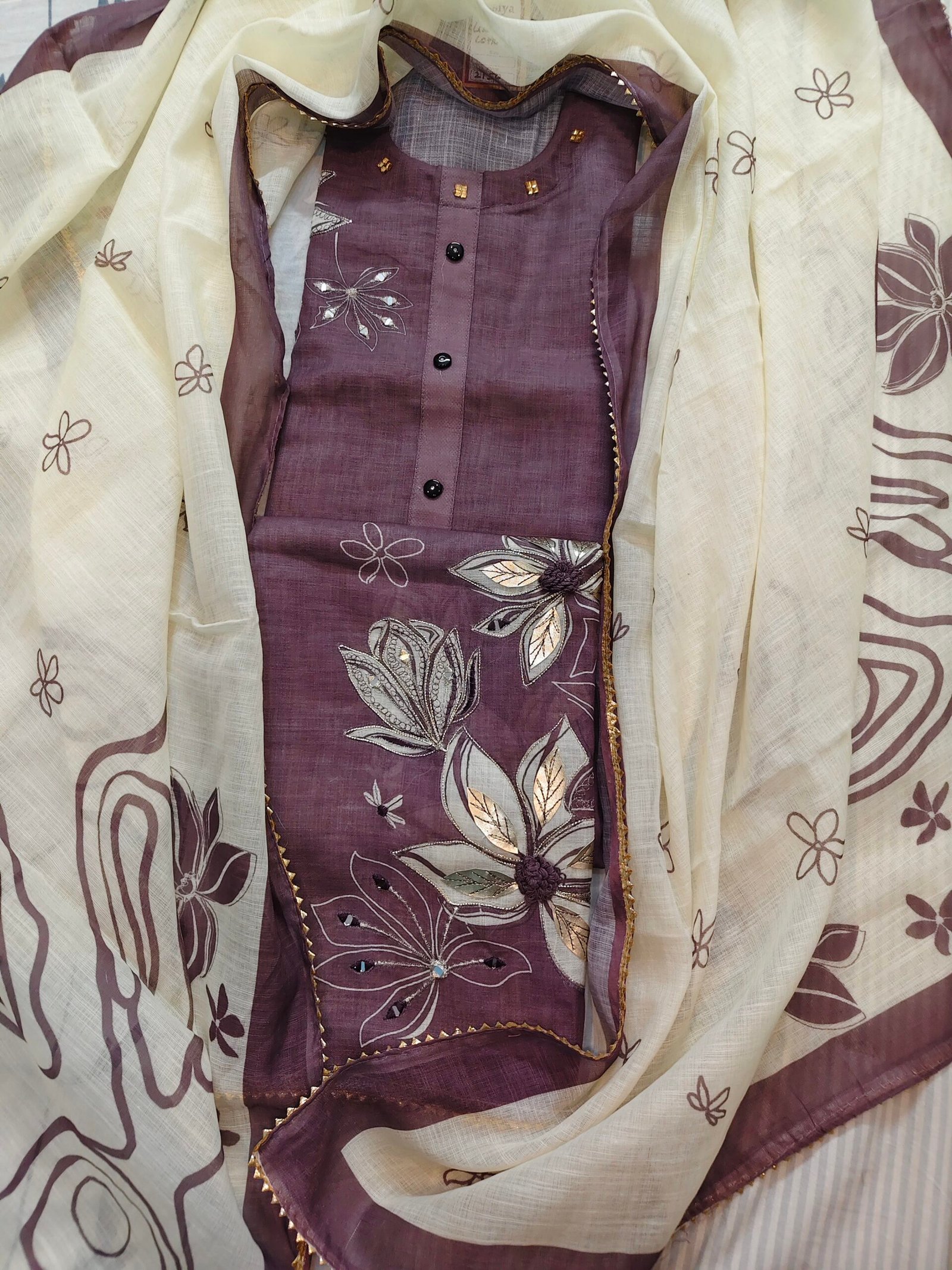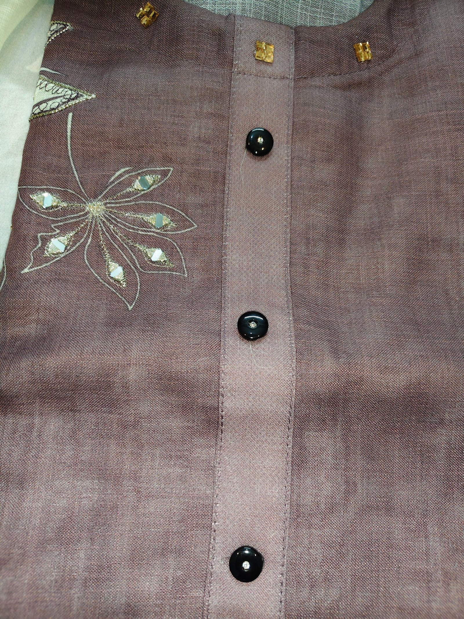 Linen cotton 3-piece suit with mirror and leather work all over kurta